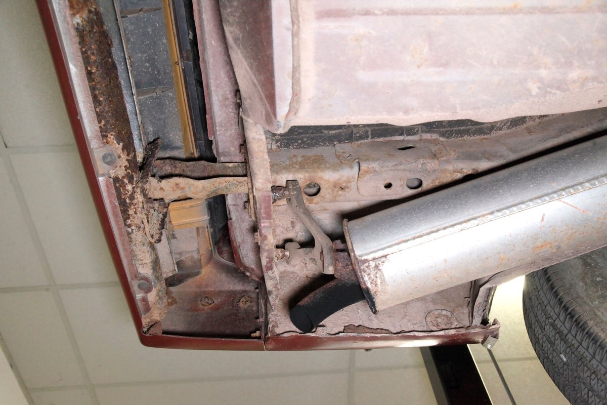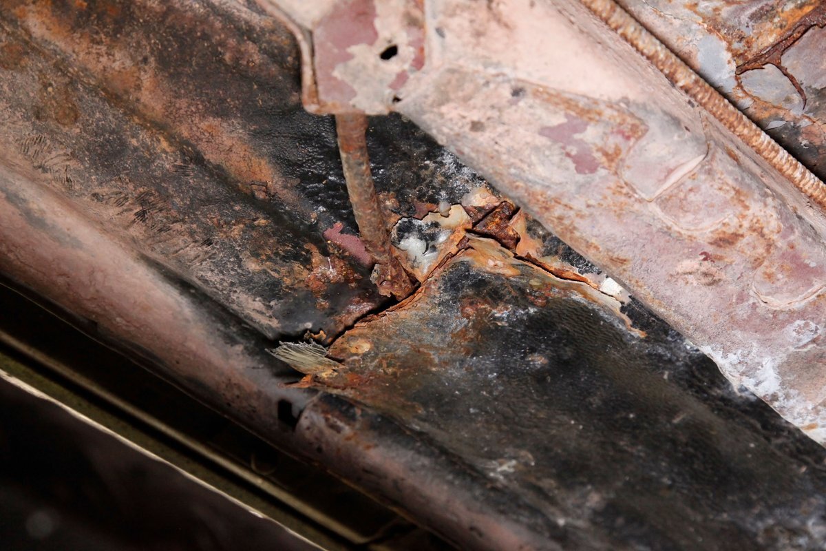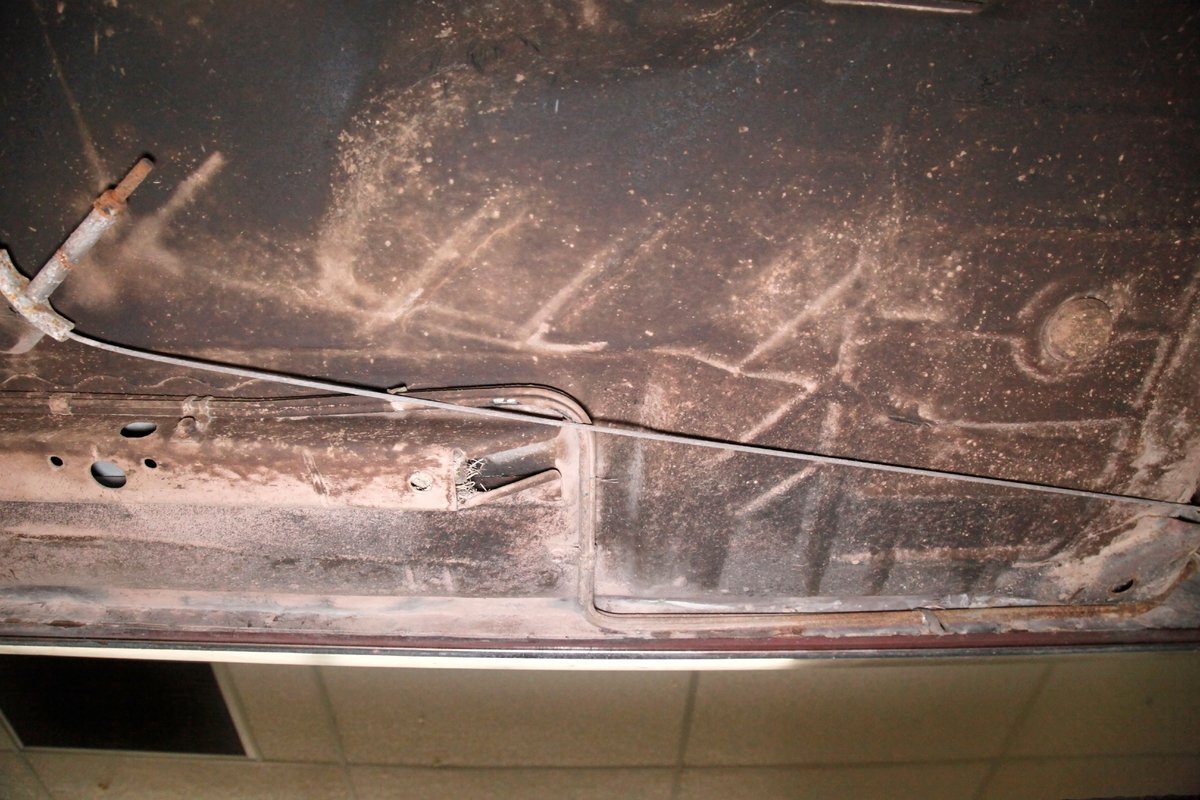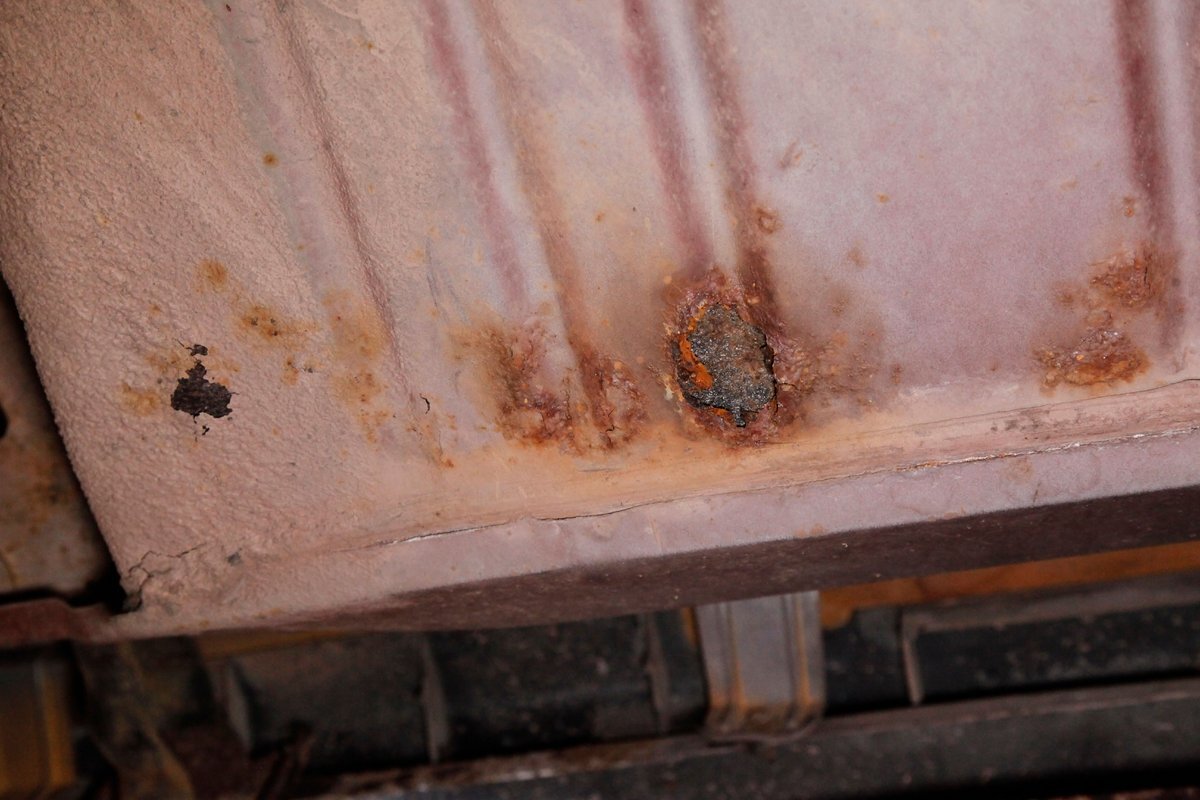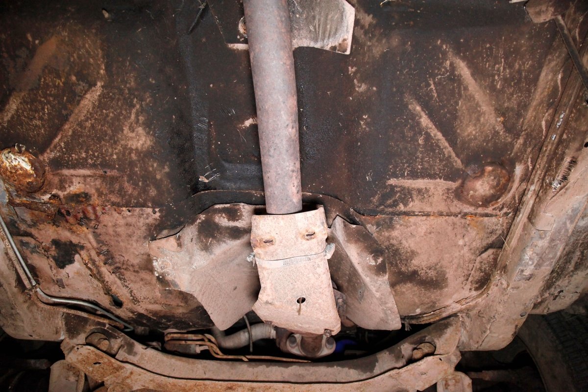 Plenty of aged patina, and some surface rust cover all the undercarriage surfaces. Heavy surface rust is on springs, gas tank and brake housings as well as suspension parts. Speaking of which includes independent Macpherson struts for the front, and coil springs for the back. Power disc braking is on front, and power drums are on the back.