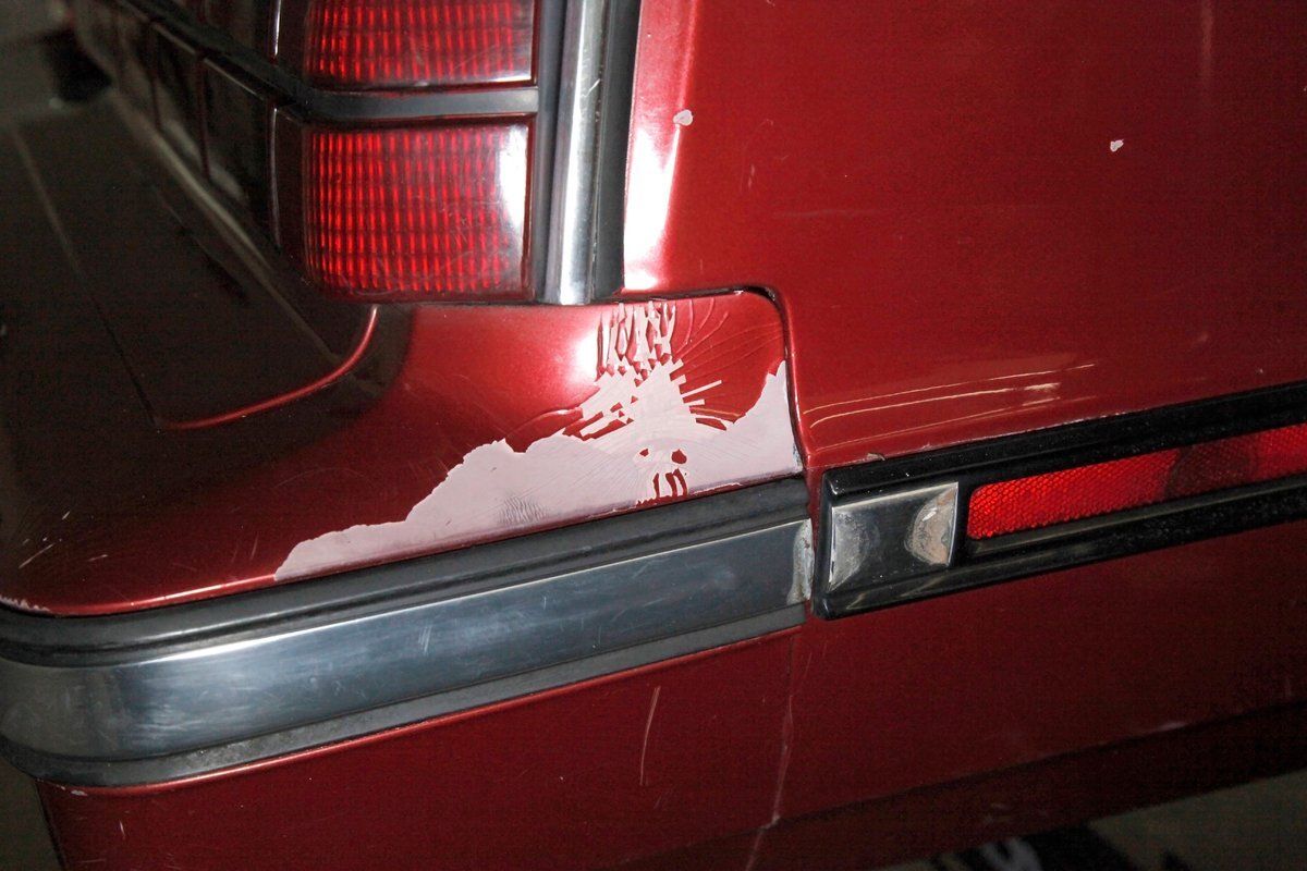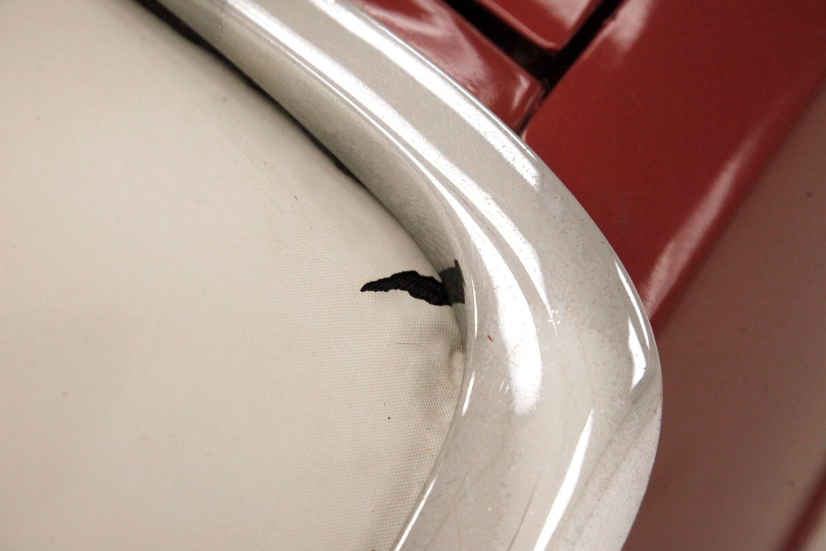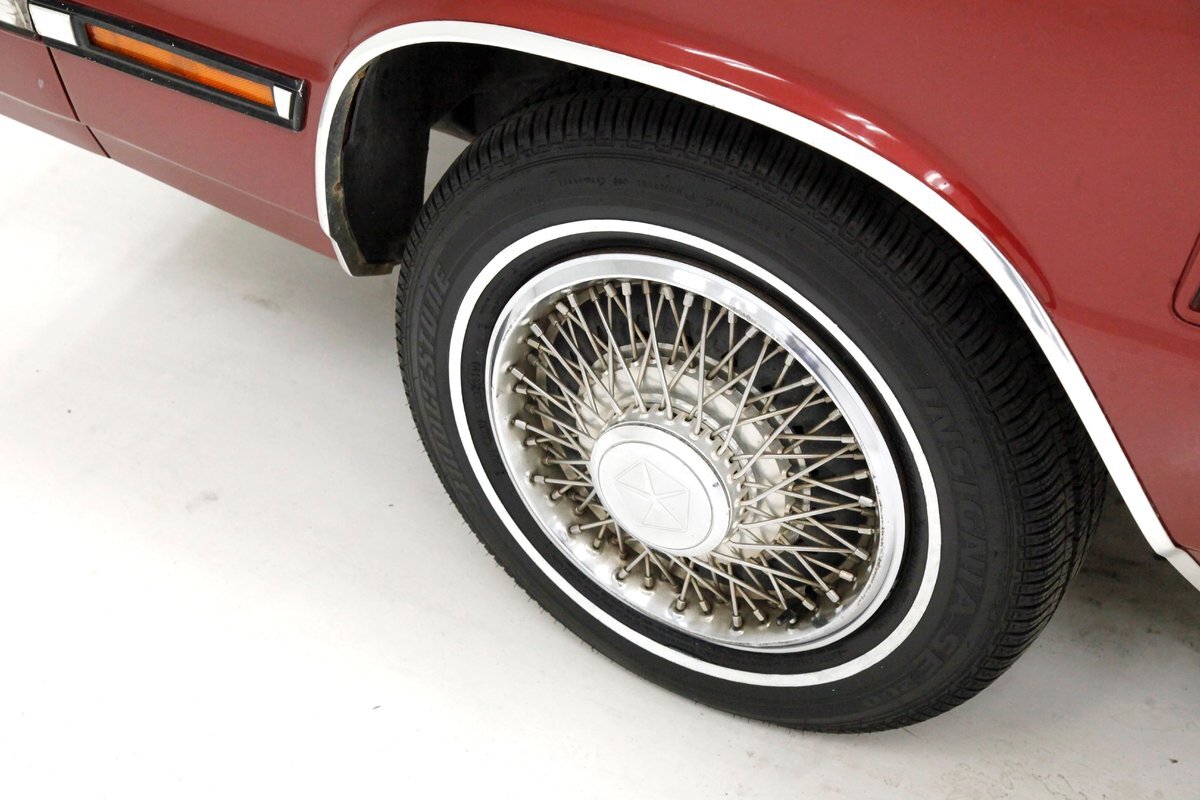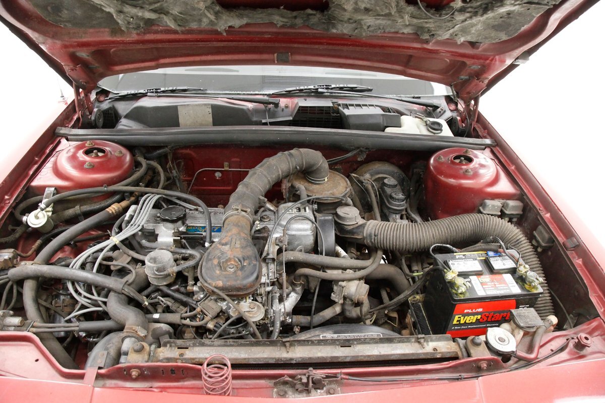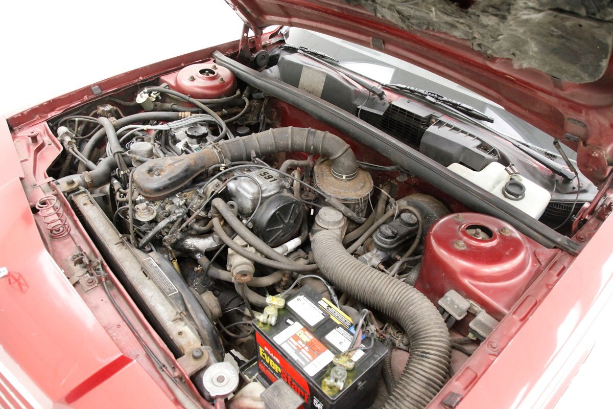 It's the mid 1980's and square and rectangle design is ubiquitous with cars of this era, and this car leaves us with no exception. Dual square headlights and a V horizontal ribbed grille with a shape matching crash bumper below lead the way. Some chrome trimmings are surrounding the wheel wells, windows and rockers, as well as a thin strip through the bumpers. Paint is chipping off the neoprene, it has scratches in the bumpers, and is showing some chip off on the side panels. On the door bottoms there is some slight invasive rust showing. The canvas top has a few cracks with its confines mainly at the edges, where stitched piping is coming loose from the canvas material of the actual top. The rear window is plastic and is clear. Gaps are good, and rear tail lighting is back to the square and rectangle motif wrapping slightly around the edges. Wheels with 14-inch wire wheel coverings are wrapped by 185/70R14's on all 4 corners.