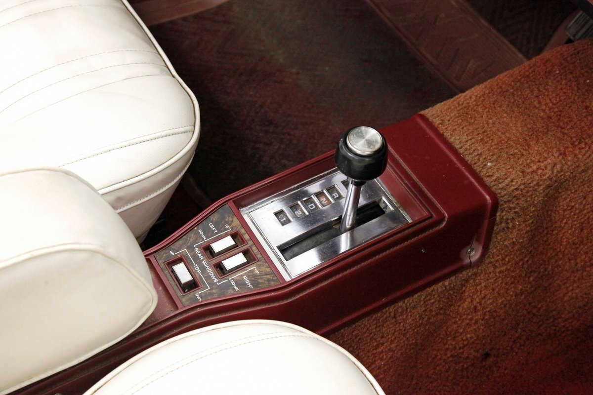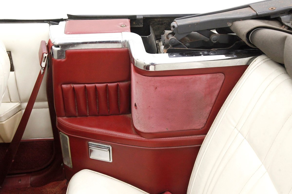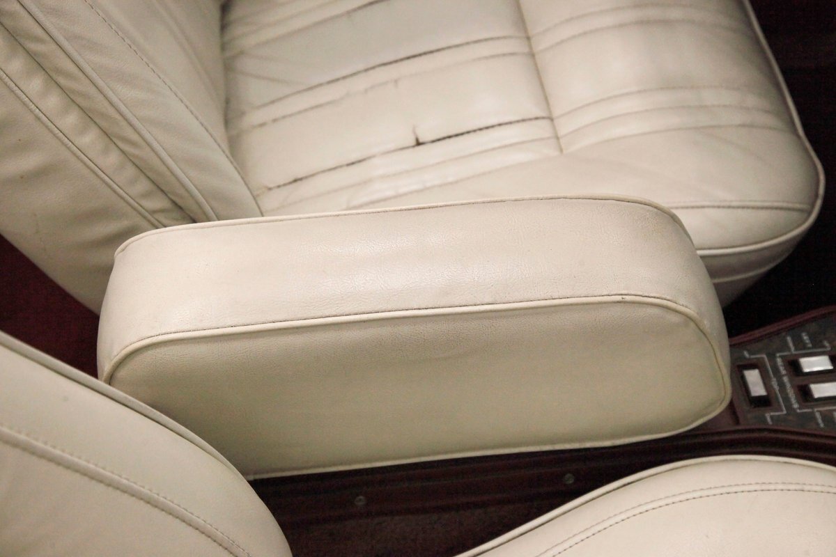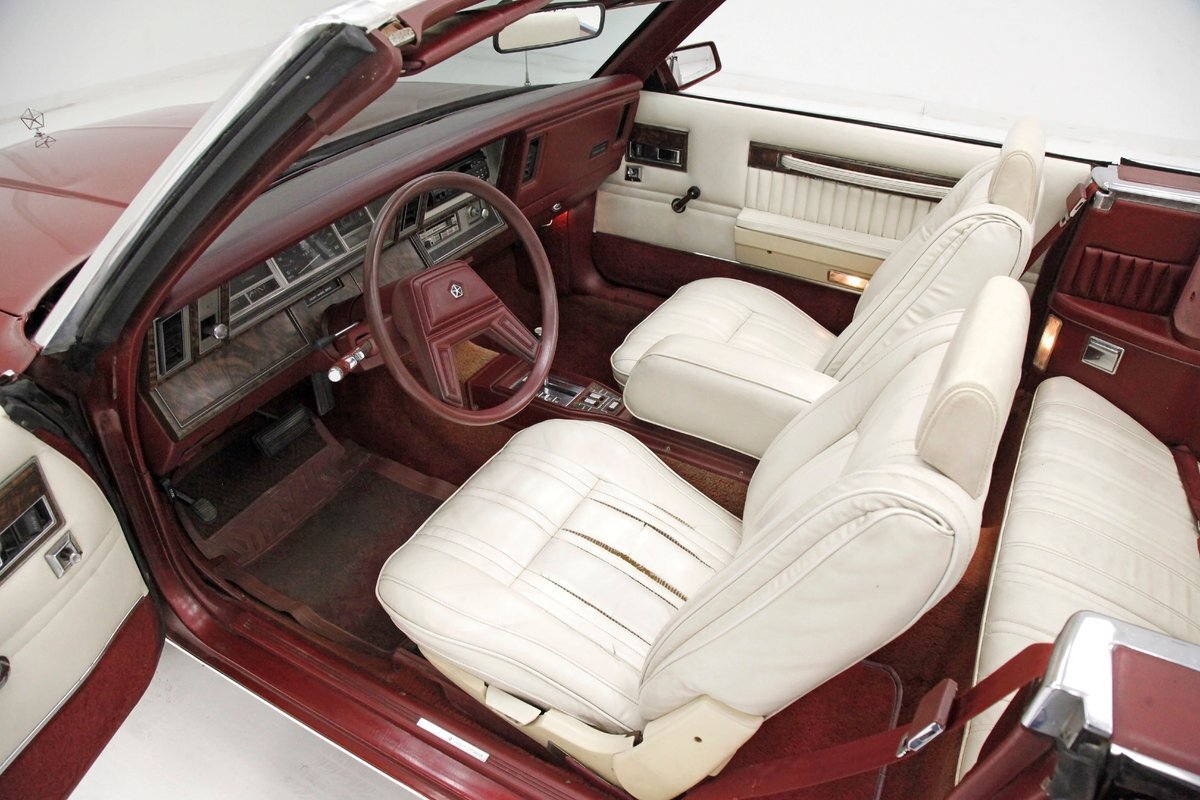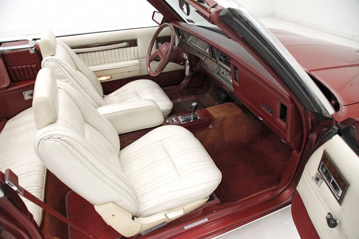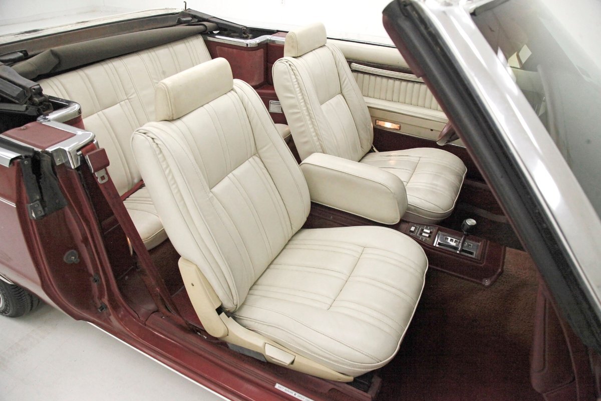 A swing of the mid 80's long doors, ( you must ask yourself why are those doors so long anyway!?), reveals some smooth white vinyl with a bit of tuck and roll inserts, a vinyl stitched door pull and a red carpeting strip below on the lowers. Bucket seats also in white vinyl have tuck and roll inserts and smooth bolsters with smooth white vinyl headrests. The driver's seat is shown coming apart at the seams of the tuck and roll inserts. A back bench in the same pattern and covering vinyl is in good condition. Red carpeting floods the floors and on the hump some fading of said red is noted. In front a square and rectangle dash in deep red has some wood burl applique and brushed aluminum trimmings for the instrument gauges and other surrounds. A plastic console houses the automatic shifter and a few additional convenience toggles for the windows and power top. A white padded armrest is in the center of the buckets and folds up and down. All surfaces are clean although show some use and wear for the mileage of this vehicle.