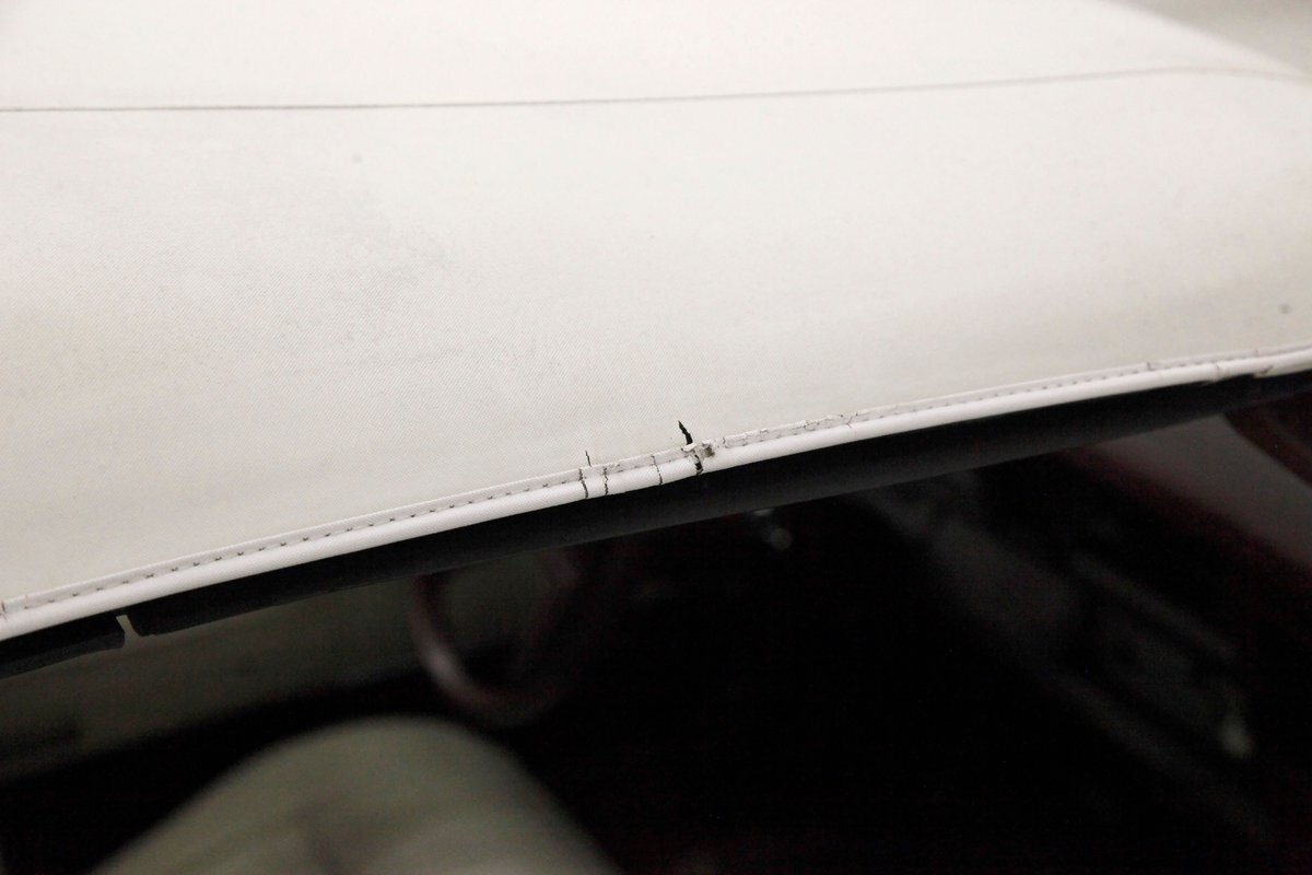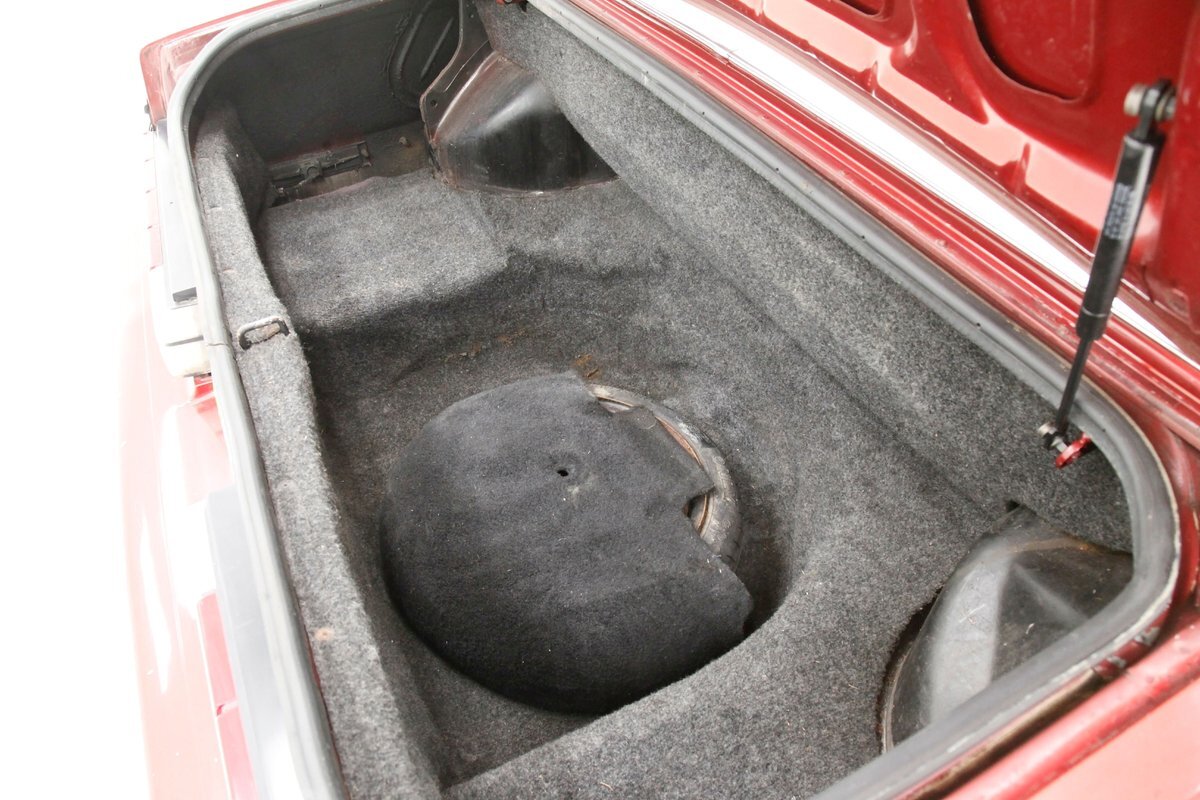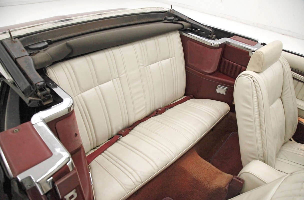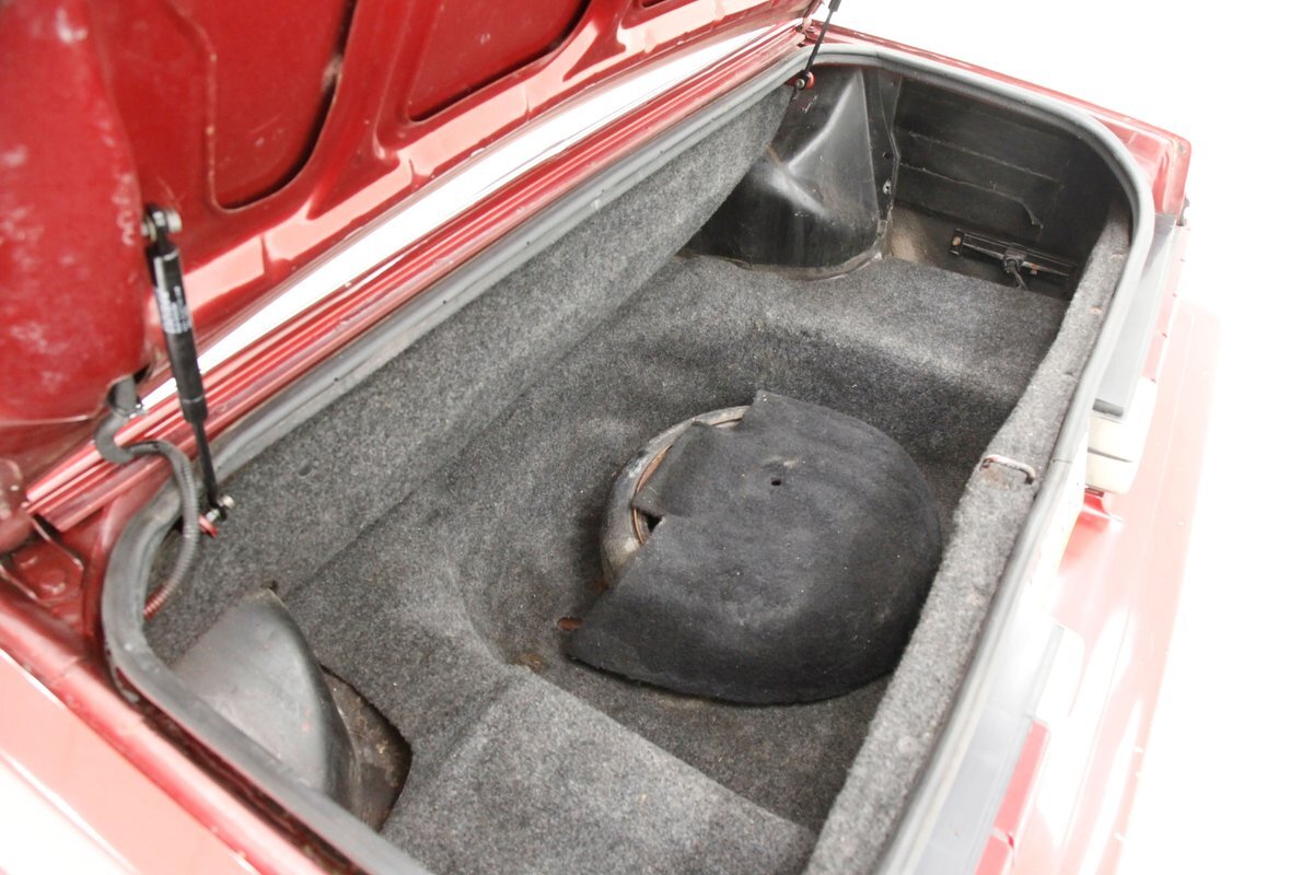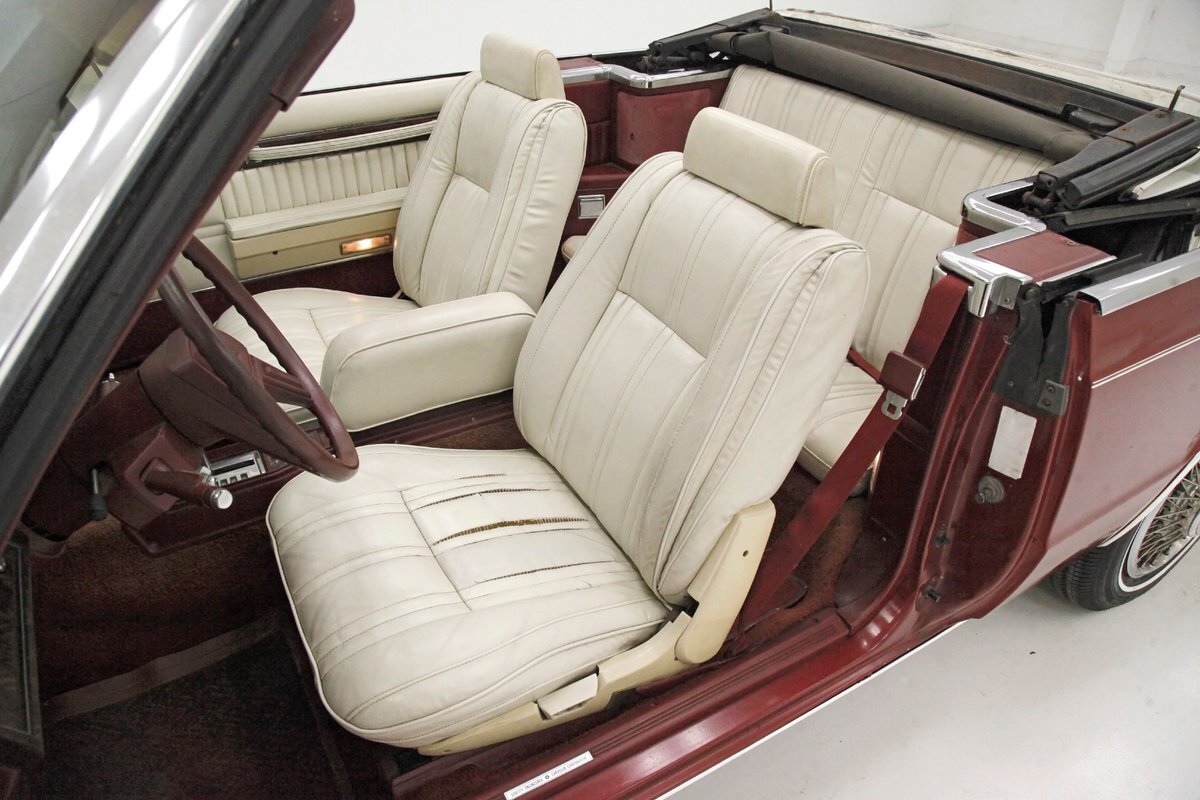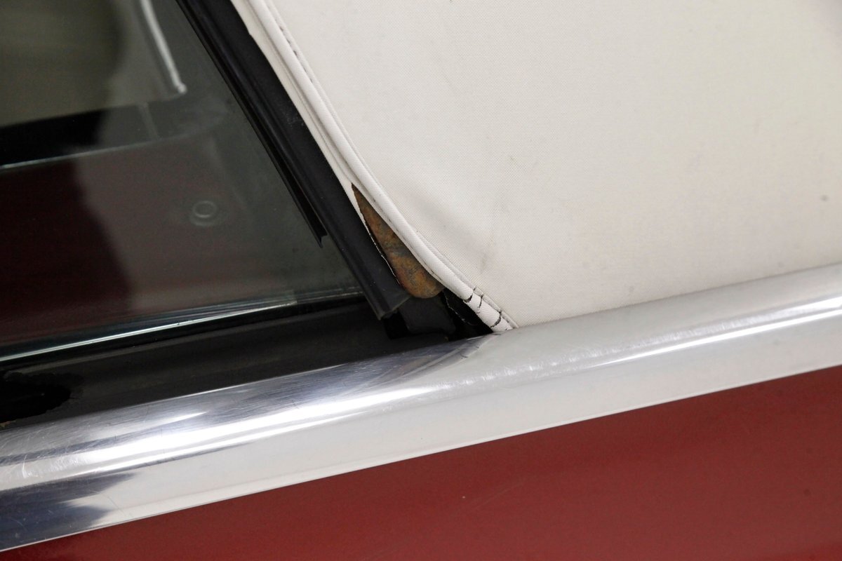 A swing of the mid 80's long doors, ( you must ask yourself why are those doors so long anyway!?), reveals some smooth white vinyl with a bit of tuck and roll inserts, a vinyl stitched door pull and a red carpeting strip below on the lowers. Bucket seats also in white vinyl have tuck and roll inserts and smooth bolsters with smooth white vinyl headrests. The driver's seat is shown coming apart at the seams of the tuck and roll inserts. A back bench in the same pattern and covering vinyl is in good condition. Red carpeting floods the floors and on the hump some fading of said red is noted. In front a square and rectangle dash in deep red has some wood burl applique and brushed aluminum trimmings for the instrument gauges and other surrounds. A plastic console houses the automatic shifter and a few additional convenience toggles for the windows and power top. A white padded armrest is in the center of the buckets and folds up and down. All surfaces are clean although show some use and wear for the mileage of this vehicle.
