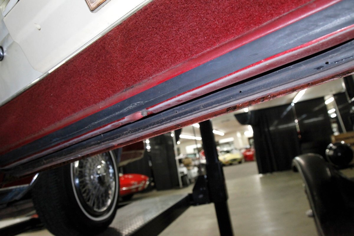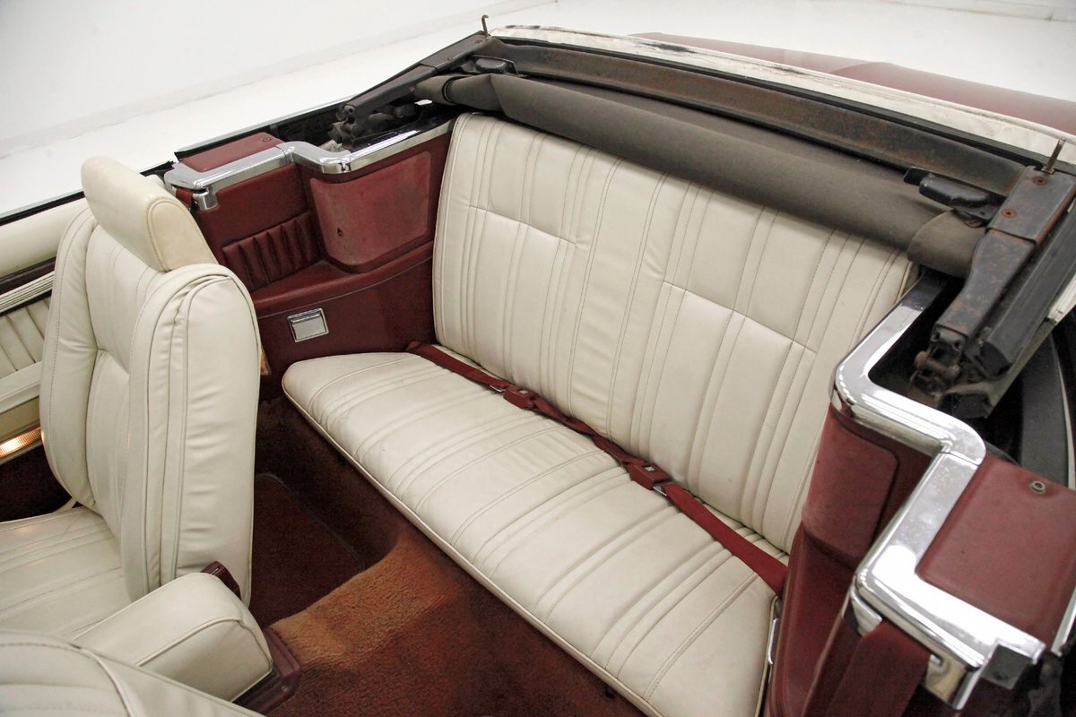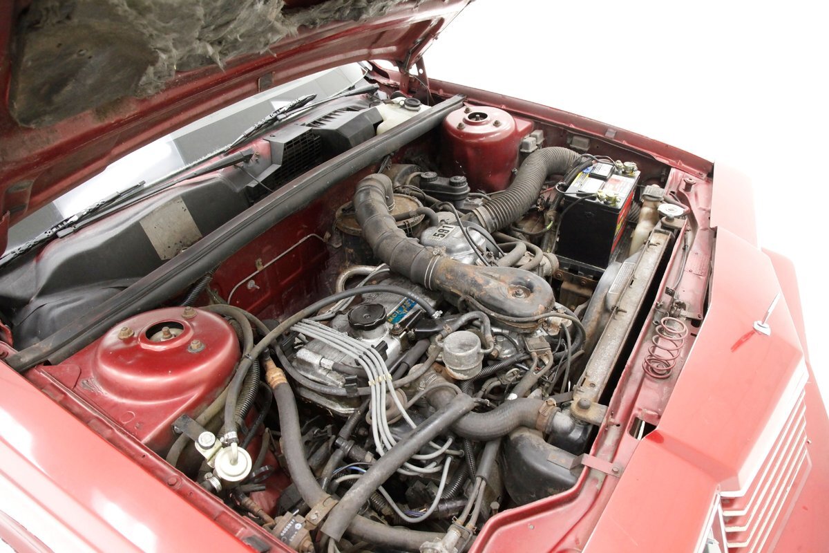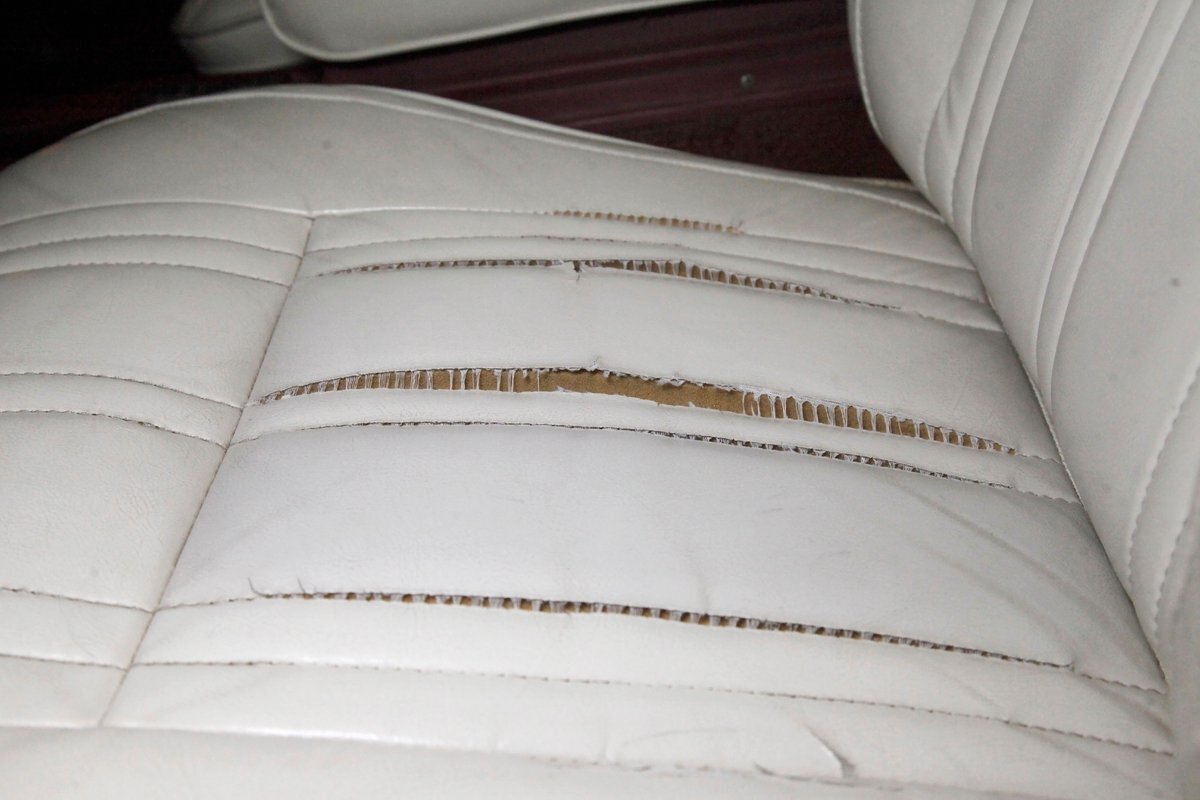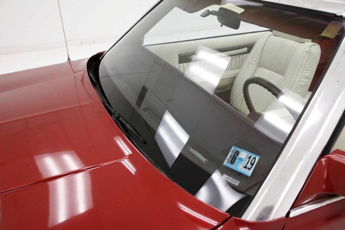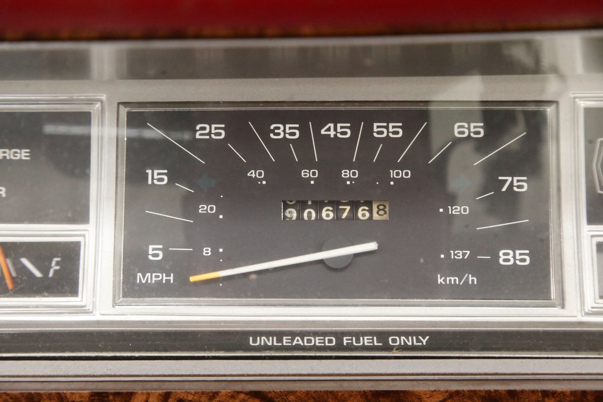 A swing of the mid 80's long doors, ( you must ask yourself why are those doors so long anyway!?), reveals some smooth white vinyl with a bit of tuck and roll inserts, a vinyl stitched door pull and a red carpeting strip below on the lowers. Bucket seats also in white vinyl have tuck and roll inserts and smooth bolsters with smooth white vinyl headrests. The driver's seat is shown coming apart at the seams of the tuck and roll inserts. A back bench in the same pattern and covering vinyl is in good condition. Red carpeting floods the floors and on the hump some fading of said red is noted. In front a square and rectangle dash in deep red has some wood burl applique and brushed aluminum trimmings for the instrument gauges and other surrounds. A plastic console houses the automatic shifter and a few additional convenience toggles for the windows and power top. A white padded armrest is in the center of the buckets and folds up and down. All surfaces are clean although show some use and wear for the mileage of this vehicle.