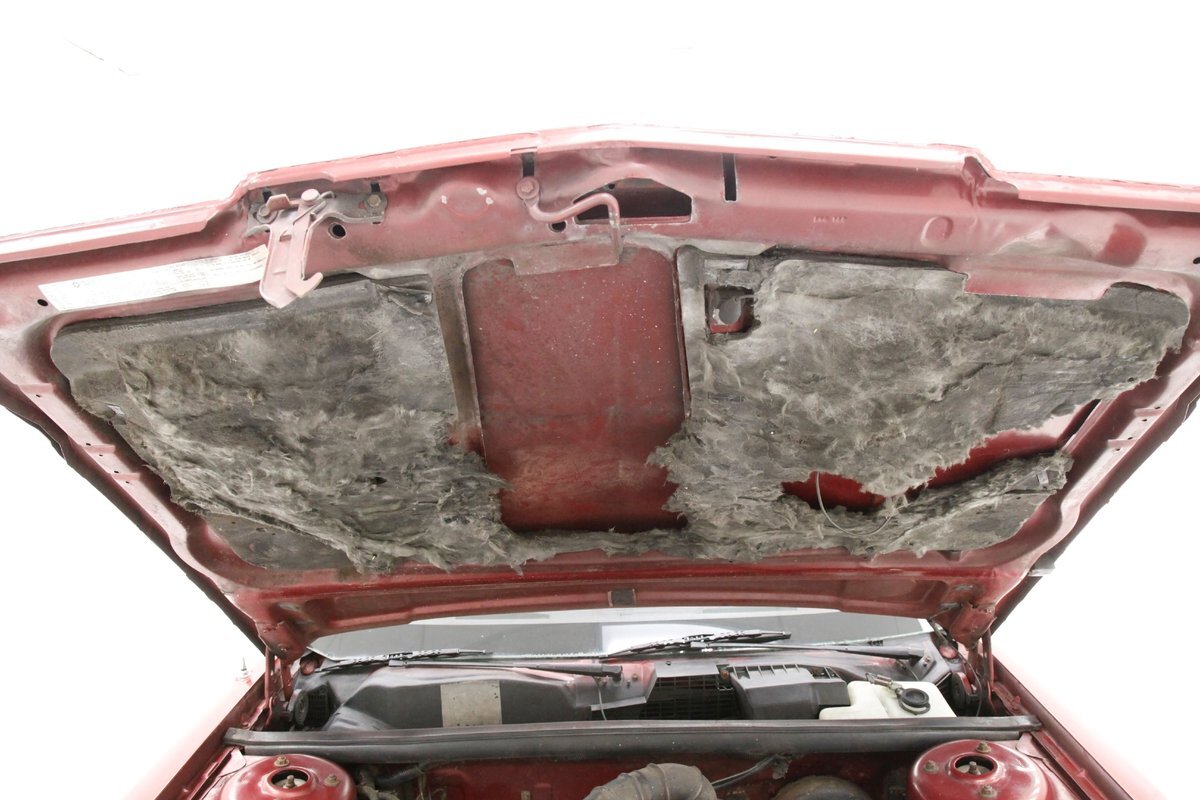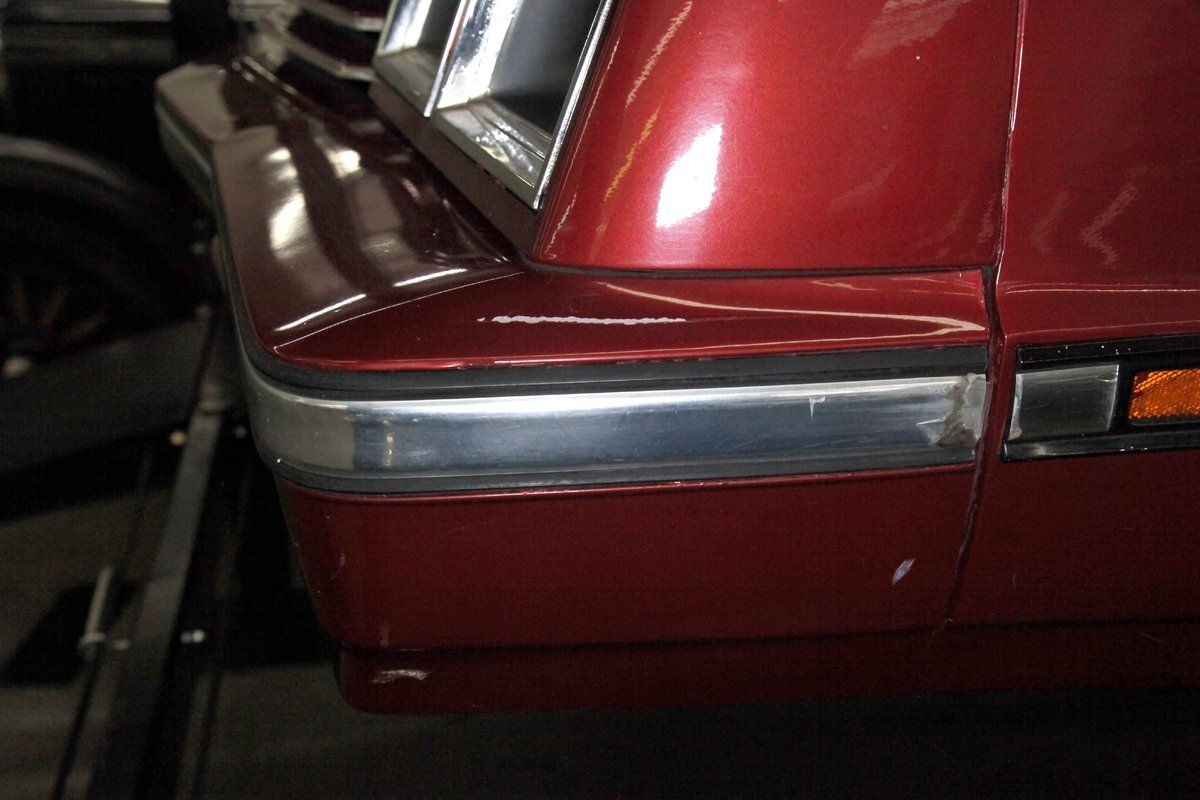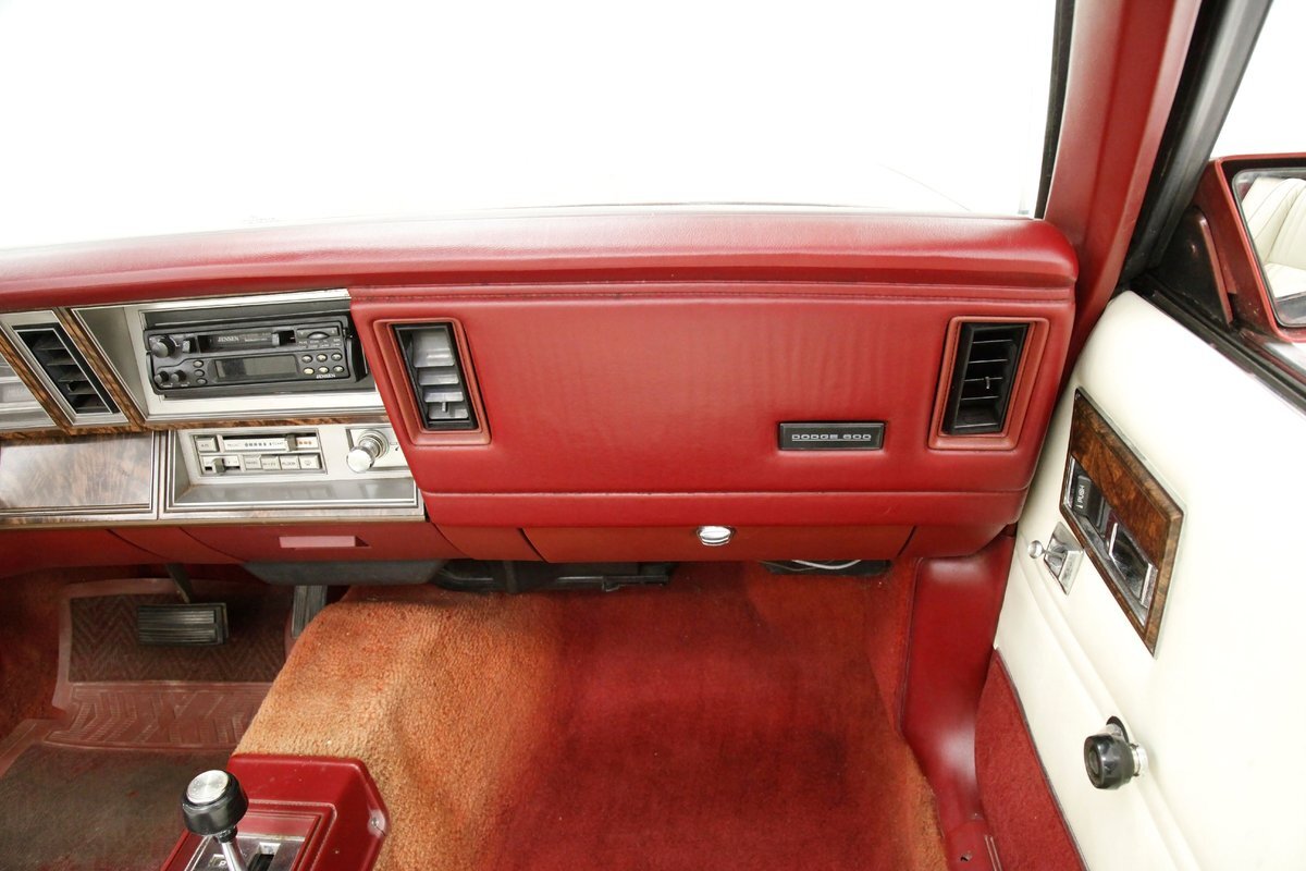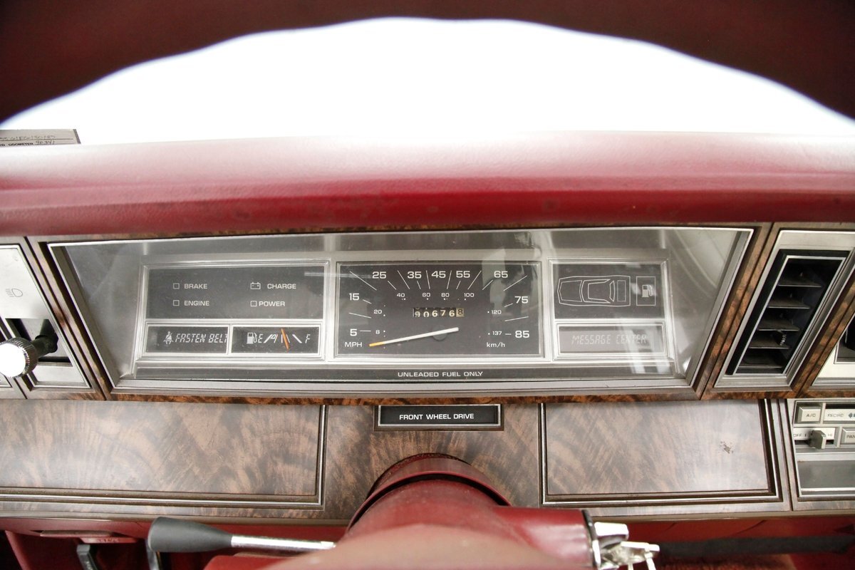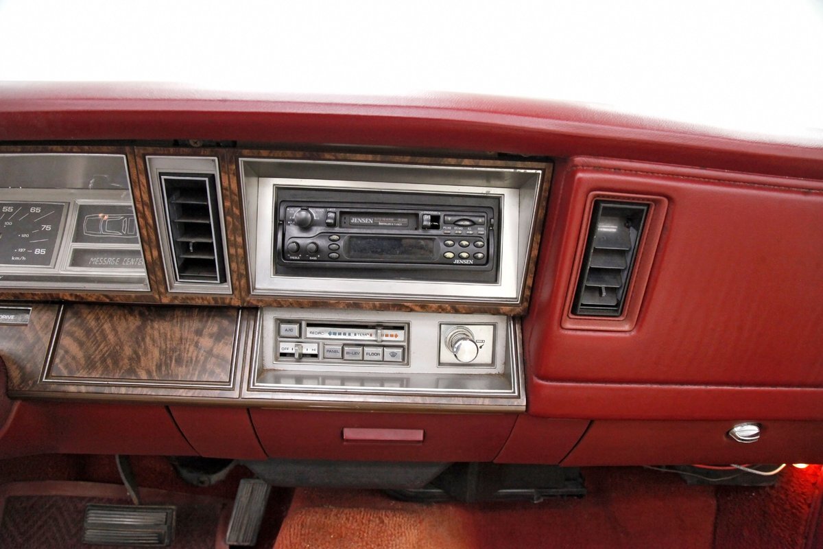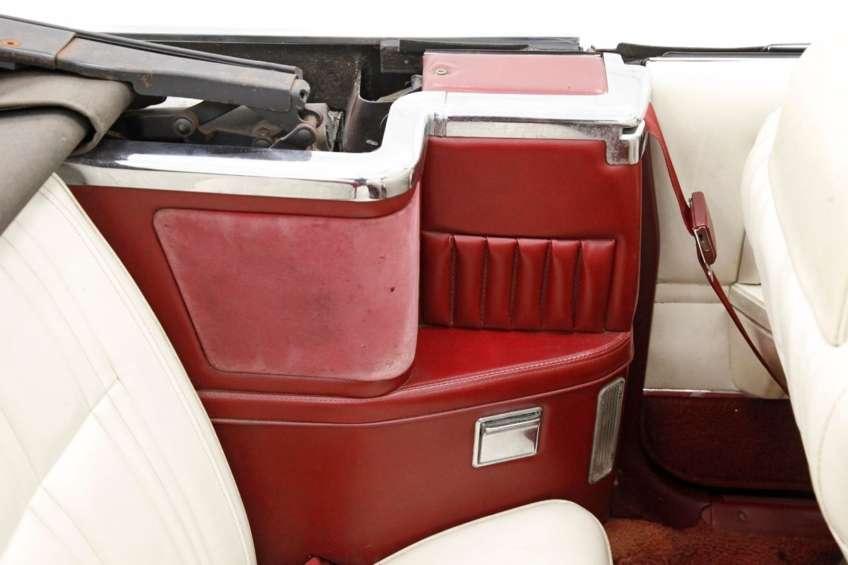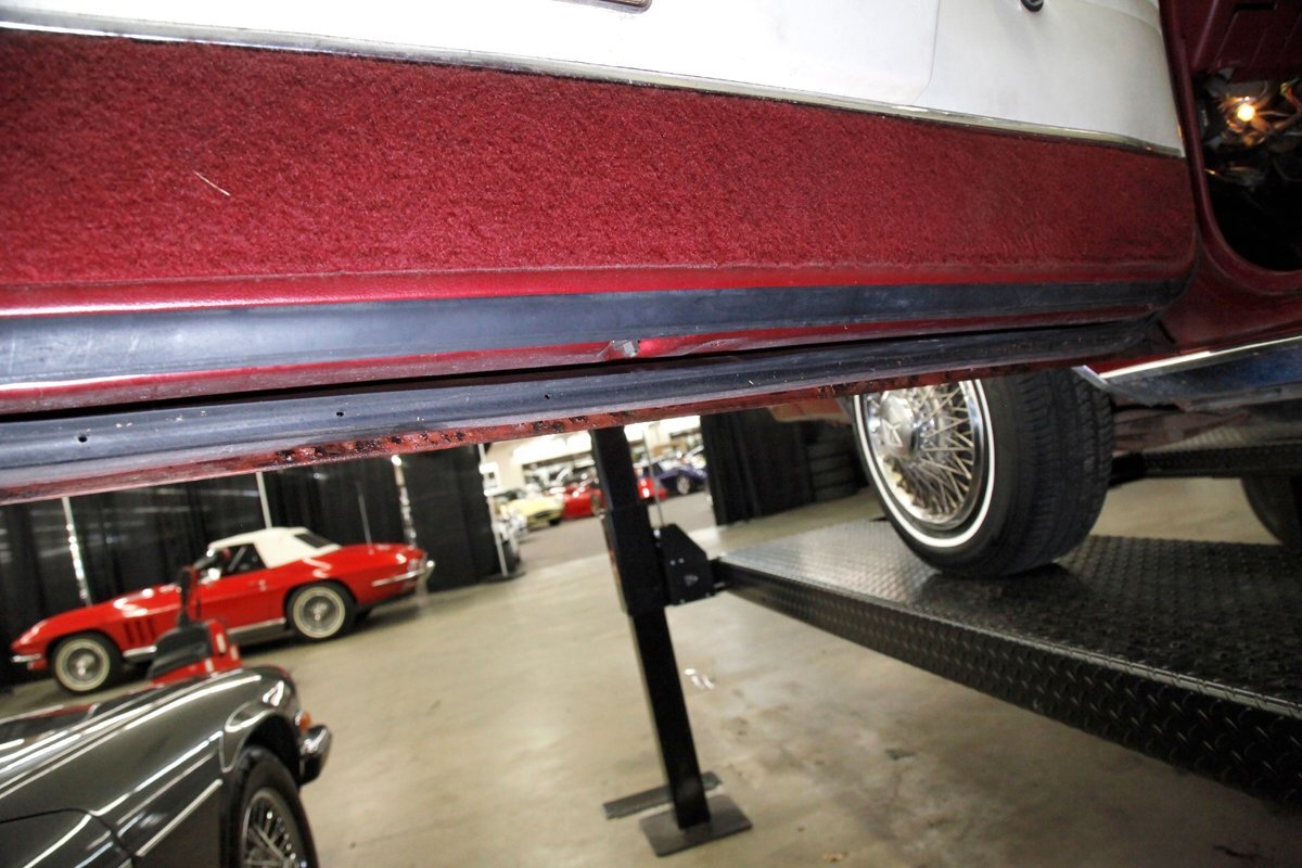 A swing of the mid 80's long doors, ( you must ask yourself why are those doors so long anyway!?), reveals some smooth white vinyl with a bit of tuck and roll inserts, a vinyl stitched door pull and a red carpeting strip below on the lowers. Bucket seats also in white vinyl have tuck and roll inserts and smooth bolsters with smooth white vinyl headrests. The driver's seat is shown coming apart at the seams of the tuck and roll inserts. A back bench in the same pattern and covering vinyl is in good condition. Red carpeting floods the floors and on the hump some fading of said red is noted. In front a square and rectangle dash in deep red has some wood burl applique and brushed aluminum trimmings for the instrument gauges and other surrounds. A plastic console houses the automatic shifter and a few additional convenience toggles for the windows and power top. A white padded armrest is in the center of the buckets and folds up and down. All surfaces are clean although show some use and wear for the mileage of this vehicle.