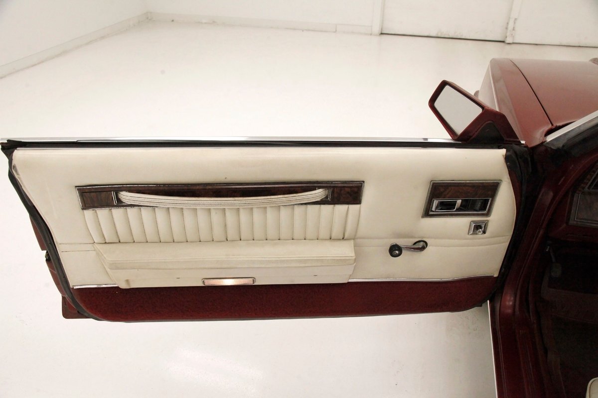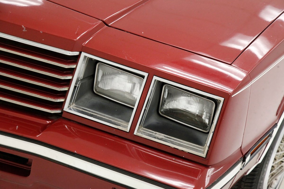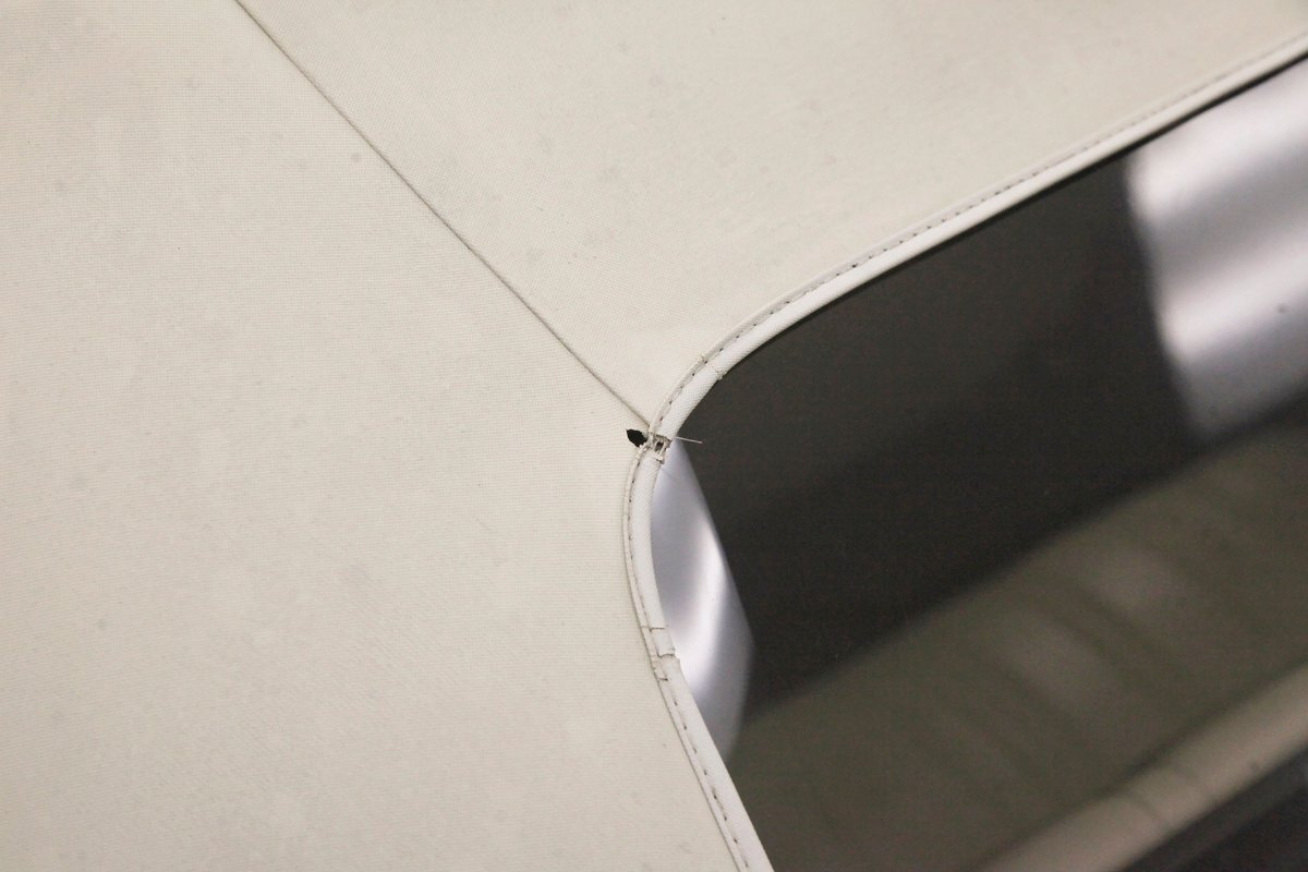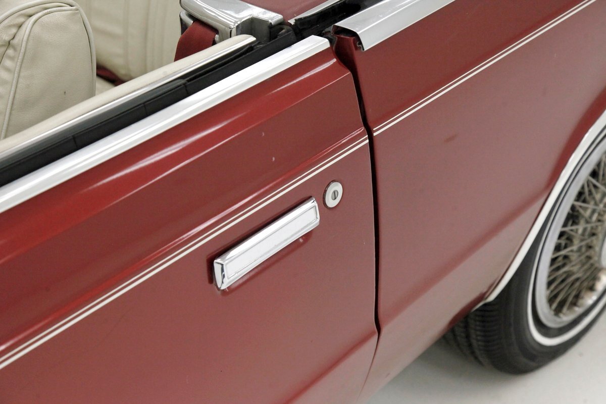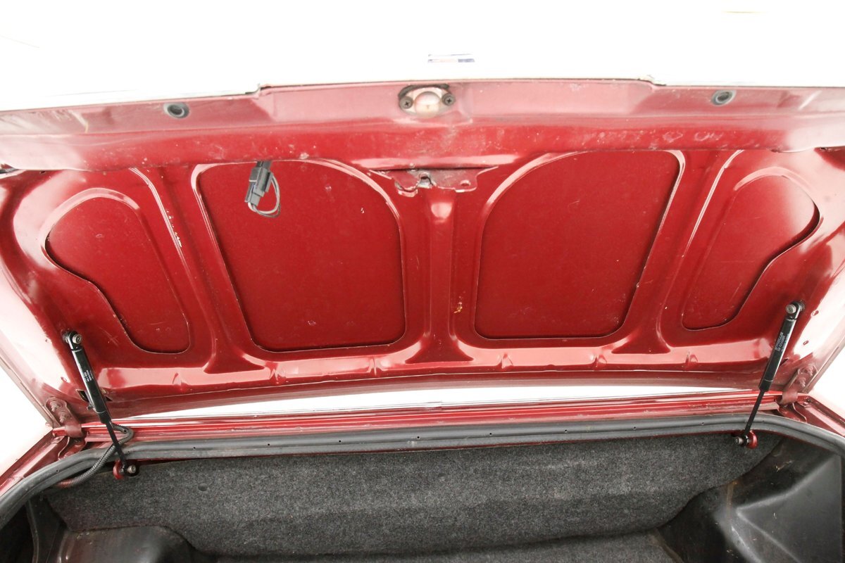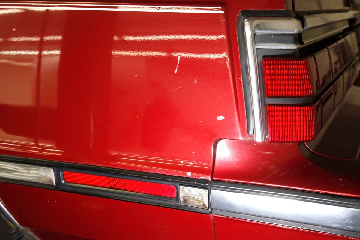 A swing of the mid 80's long doors, ( you must ask yourself why are those doors so long anyway!?), reveals some smooth white vinyl with a bit of tuck and roll inserts, a vinyl stitched door pull and a red carpeting strip below on the lowers. Bucket seats also in white vinyl have tuck and roll inserts and smooth bolsters with smooth white vinyl headrests. The driver's seat is shown coming apart at the seams of the tuck and roll inserts. A back bench in the same pattern and covering vinyl is in good condition. Red carpeting floods the floors and on the hump some fading of said red is noted. In front a square and rectangle dash in deep red has some wood burl applique and brushed aluminum trimmings for the instrument gauges and other surrounds. A plastic console houses the automatic shifter and a few additional convenience toggles for the windows and power top. A white padded armrest is in the center of the buckets and folds up and down. All surfaces are clean although show some use and wear for the mileage of this vehicle.