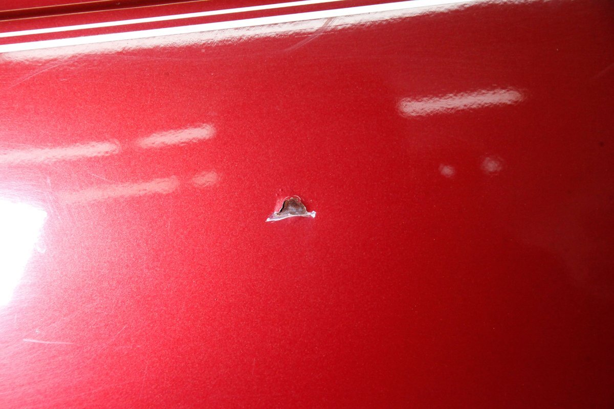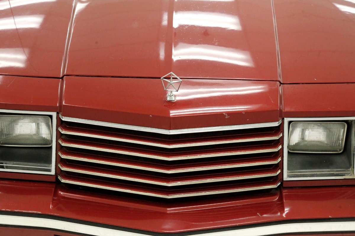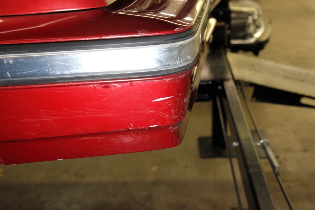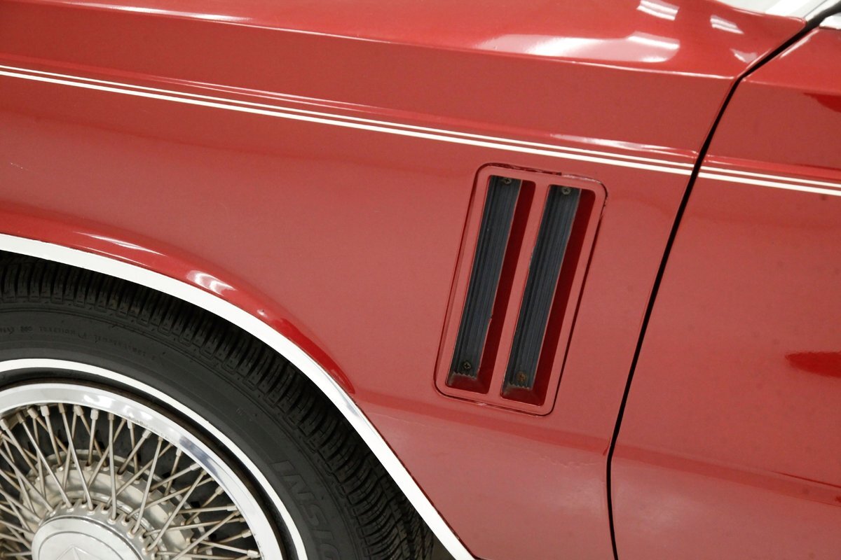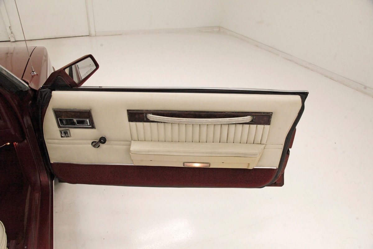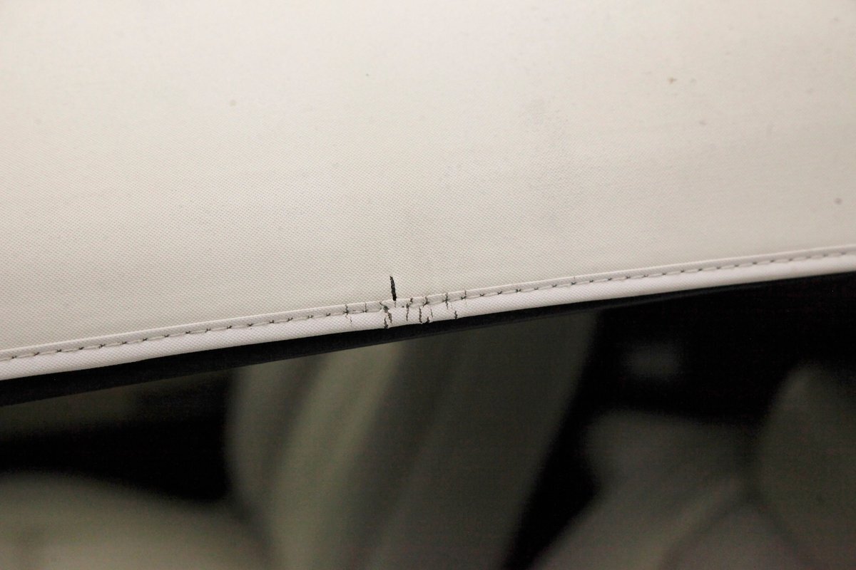 A swing of the mid 80's long doors, ( you must ask yourself why are those doors so long anyway!?), reveals some smooth white vinyl with a bit of tuck and roll inserts, a vinyl stitched door pull and a red carpeting strip below on the lowers. Bucket seats also in white vinyl have tuck and roll inserts and smooth bolsters with smooth white vinyl headrests. The driver's seat is shown coming apart at the seams of the tuck and roll inserts. A back bench in the same pattern and covering vinyl is in good condition. Red carpeting floods the floors and on the hump some fading of said red is noted. In front a square and rectangle dash in deep red has some wood burl applique and brushed aluminum trimmings for the instrument gauges and other surrounds. A plastic console houses the automatic shifter and a few additional convenience toggles for the windows and power top. A white padded armrest is in the center of the buckets and folds up and down. All surfaces are clean although show some use and wear for the mileage of this vehicle.