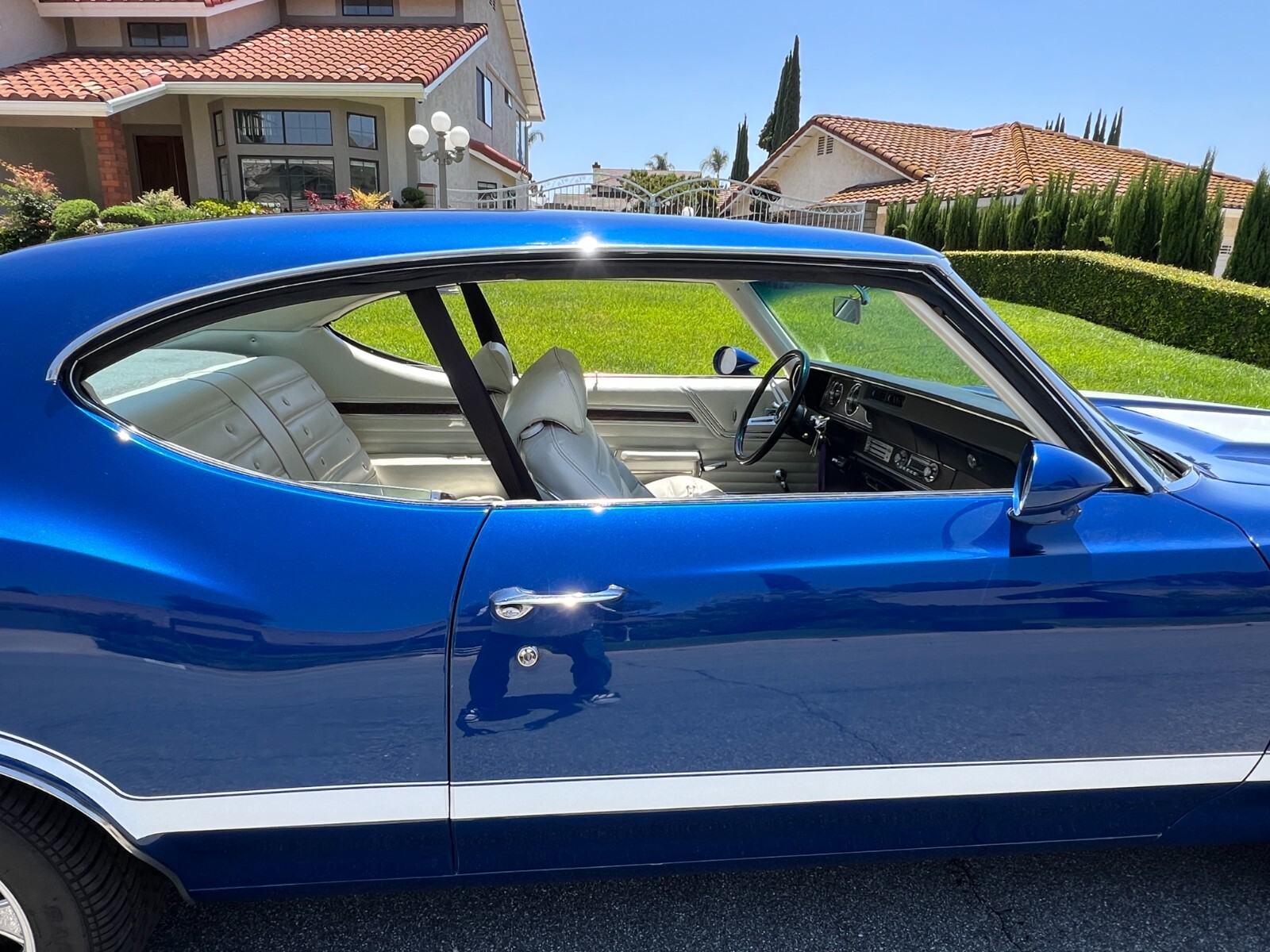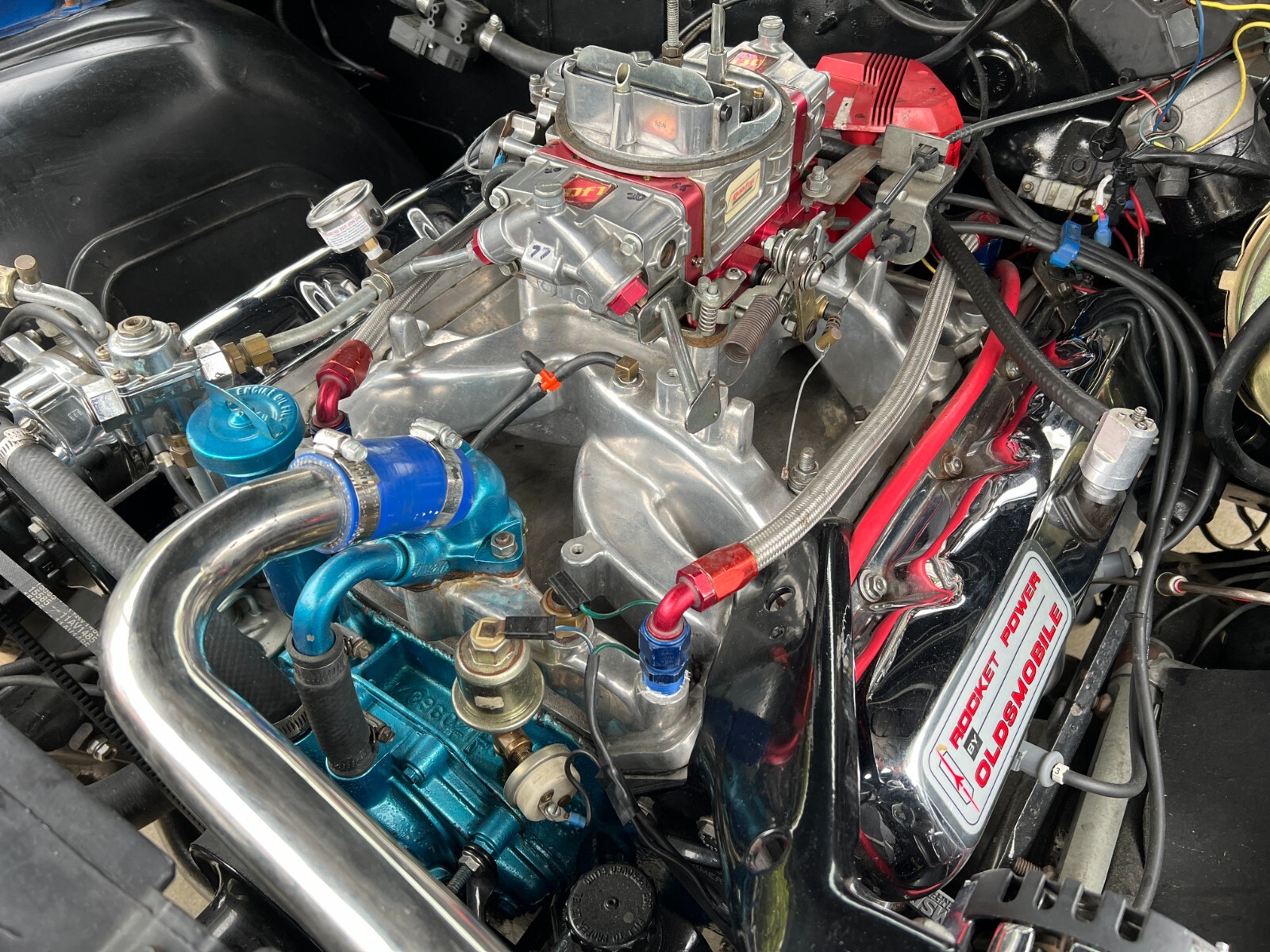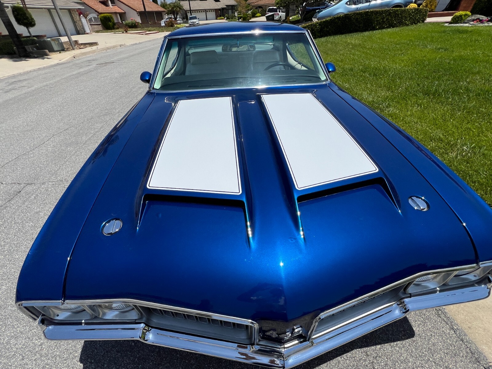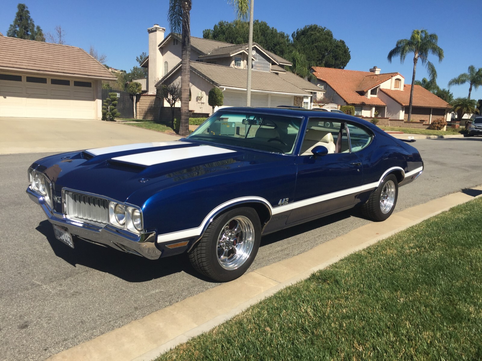 •1970 Olds 442 built Freemont ,Calif. First sold Ventura,Calif. Completly restored starting 2005 by father /son project approx. 12 years later .Electron Metallic Blue w/factory W25 Ram Air hood /W35 Rear spoiler w/custom LED 3rd rear tail light. White saddle bucket seats/interior by Legendary. 455 cubic inch motor 0.030 over not numbers matching -correct serial block/Edelbrock Aluminum heads/factory 442 automatic blue print cam/roller rockers/recent New ceramic Headman headers/Doug Thorley electric cutouts/approx. 12K miles since engine rebuild-completely rings seated runs excellent. Air Gap intake w/QFT 880 CFM carb/HEI 65K Volt ignition/New AGR fast ratio steering box/Vintage AC/Hurst Dual Gate 4sp shifter/console/ART CARR HD Turbo 200R4 trans/Northern Aluminum radiatior/All new Moog suspension w/ 1 3/8 “ front sway bar/Hotchkis HD rear control arms w/1” rear sway bar/ 4-wheel disc brakes all four wheels/SSBC dual piston front caliber//new 3:42 ratio posi traction /W27 aluminum rear cover/New Koni shock. Recent 2022 New Cooper tires 235x55Rx16 on Special Chrome/Aluminum Hopster wheels./New LED headlight/custom Sequential LED tail lights/complete new harness for car/new battery/Milton 909 996-5046 So. Calf Olds Member 1228 ;OCA 3166