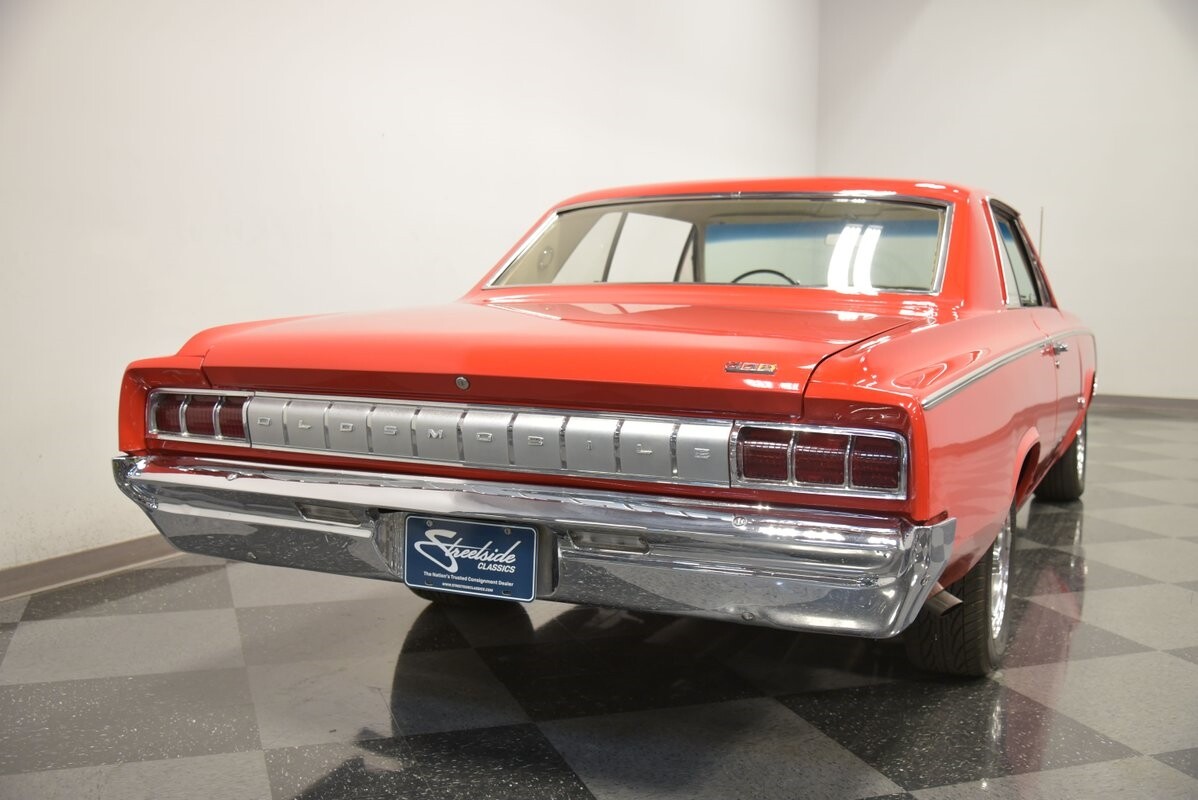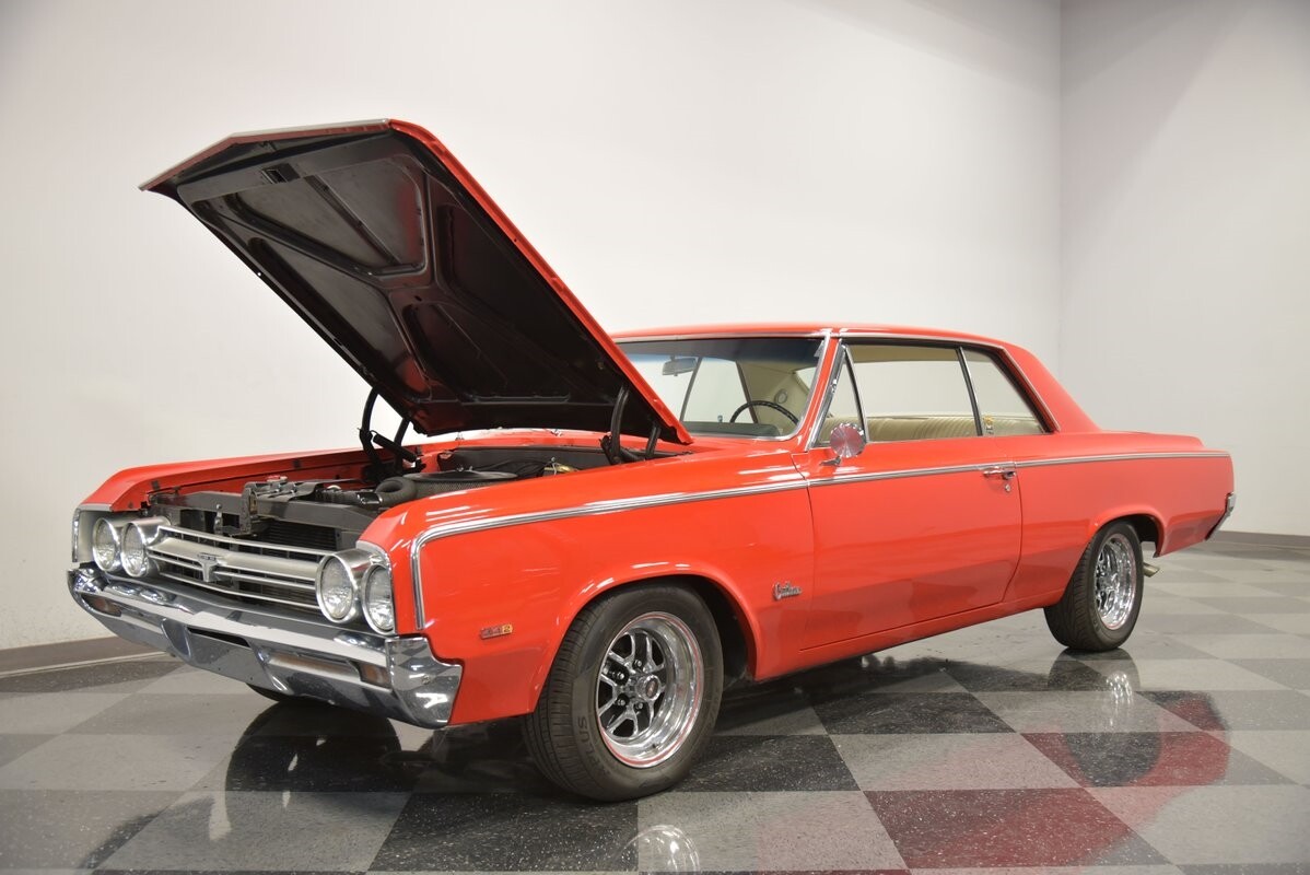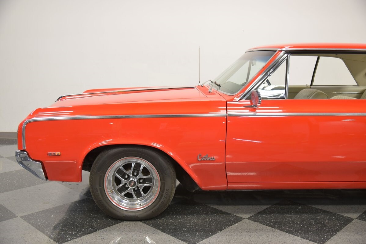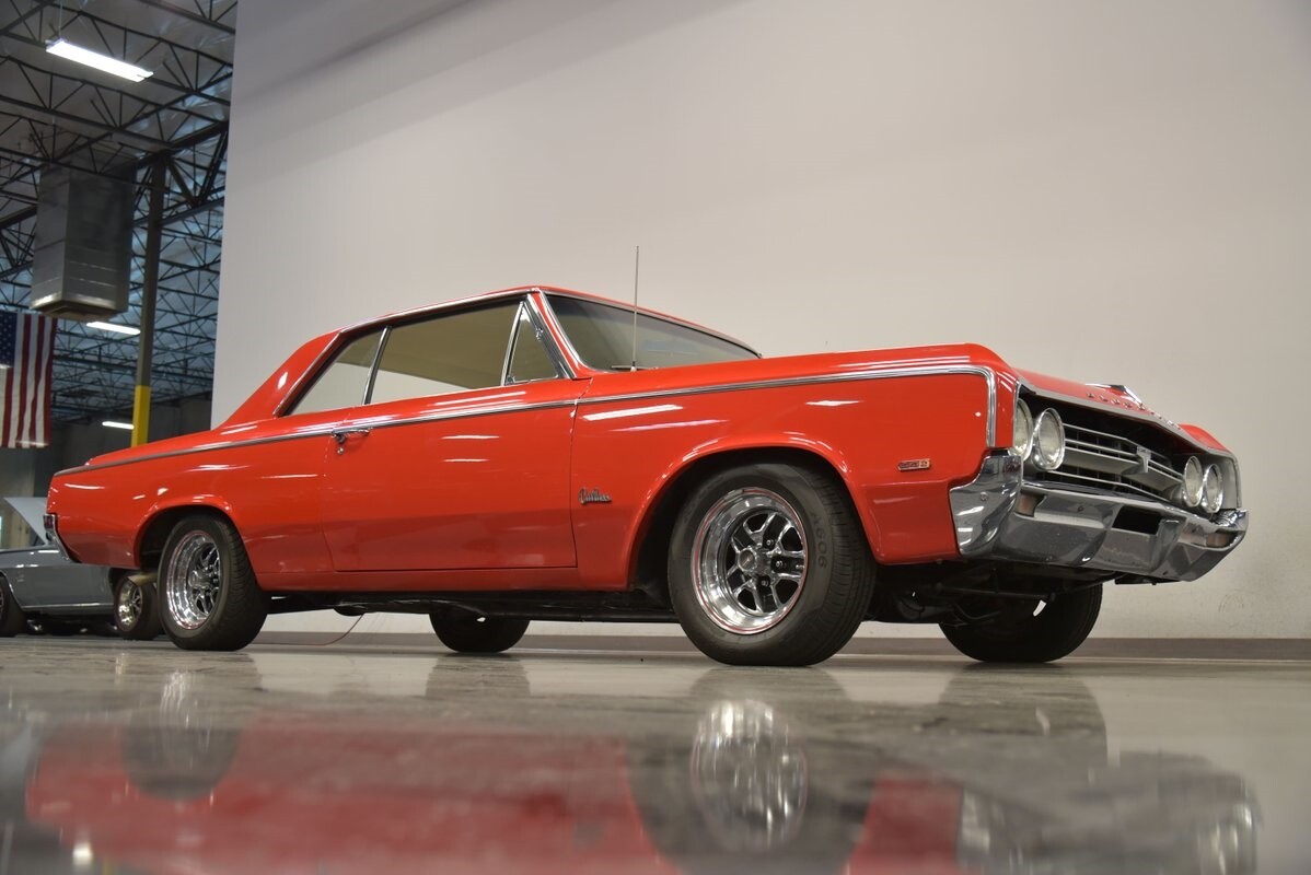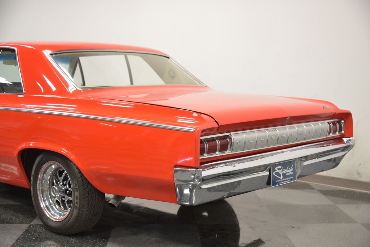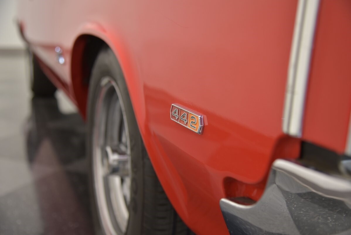 It's a Holiday Hardtop finished in Holiday Red, so this coupe already has a very cool sound to it. The later respray ensures a nice shine while also making sure this hardtop has a driver-ready style. After all, this one also wants to be a fun 442 tribute so you have sporty details, like the 442 badging, dual exhaust tips, and a cool set of upgraded Super Stock wheels with a sporty red line. The tires are even staggered to give this one a nice overall stance.