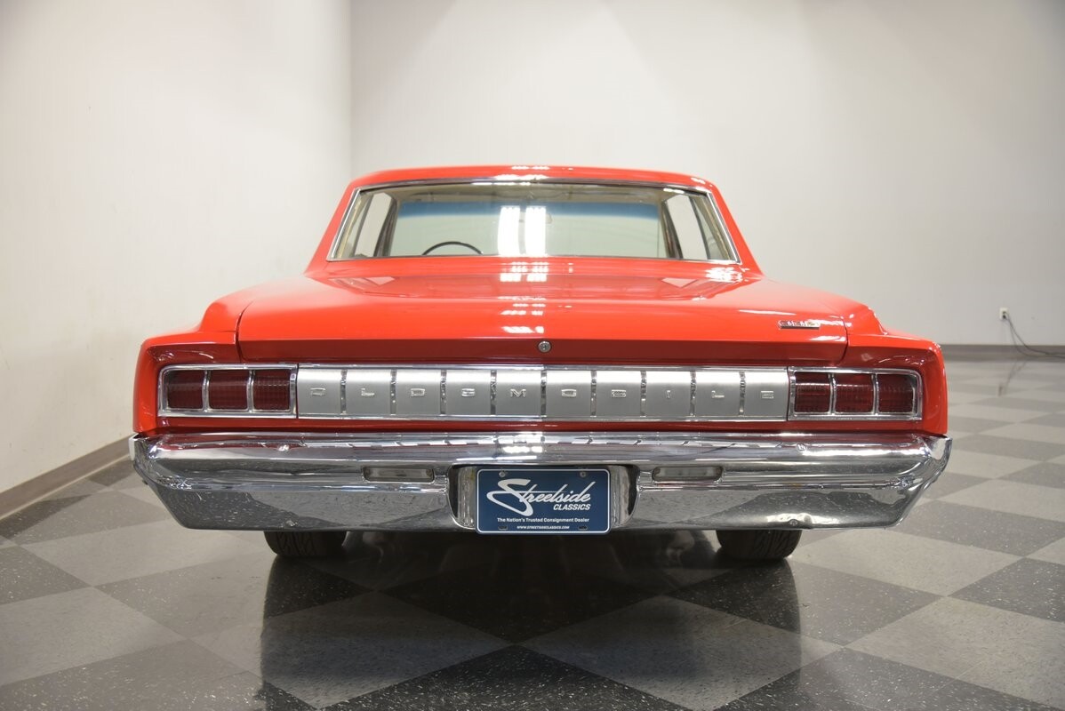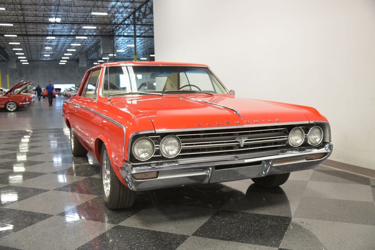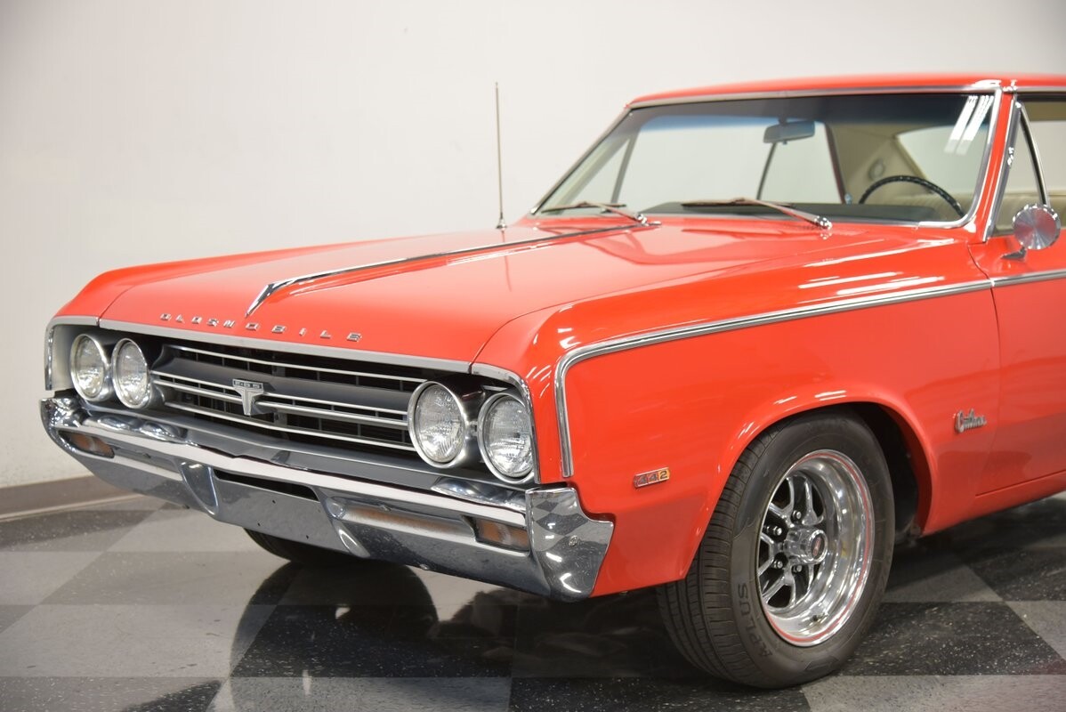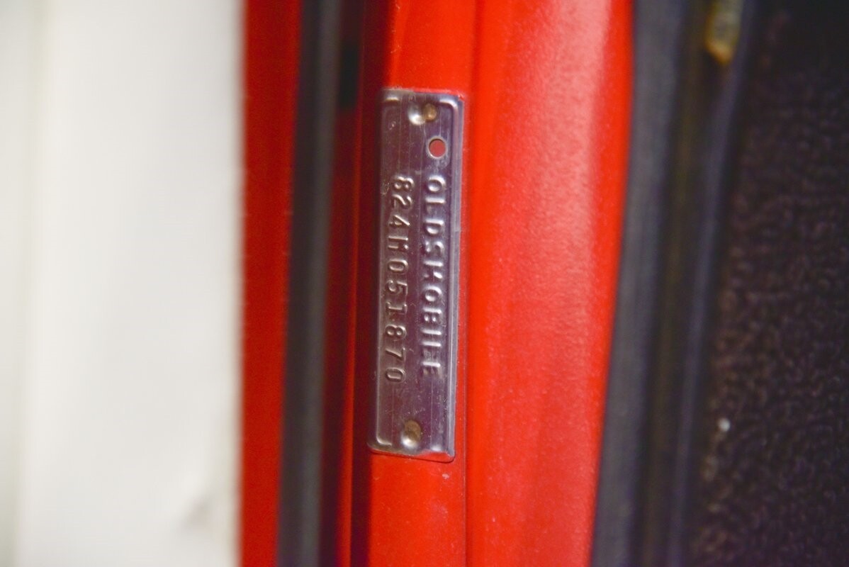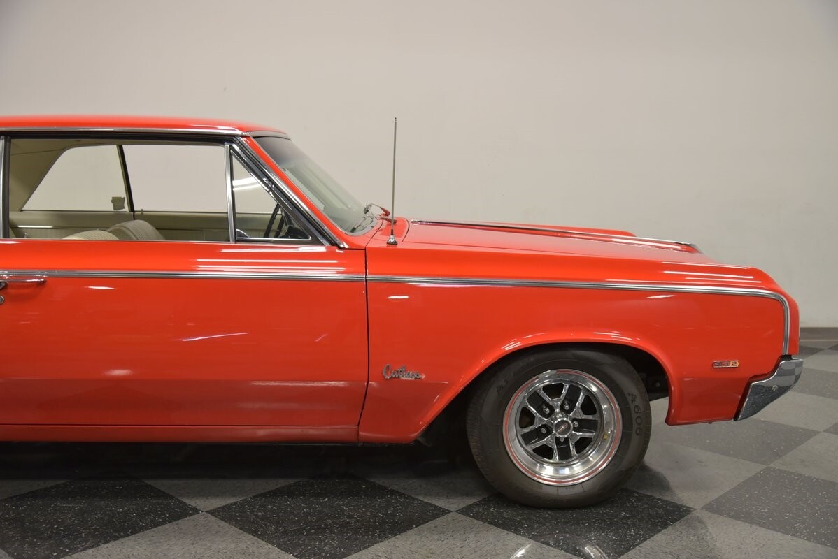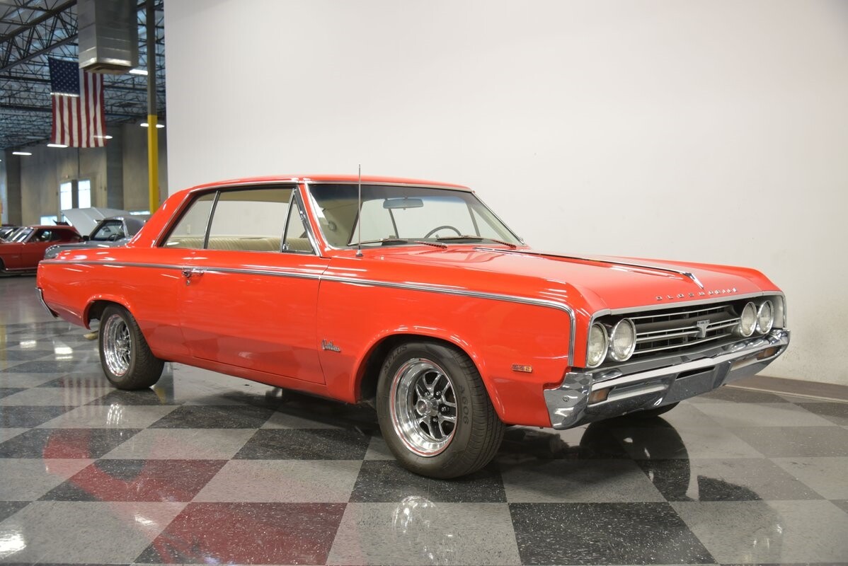 It's a Holiday Hardtop finished in Holiday Red, so this coupe already has a very cool sound to it. The later respray ensures a nice shine while also making sure this hardtop has a driver-ready style. After all, this one also wants to be a fun 442 tribute so you have sporty details, like the 442 badging, dual exhaust tips, and a cool set of upgraded Super Stock wheels with a sporty red line. The tires are even staggered to give this one a nice overall stance.