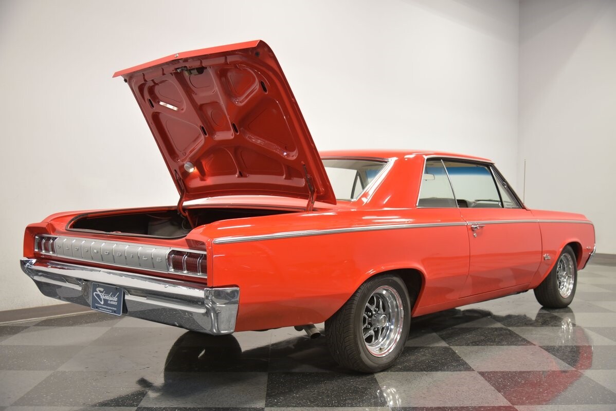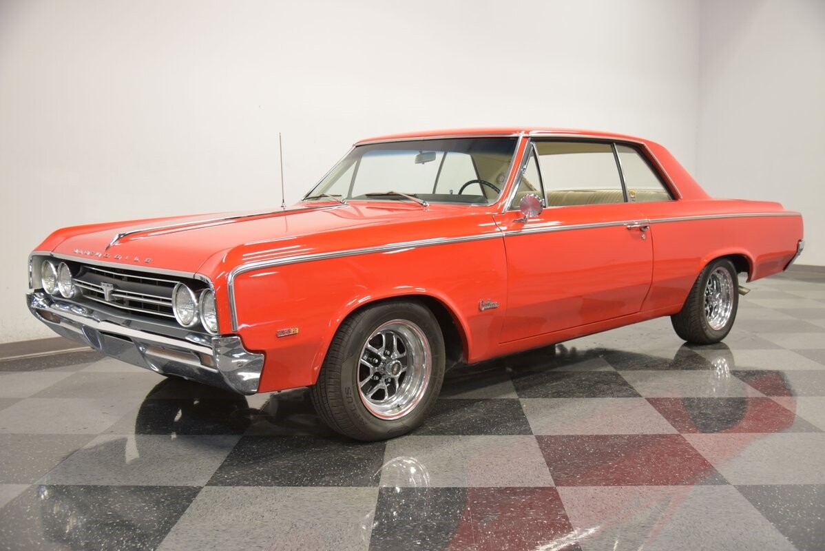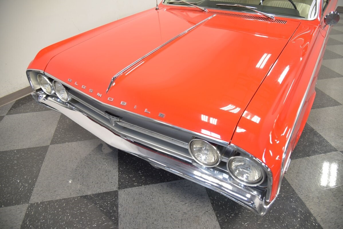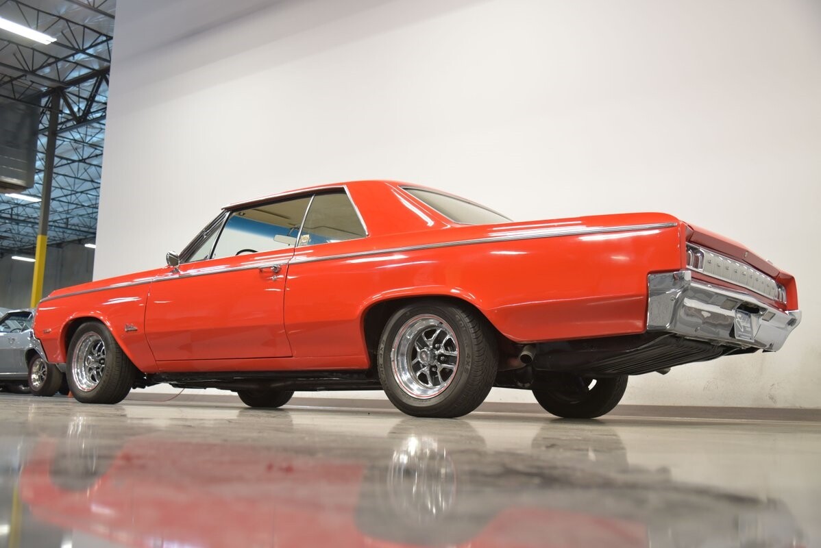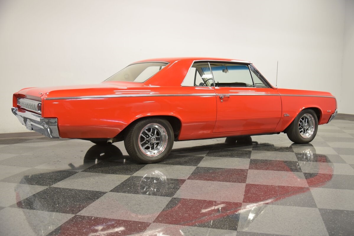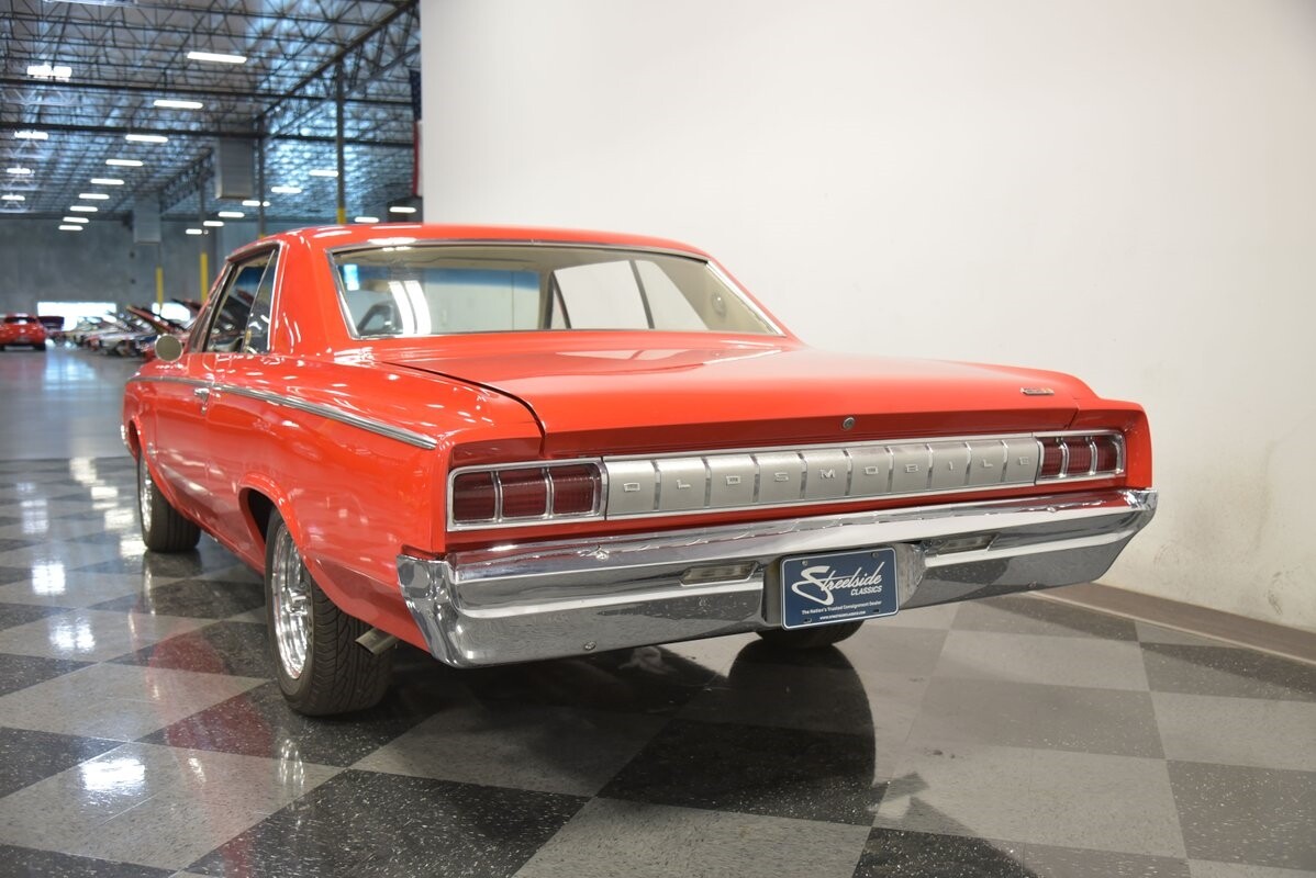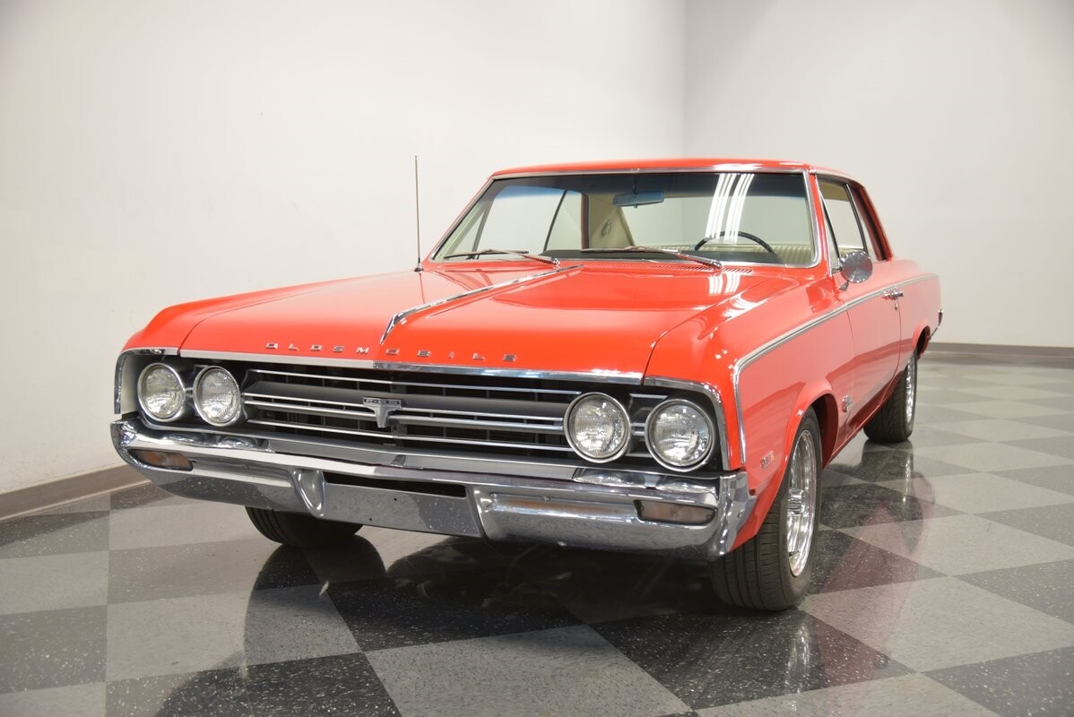 It's a Holiday Hardtop finished in Holiday Red, so this coupe already has a very cool sound to it. The later respray ensures a nice shine while also making sure this hardtop has a driver-ready style. After all, this one also wants to be a fun 442 tribute so you have sporty details, like the 442 badging, dual exhaust tips, and a cool set of upgraded Super Stock wheels with a sporty red line. The tires are even staggered to give this one a nice overall stance.