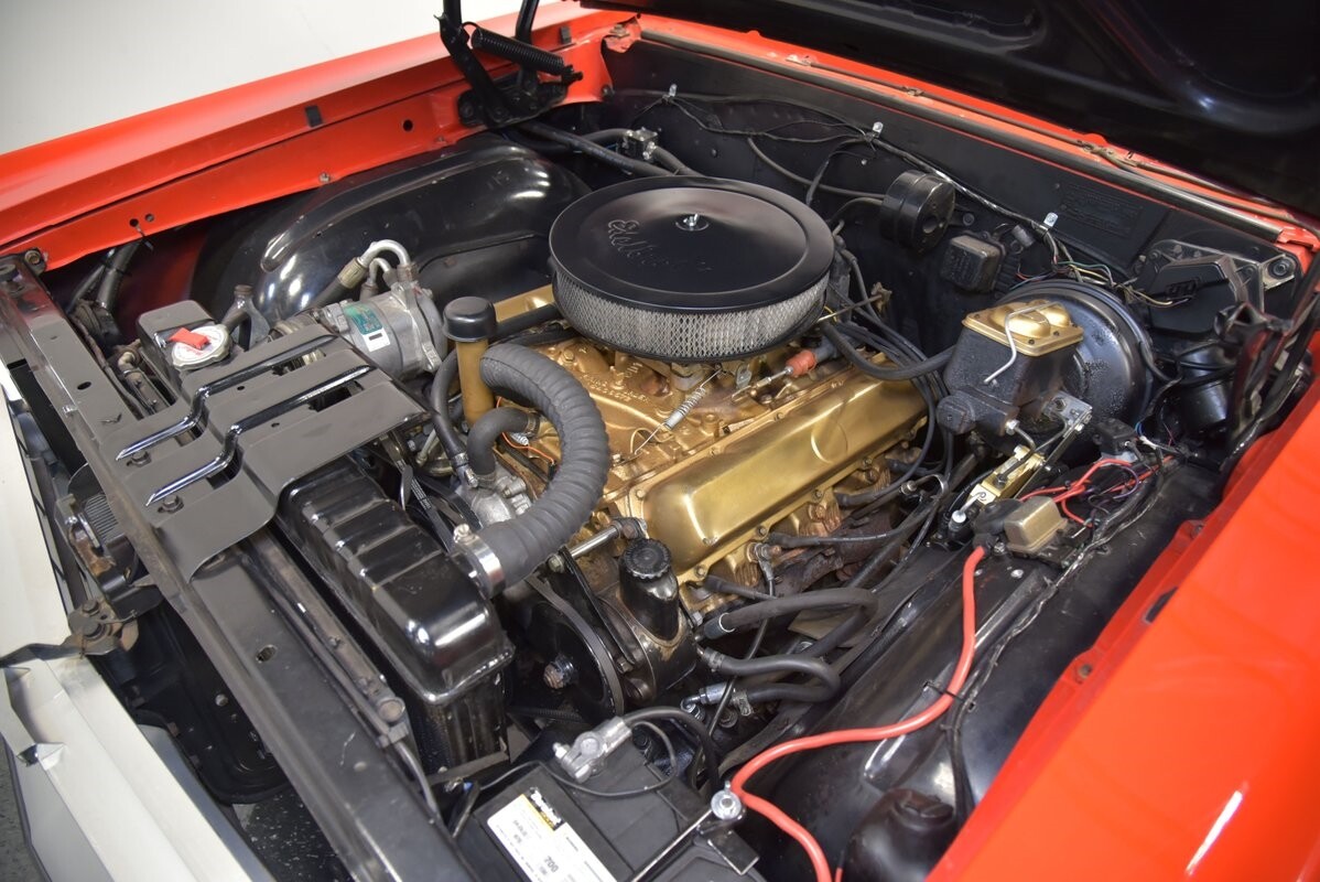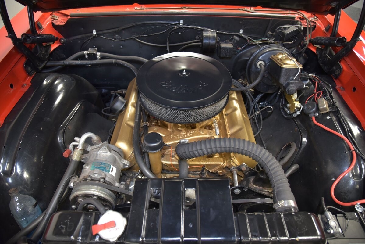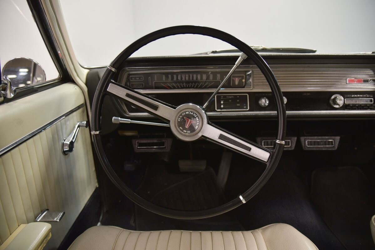 Under the hood is the 330 cubic-inch V8. We love this motor because it was the debut of a generation of the Rocket V8 that was one of the most successful in Oldsmobile's history. It has the right classic style with the golden block and matching valve covers. The V8 inhales through a four-barrel carburetor, and it exhales with a sweet rumble of the dual exhaust. It has been properly maintained, and the way this one runs strong reaffirms proper care. And the reason why we like this one so much for a cruiser is that it feels quite solid on the road. That's thanks to features like an upgraded tubular A-arm front end, power steering, power brakes, front discs, and an automatic transmission.