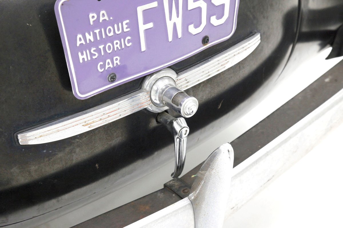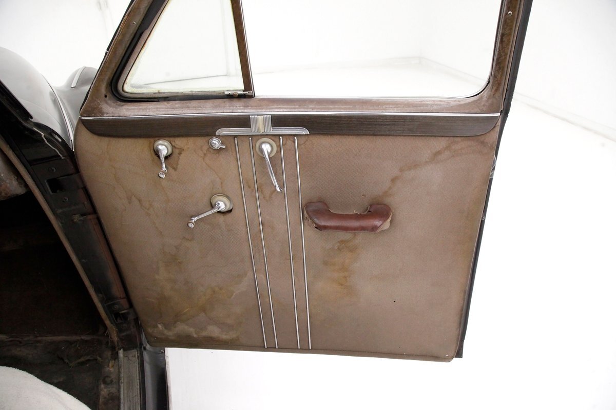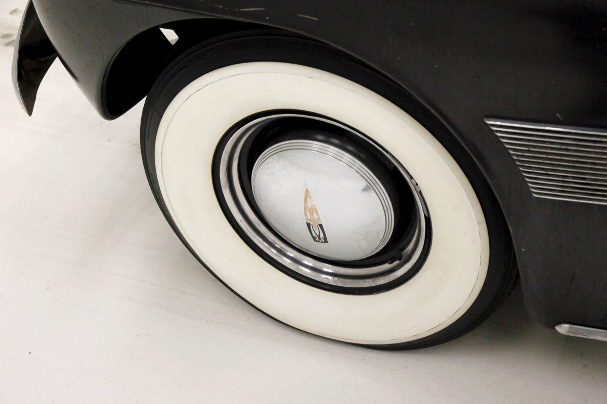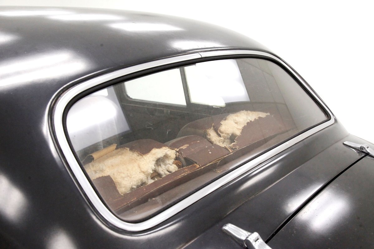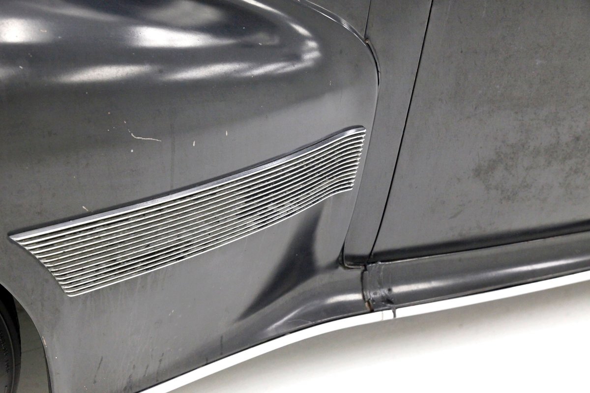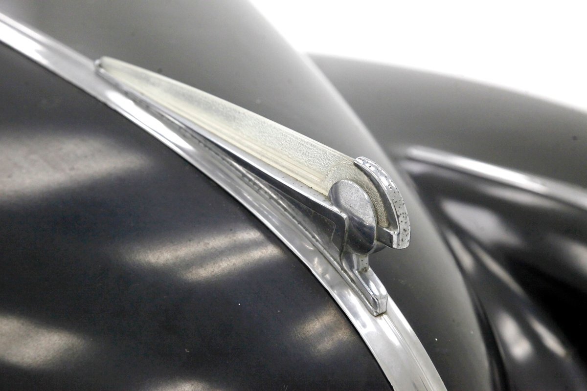 All sides have their highlight features including the side view where trim spears run from the beltline of the hood through the doors and to the rear quarter. Dressing the lowers of the pontoon style front fenders is a wide horizontal ribbed trimming that runs just a short distance rearward mid wheel well. Another teardrop pontooned fender dresses the rear of the car and accentuates the sloping lines of the rear of the car. On the back, a rounded trunk lid sports chromed exterior hinges, a license plate light and on either side a rectangular chrome trimmed tail light standing off from the body. An art deco styled bumper is below and has been sprayed with silver rattle can paint and shows some light surface rusting. Upfront wide curved front fenders wrap around the bulbous hood and the key feature is the distance between the headlights, which has been greatly reduced for this design. A curved grille is in the center and another bumper, this time in chrome with guards and guard ties rests below the yellow tinted for lights. Split front windshield leads the way for the 4-door passenger compartment and we note the door handles neatly tucked into the trim spears at the belt line. On all 4 corners we see wide whites wrapping black steel wheels with polished trim rings and dog dish caps. The entirety of the body is finished in black with some rust pitting, as well as cracking and a few dings, and some repaired areas of surface rust.