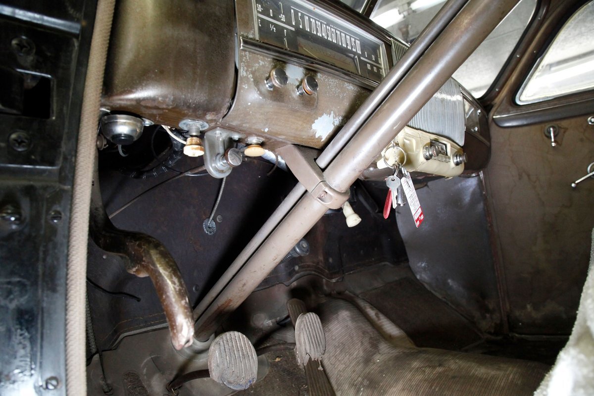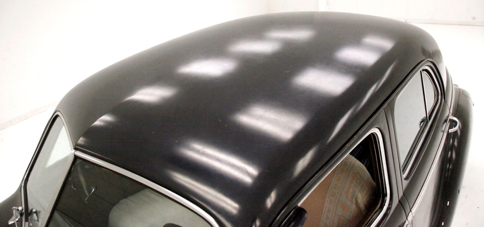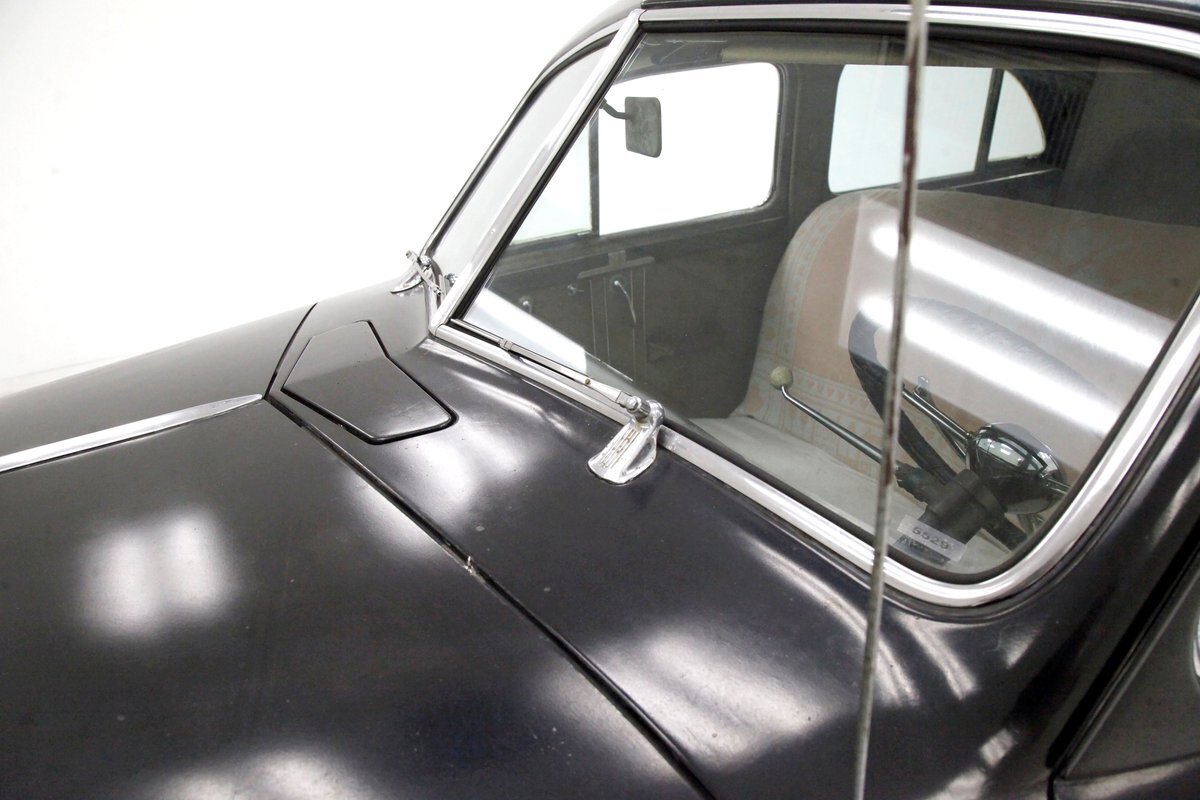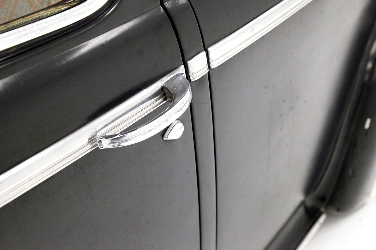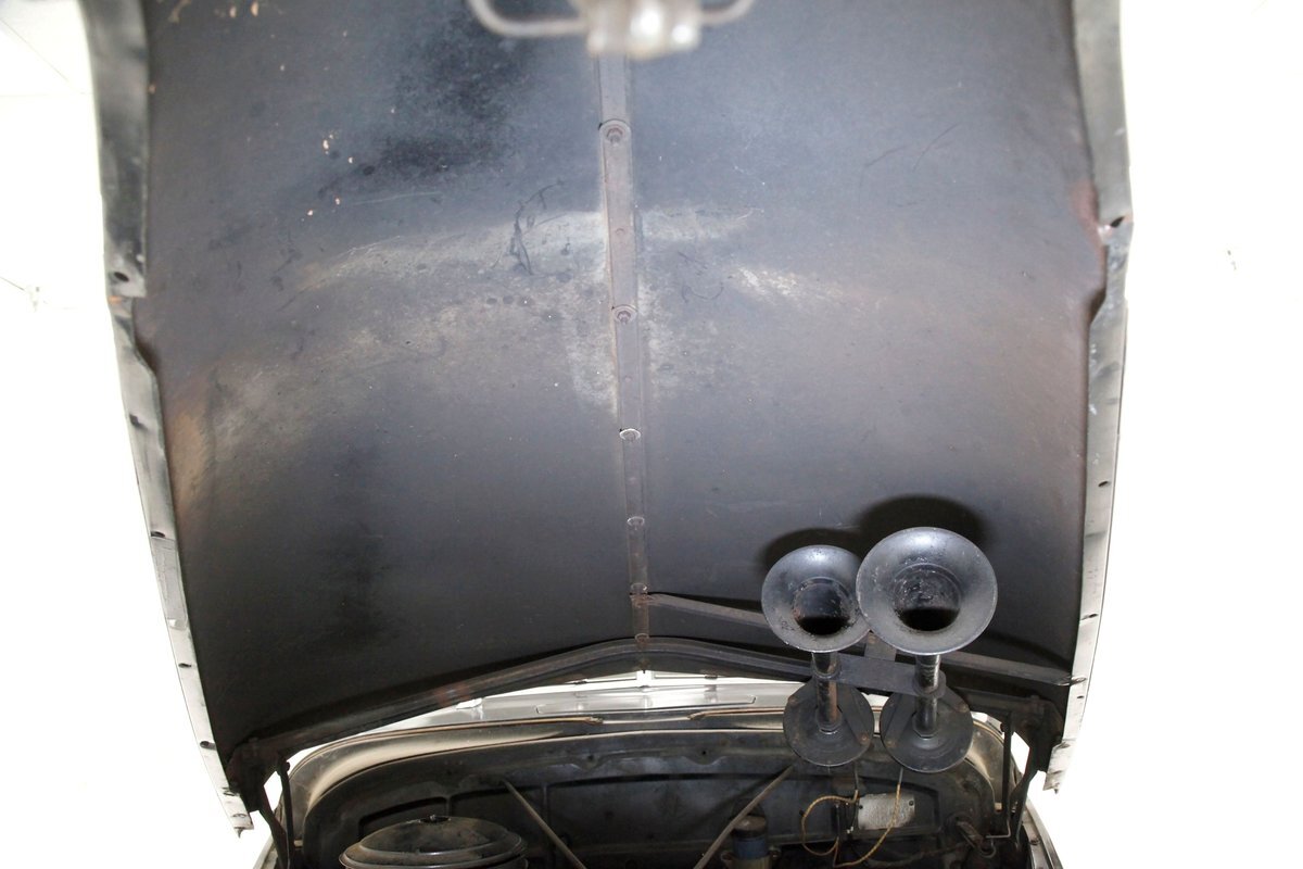 All sides have their highlight features including the side view where trim spears run from the beltline of the hood through the doors and to the rear quarter. Dressing the lowers of the pontoon style front fenders is a wide horizontal ribbed trimming that runs just a short distance rearward mid wheel well. Another teardrop pontooned fender dresses the rear of the car and accentuates the sloping lines of the rear of the car. On the back, a rounded trunk lid sports chromed exterior hinges, a license plate light and on either side a rectangular chrome trimmed tail light standing off from the body. An art deco styled bumper is below and has been sprayed with silver rattle can paint and shows some light surface rusting. Upfront wide curved front fenders wrap around the bulbous hood and the key feature is the distance between the headlights, which has been greatly reduced for this design. A curved grille is in the center and another bumper, this time in chrome with guards and guard ties rests below the yellow tinted for lights. Split front windshield leads the way for the 4-door passenger compartment and we note the door handles neatly tucked into the trim spears at the belt line. On all 4 corners we see wide whites wrapping black steel wheels with polished trim rings and dog dish caps. The entirety of the body is finished in black with some rust pitting, as well as cracking and a few dings, and some repaired areas of surface rust.