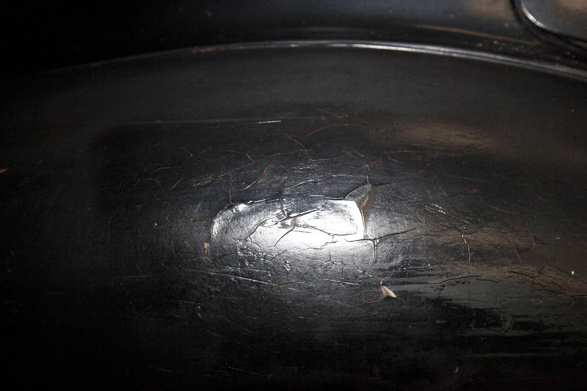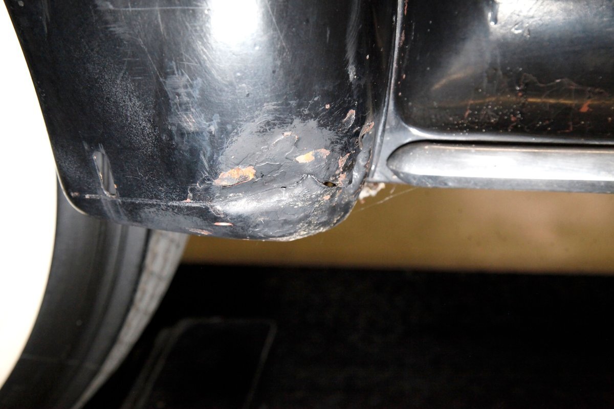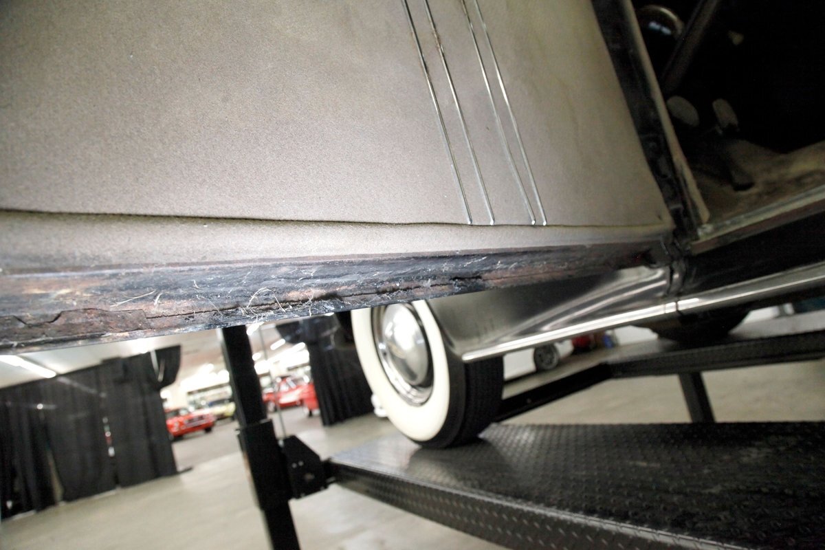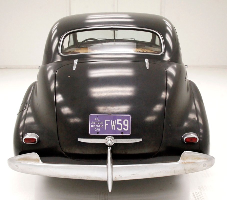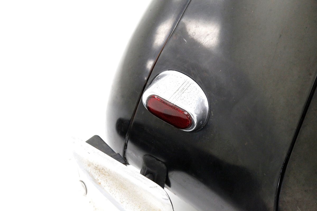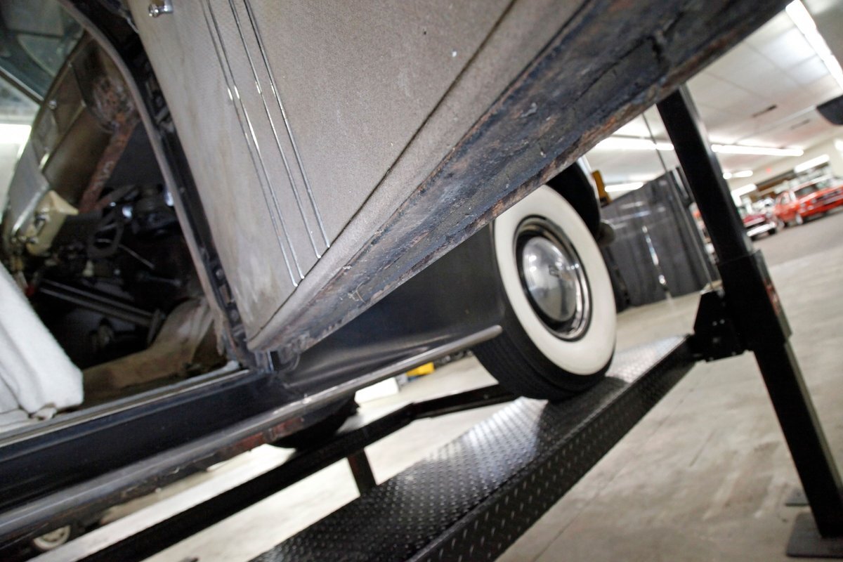 All sides have their highlight features including the side view where trim spears run from the beltline of the hood through the doors and to the rear quarter. Dressing the lowers of the pontoon style front fenders is a wide horizontal ribbed trimming that runs just a short distance rearward mid wheel well. Another teardrop pontooned fender dresses the rear of the car and accentuates the sloping lines of the rear of the car. On the back, a rounded trunk lid sports chromed exterior hinges, a license plate light and on either side a rectangular chrome trimmed tail light standing off from the body. An art deco styled bumper is below and has been sprayed with silver rattle can paint and shows some light surface rusting. Upfront wide curved front fenders wrap around the bulbous hood and the key feature is the distance between the headlights, which has been greatly reduced for this design. A curved grille is in the center and another bumper, this time in chrome with guards and guard ties rests below the yellow tinted for lights. Split front windshield leads the way for the 4-door passenger compartment and we note the door handles neatly tucked into the trim spears at the belt line. On all 4 corners we see wide whites wrapping black steel wheels with polished trim rings and dog dish caps. The entirety of the body is finished in black with some rust pitting, as well as cracking and a few dings, and some repaired areas of surface rust.