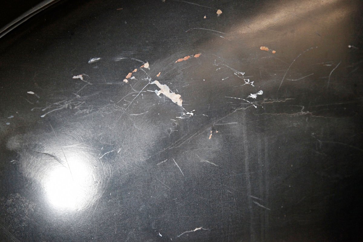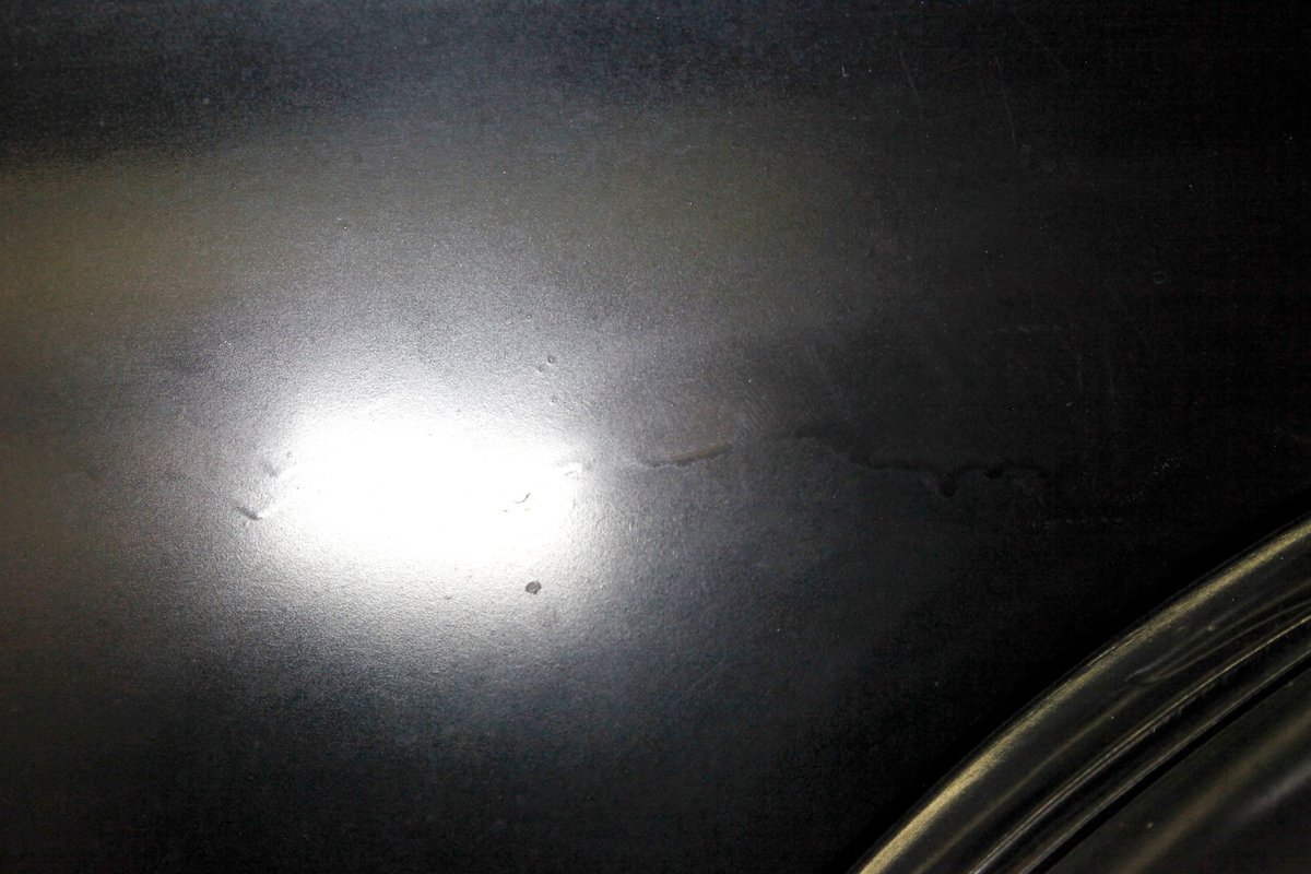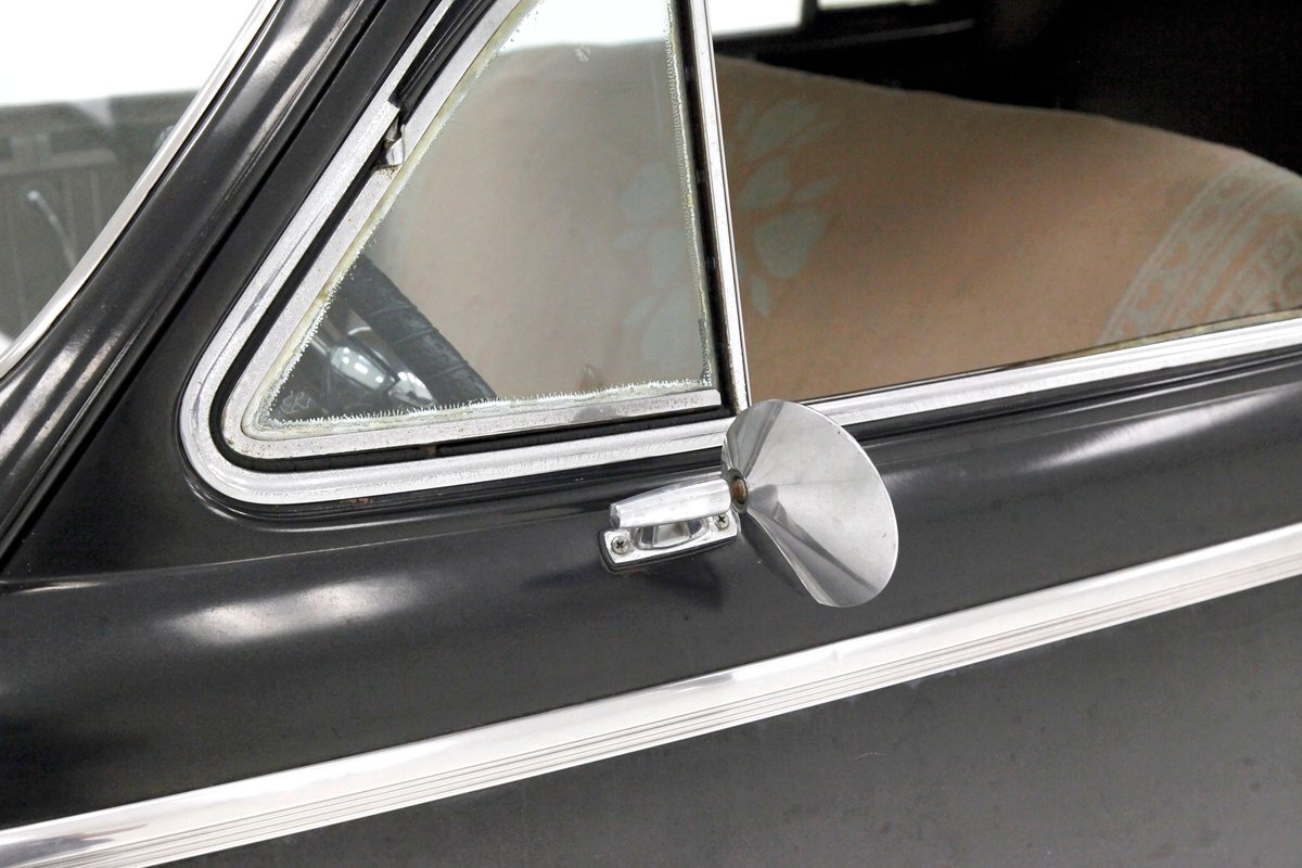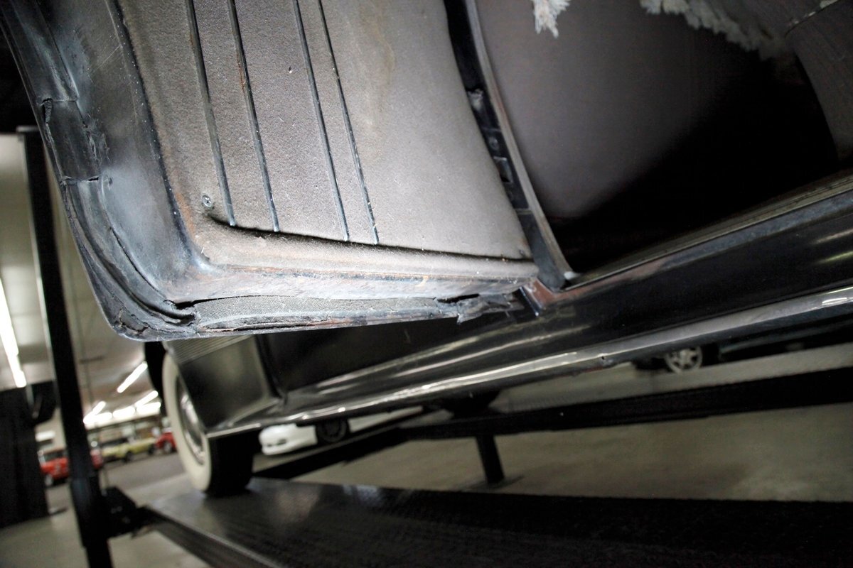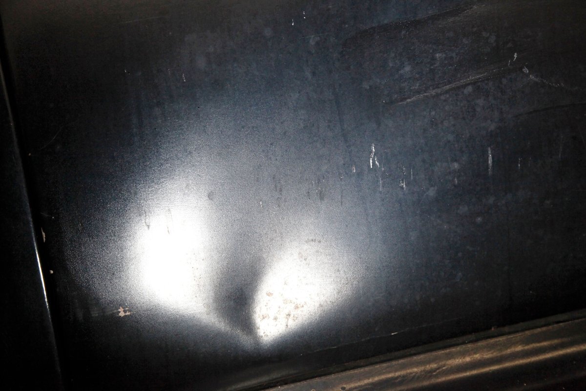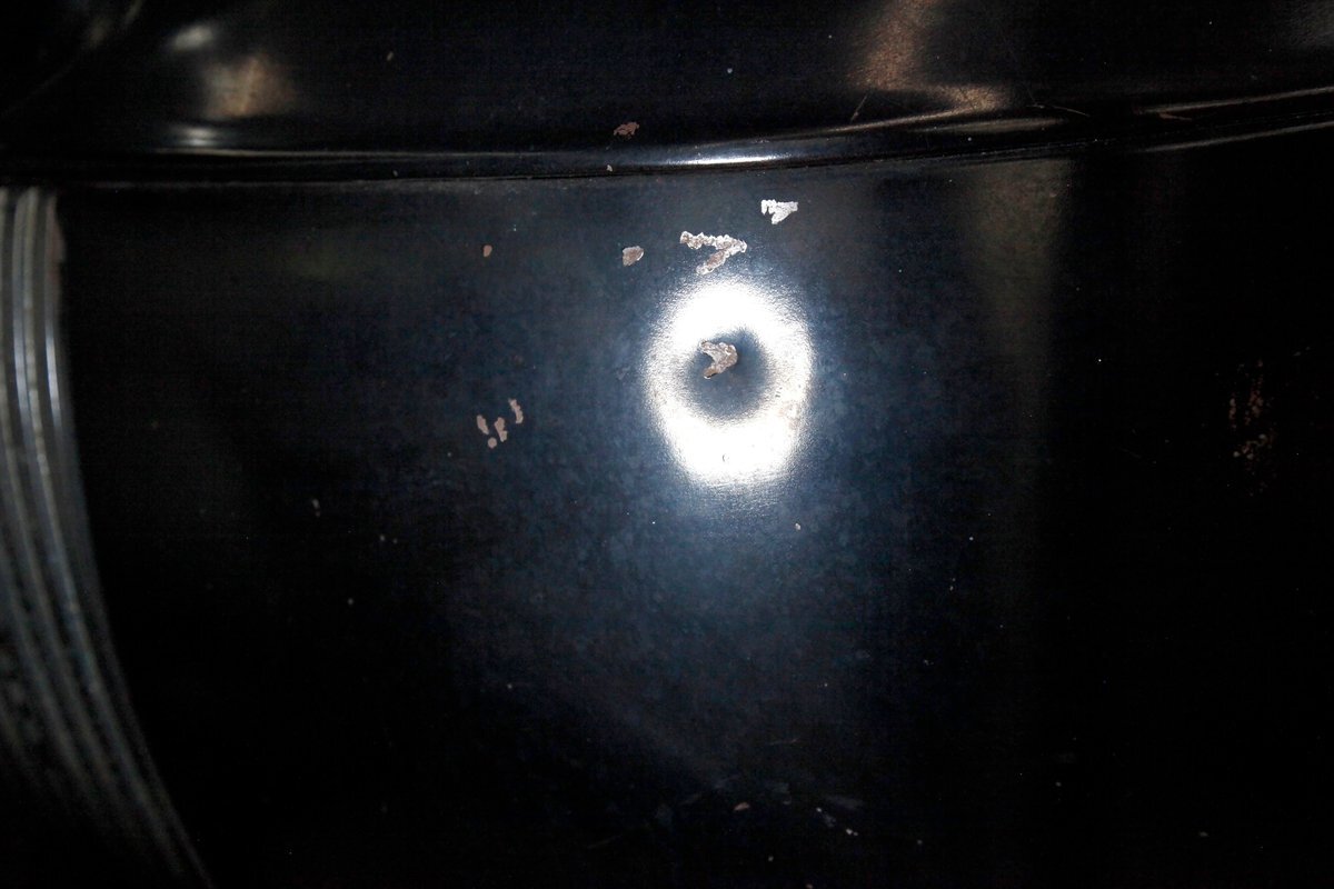 All sides have their highlight features including the side view where trim spears run from the beltline of the hood through the doors and to the rear quarter. Dressing the lowers of the pontoon style front fenders is a wide horizontal ribbed trimming that runs just a short distance rearward mid wheel well. Another teardrop pontooned fender dresses the rear of the car and accentuates the sloping lines of the rear of the car. On the back, a rounded trunk lid sports chromed exterior hinges, a license plate light and on either side a rectangular chrome trimmed tail light standing off from the body. An art deco styled bumper is below and has been sprayed with silver rattle can paint and shows some light surface rusting. Upfront wide curved front fenders wrap around the bulbous hood and the key feature is the distance between the headlights, which has been greatly reduced for this design. A curved grille is in the center and another bumper, this time in chrome with guards and guard ties rests below the yellow tinted for lights. Split front windshield leads the way for the 4-door passenger compartment and we note the door handles neatly tucked into the trim spears at the belt line. On all 4 corners we see wide whites wrapping black steel wheels with polished trim rings and dog dish caps. The entirety of the body is finished in black with some rust pitting, as well as cracking and a few dings, and some repaired areas of surface rust.