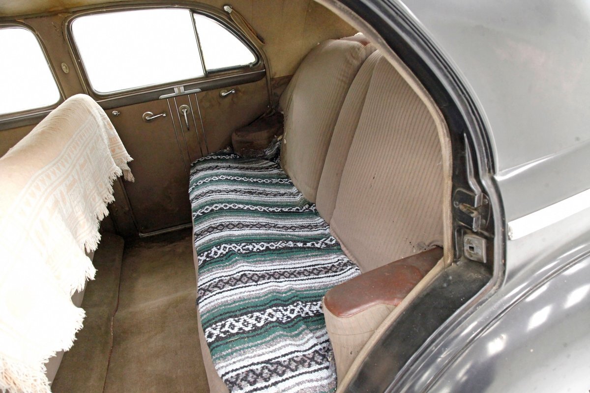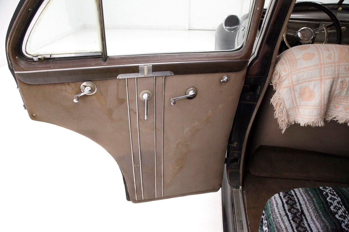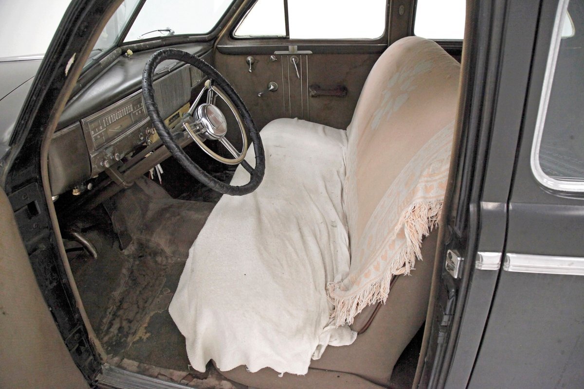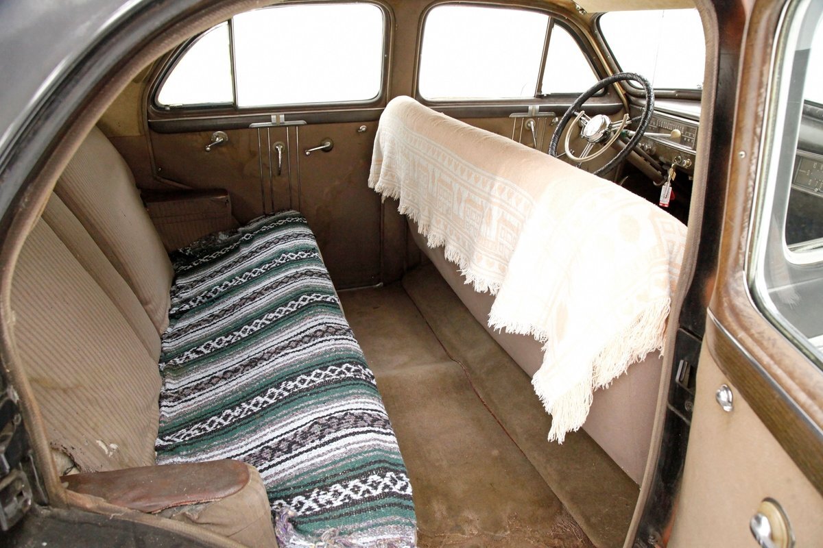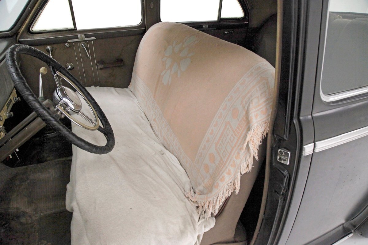 A swing of the door and we are greeted with a richly appointed door panel in fuzzy tan broadcloth as the background for chromed bakelite escutcheon cranks, a leather arm rest in dark brown, some metal painted faded faux wood grain above, and nicely chromed thin dividers showing an art deco design pattern. More broadcloth for the full benches inside which are now covered with blankets with the condition underneath unknown. For the rear bench, wider armrests grace the sides and there is plenty of legroom. Upfront we find more art deco styling with the use of rectangular chrome bezels, a vertically ribbed chromed dash front, a brown dash top and a brown instrument cluster background highlighted by clear and clean white lettering. On the passenger's side is a corresponding rectangle with a clock in the center. Below the dash is a lineup of more chrome in the form of an ashtray and more knobs and embellishments of the art deco style and the factory AM radio within a yellowed and cracked bakelite band. Below the dash is a heater box which hovers above worn and soiled black ribbed rubber flooring. The headliner is mohair and shows some signs of slight water staining but remains tight.