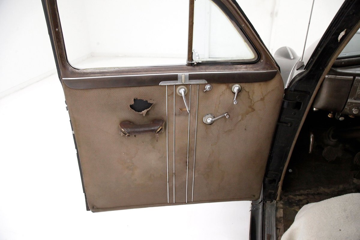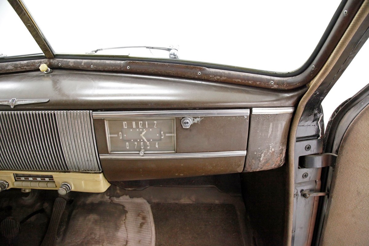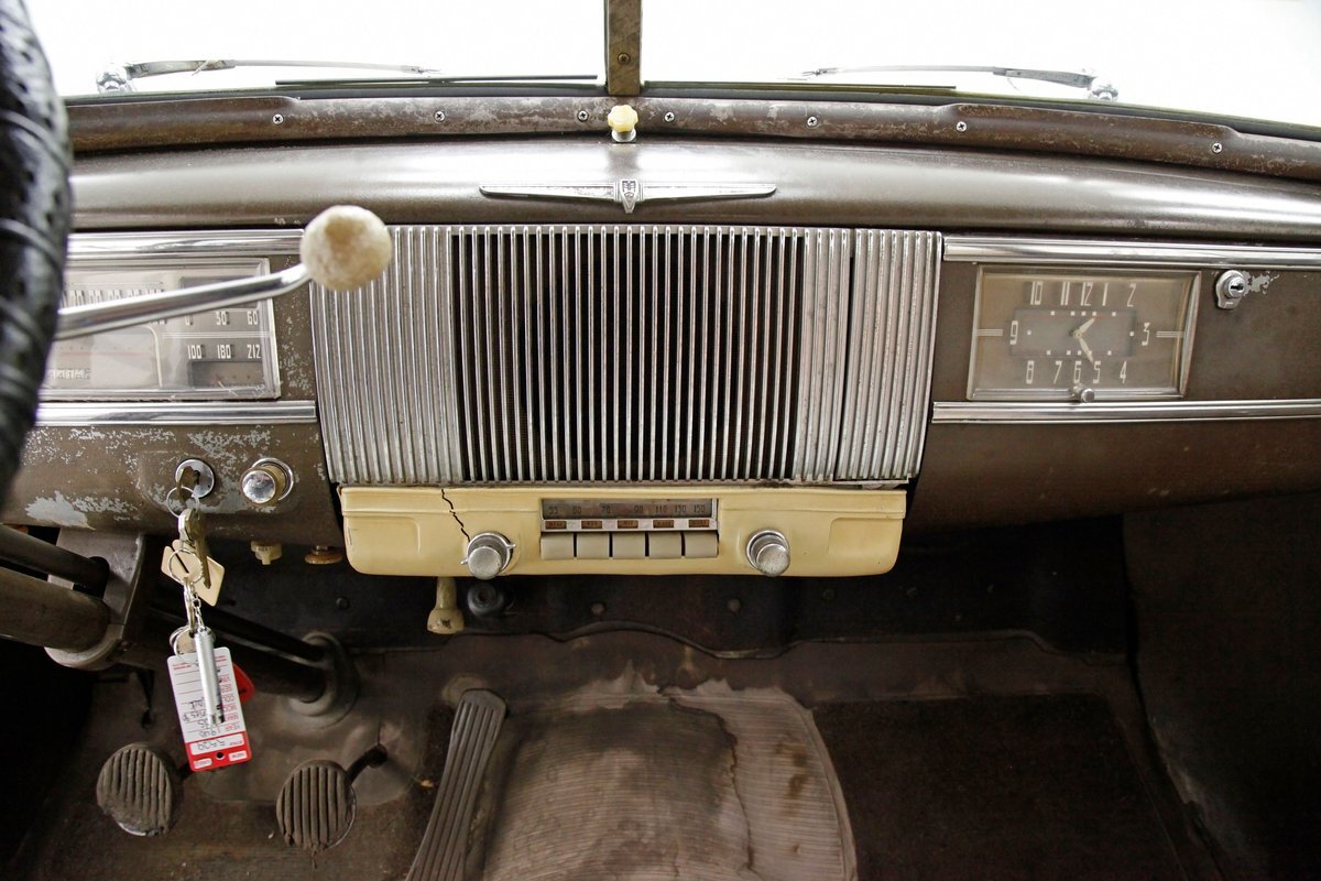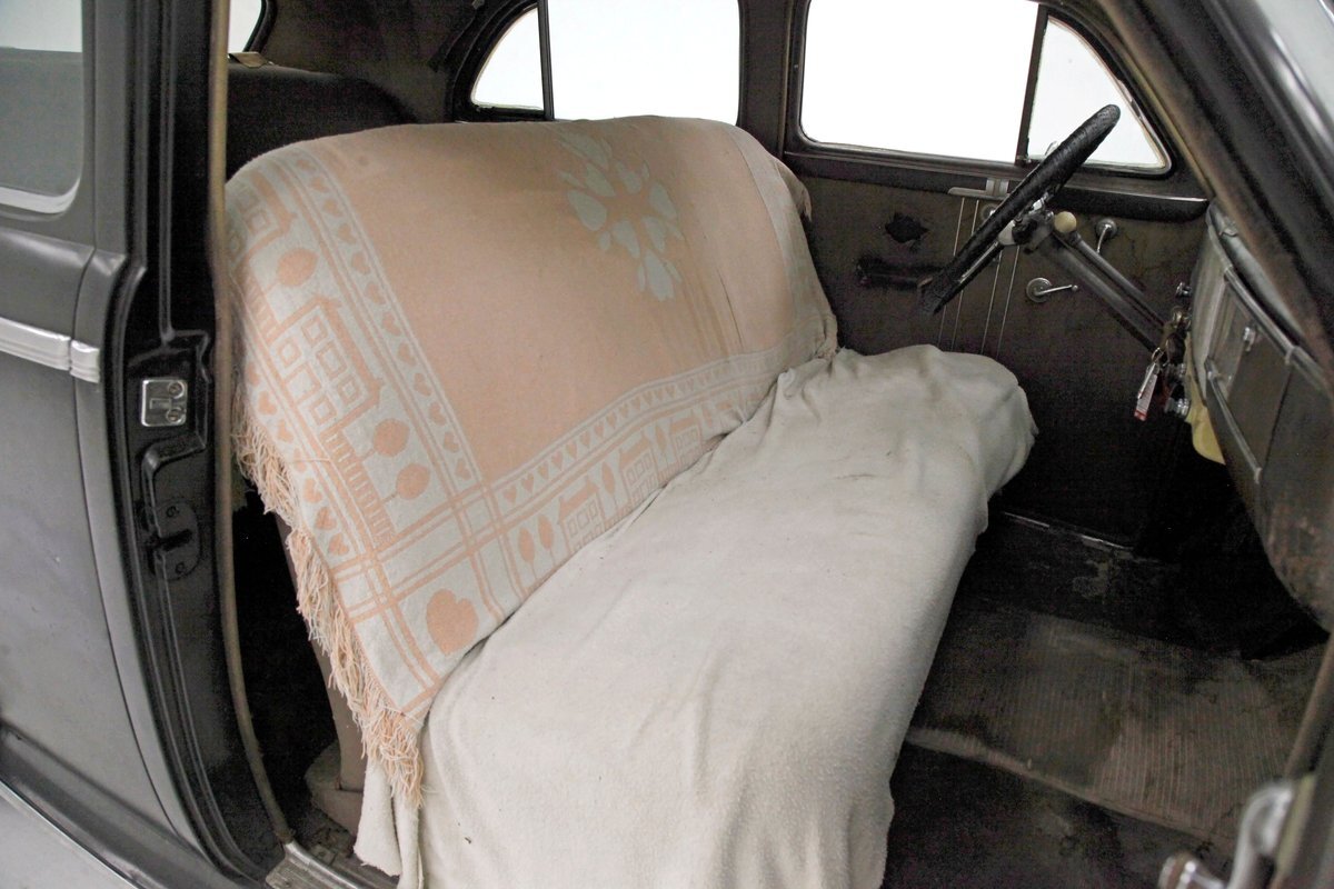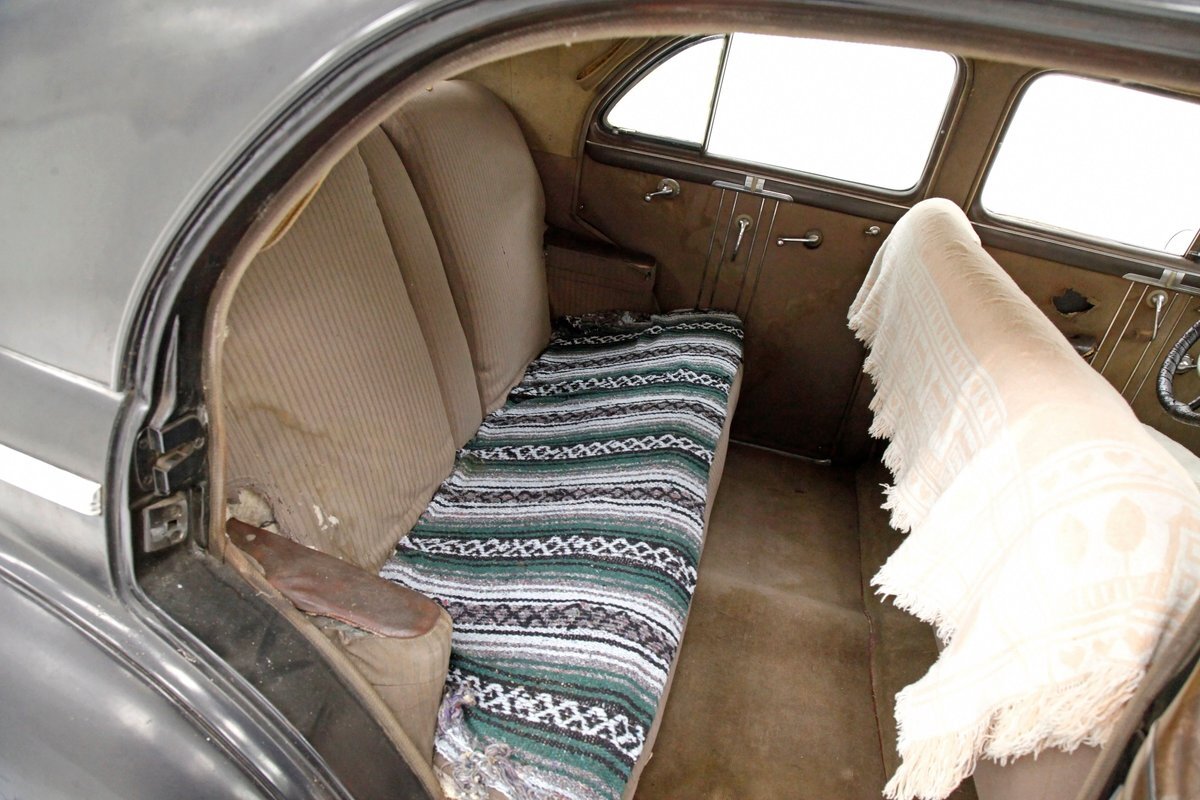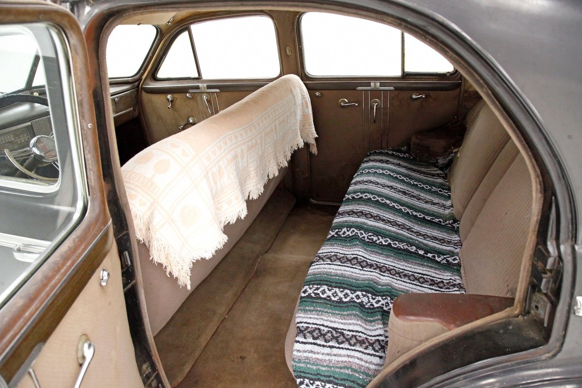 A swing of the door and we are greeted with a richly appointed door panel in fuzzy tan broadcloth as the background for chromed bakelite escutcheon cranks, a leather arm rest in dark brown, some metal painted faded faux wood grain above, and nicely chromed thin dividers showing an art deco design pattern. More broadcloth for the full benches inside which are now covered with blankets with the condition underneath unknown. For the rear bench, wider armrests grace the sides and there is plenty of legroom. Upfront we find more art deco styling with the use of rectangular chrome bezels, a vertically ribbed chromed dash front, a brown dash top and a brown instrument cluster background highlighted by clear and clean white lettering. On the passenger's side is a corresponding rectangle with a clock in the center. Below the dash is a lineup of more chrome in the form of an ashtray and more knobs and embellishments of the art deco style and the factory AM radio within a yellowed and cracked bakelite band. Below the dash is a heater box which hovers above worn and soiled black ribbed rubber flooring. The headliner is mohair and shows some signs of slight water staining but remains tight.