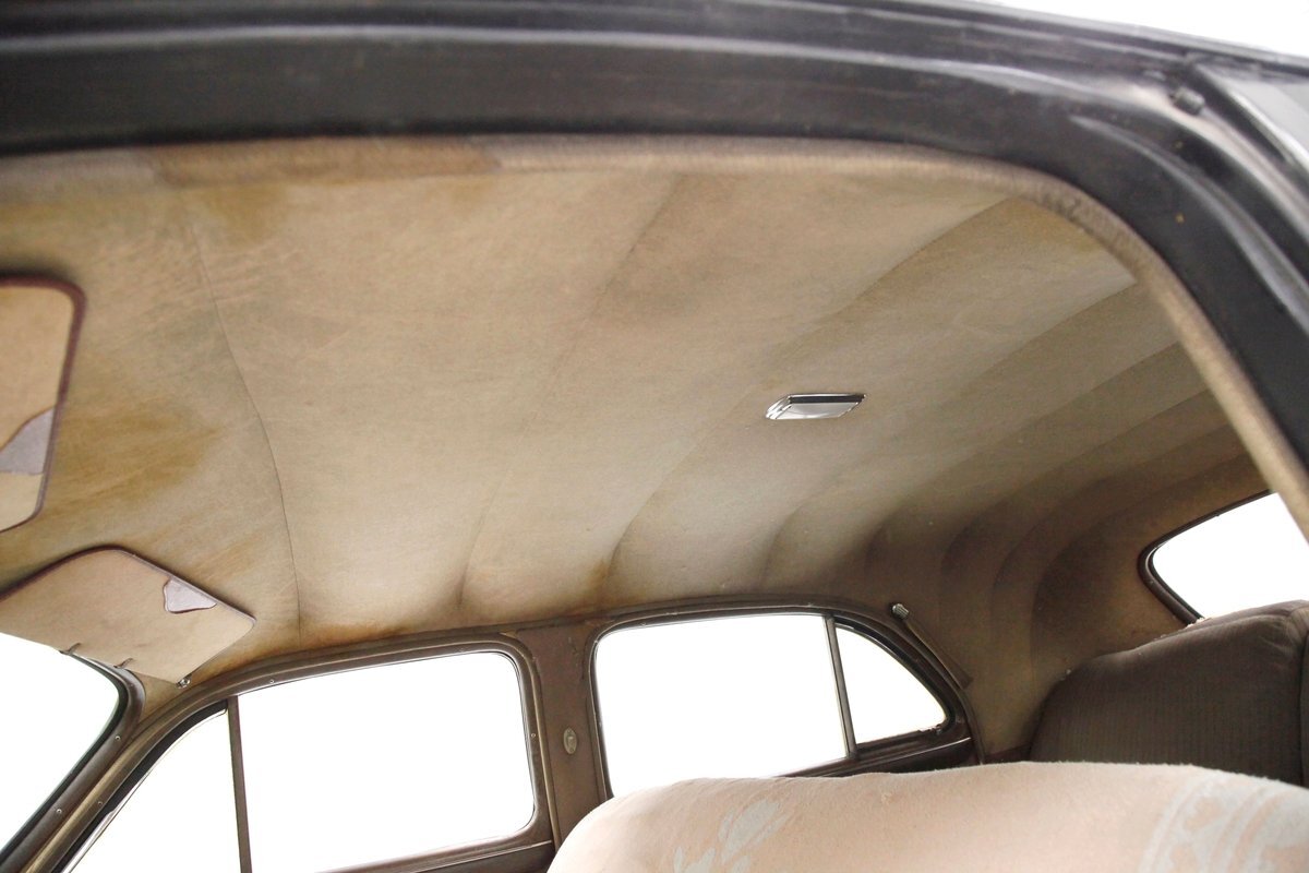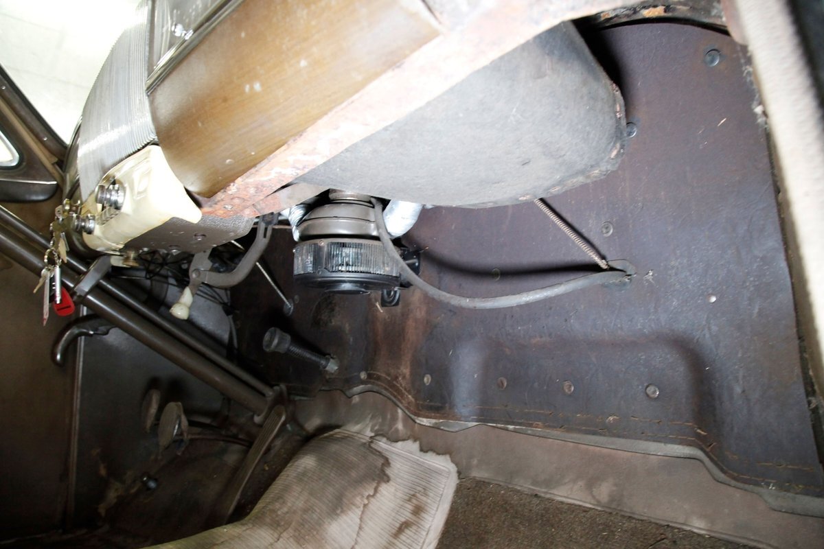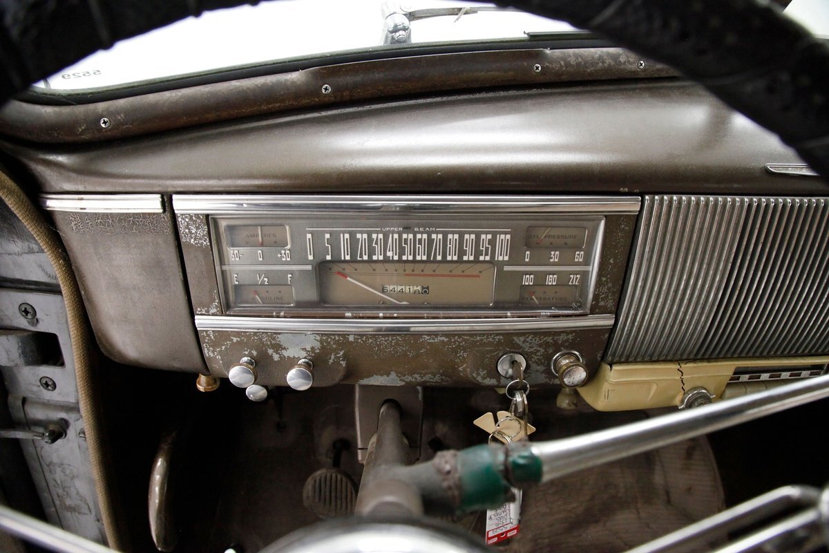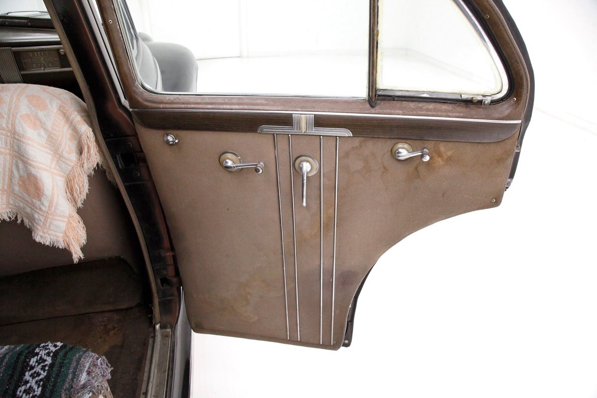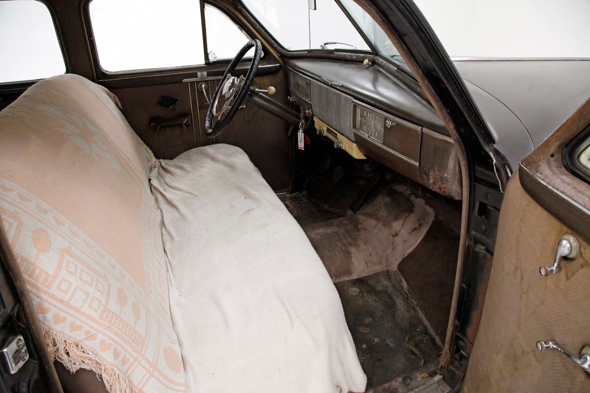 A swing of the door and we are greeted with a richly appointed door panel in fuzzy tan broadcloth as the background for chromed bakelite escutcheon cranks, a leather arm rest in dark brown, some metal painted faded faux wood grain above, and nicely chromed thin dividers showing an art deco design pattern. More broadcloth for the full benches inside which are now covered with blankets with the condition underneath unknown. For the rear bench, wider armrests grace the sides and there is plenty of legroom. Upfront we find more art deco styling with the use of rectangular chrome bezels, a vertically ribbed chromed dash front, a brown dash top and a brown instrument cluster background highlighted by clear and clean white lettering. On the passenger's side is a corresponding rectangle with a clock in the center. Below the dash is a lineup of more chrome in the form of an ashtray and more knobs and embellishments of the art deco style and the factory AM radio within a yellowed and cracked bakelite band. Below the dash is a heater box which hovers above worn and soiled black ribbed rubber flooring. The headliner is mohair and shows some signs of slight water staining but remains tight.