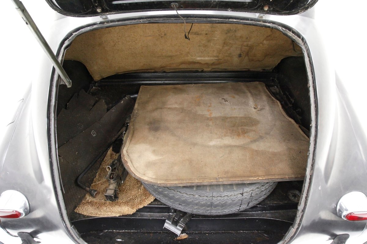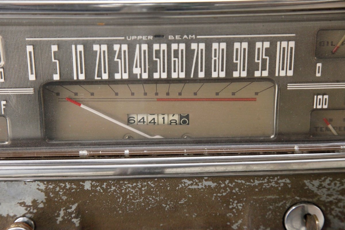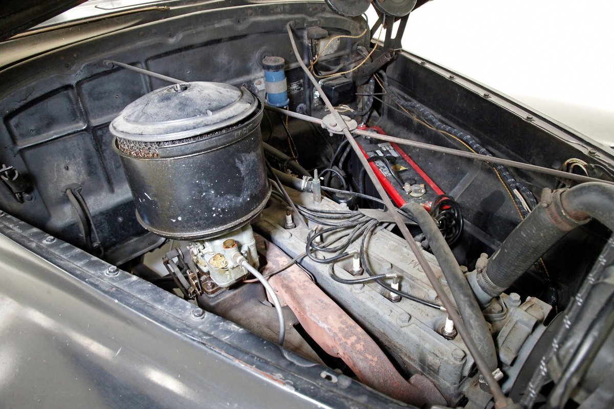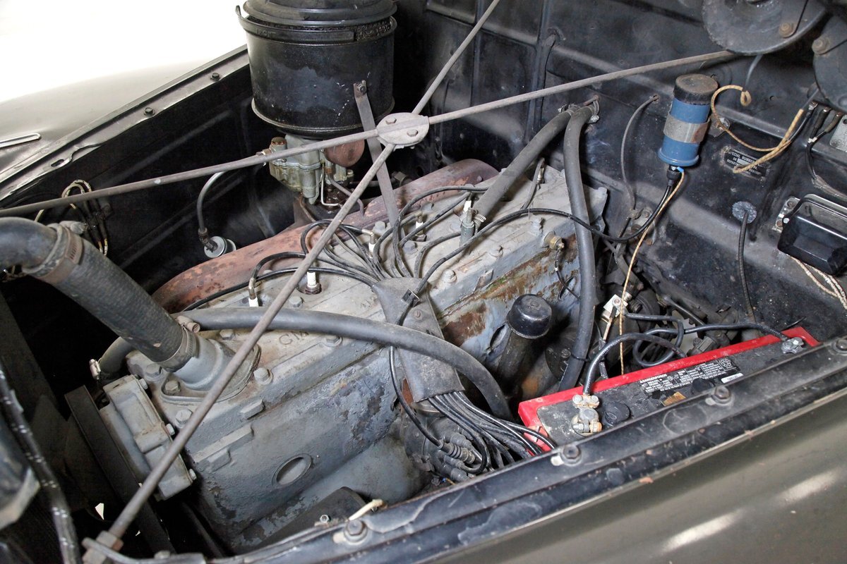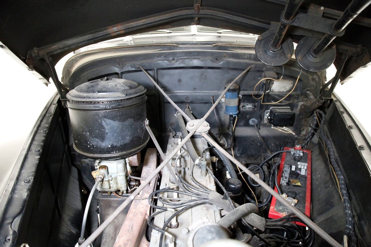 Under the long rounded hood we can see the 257ci inline 8 cylinder engine. This presents with a coating of gray paint and surface rust. It sports a rebuilt 1-barrel carburetor on top and has a 3-speed manual transmission on the back. The rear axle weighs in at a 4.30 ratio. All in an unrestored engine bay but with a recent coolant flush, new fuel pump and rebuilt generator.