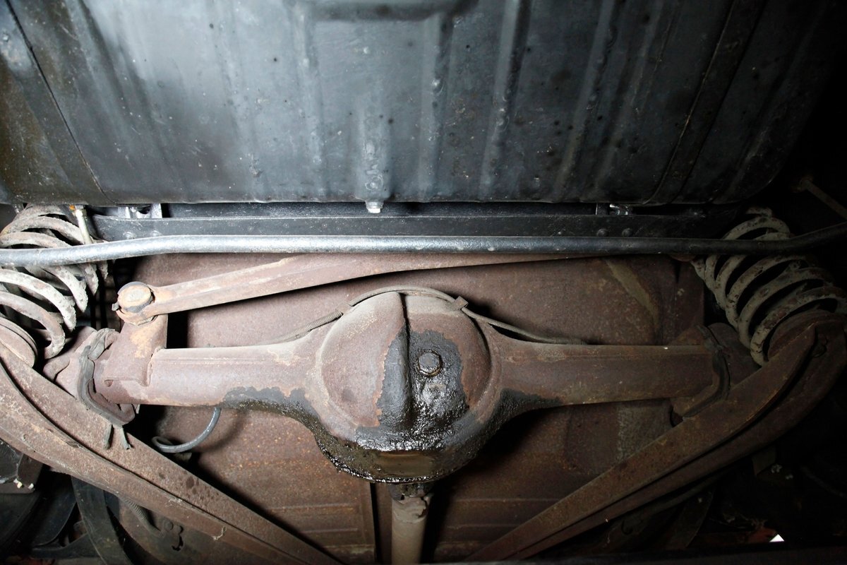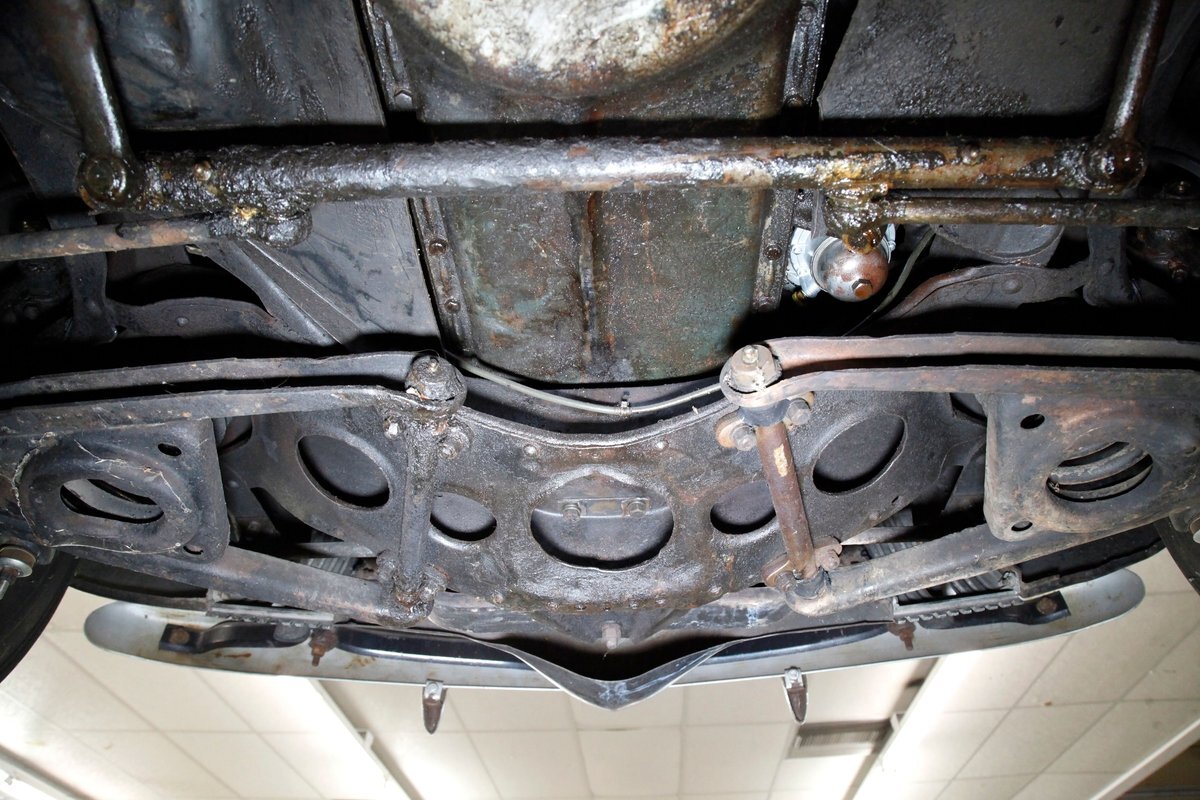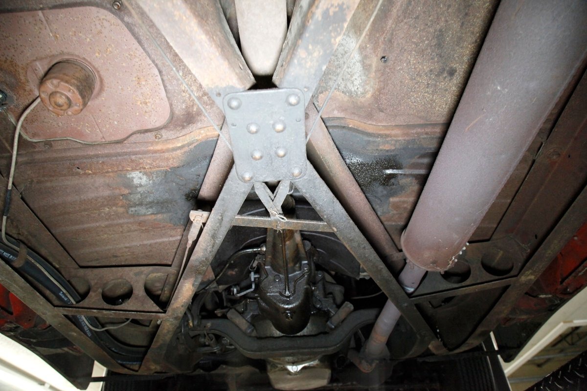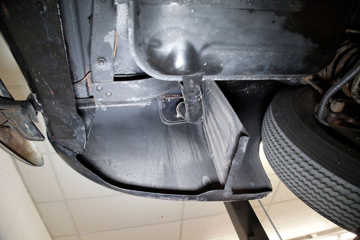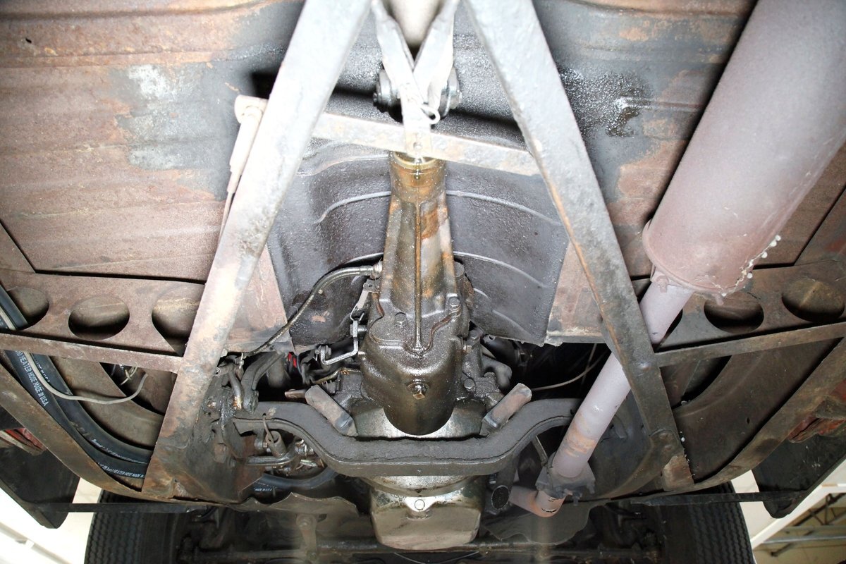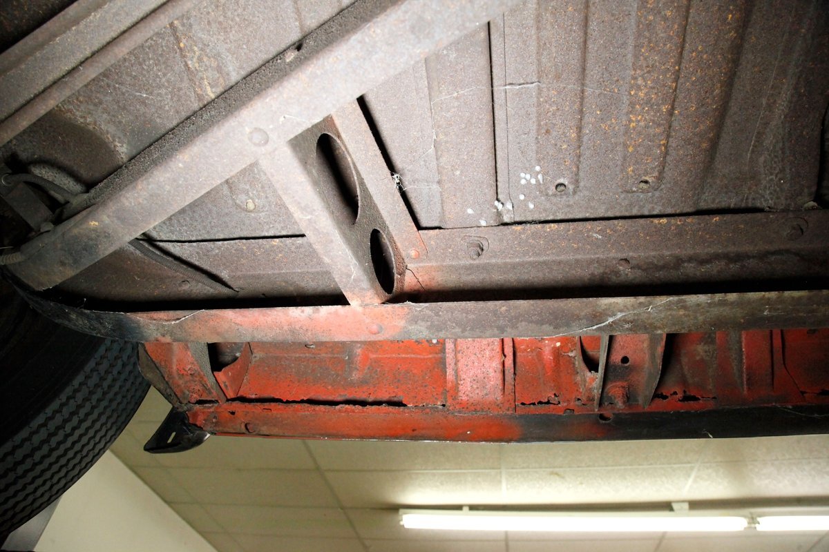 Underneath we spot a cleaned and resealed fuel tank attached to a surface rusted undercarriage. It is an X frame design and appears structurally sound. A coating of orange paint graces the metal on the rockers and shows a few areas of invasive rust near the lower pinch welds. A surface rusted single exhaust pipe runs from the engine rearward and is bolted to a stock style replacement muffler. Recently gone through drum brakes are noted all around and we see independent coil spring suspension in the front and a 3 link and coil spring in the rear.