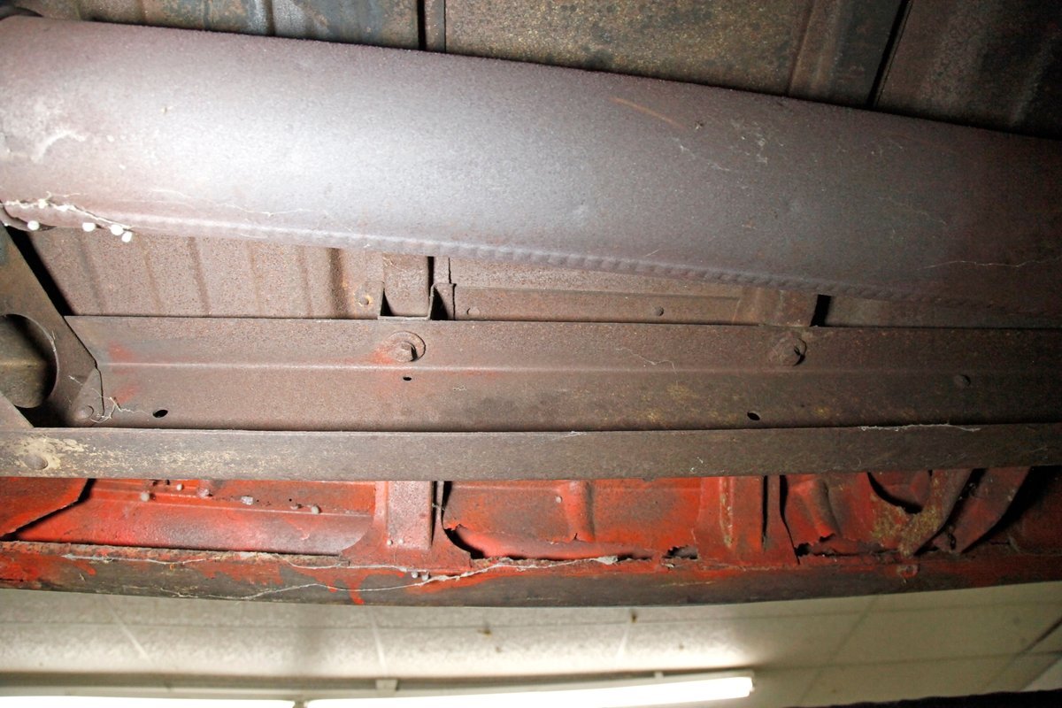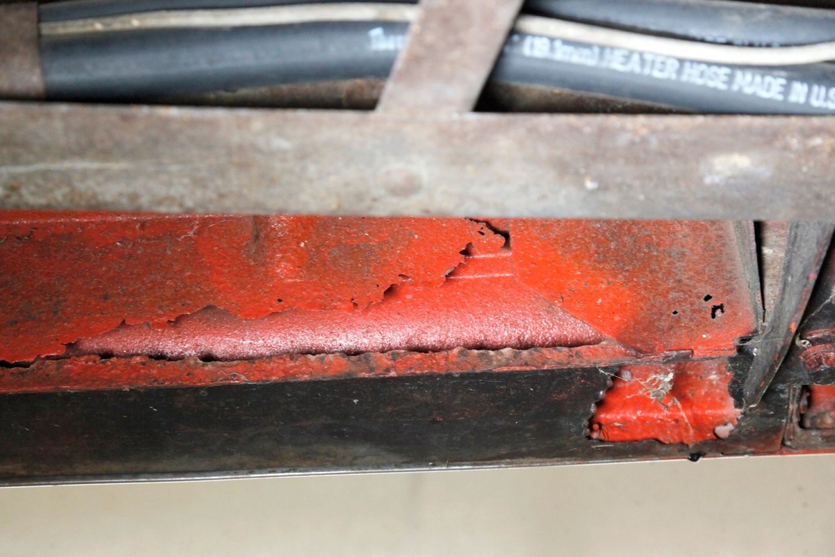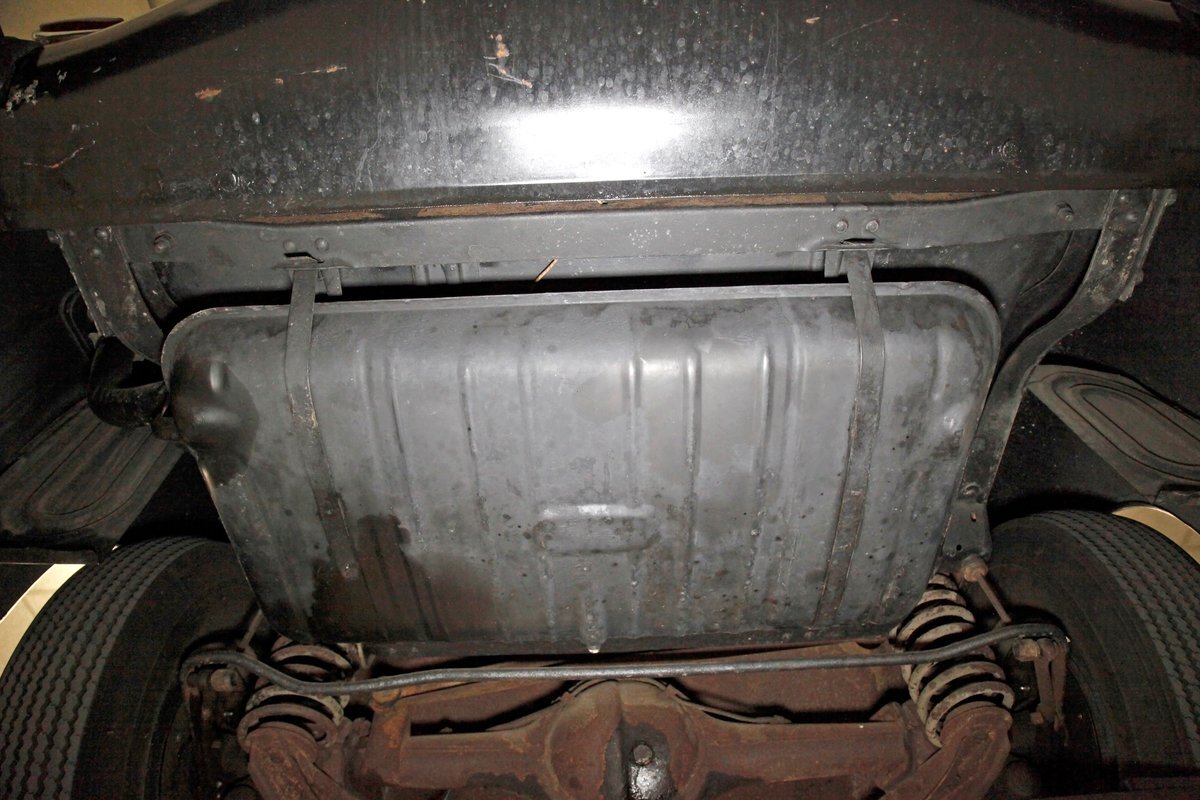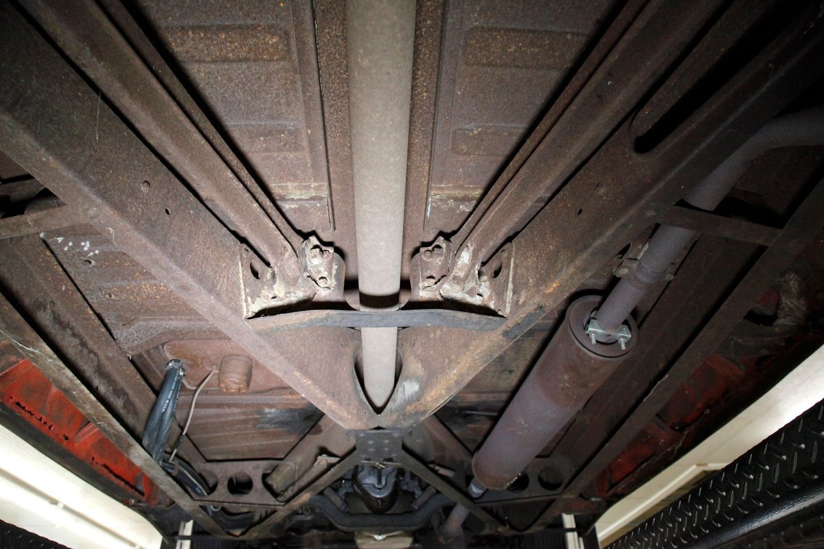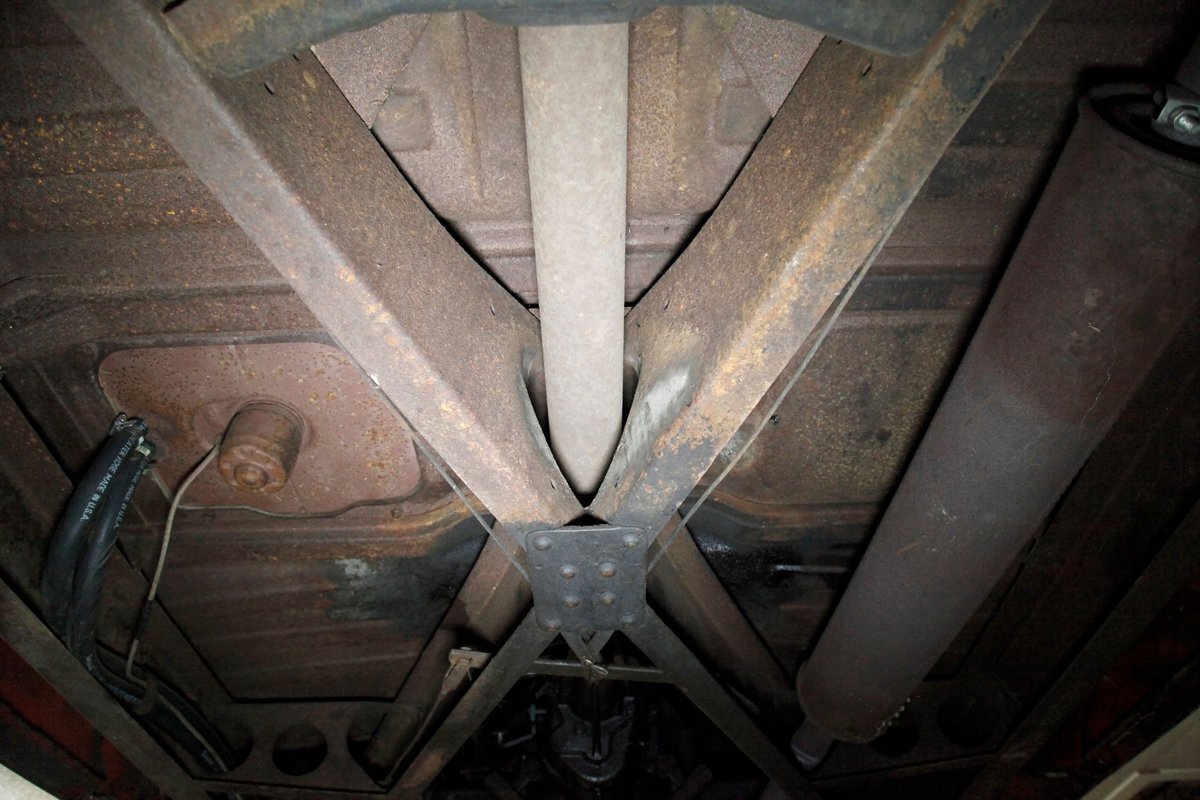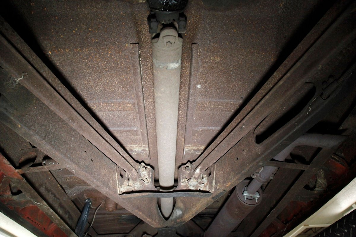 Underneath we spot a cleaned and resealed fuel tank attached to a surface rusted undercarriage. It is an X frame design and appears structurally sound. A coating of orange paint graces the metal on the rockers and shows a few areas of invasive rust near the lower pinch welds. A surface rusted single exhaust pipe runs from the engine rearward and is bolted to a stock style replacement muffler. Recently gone through drum brakes are noted all around and we see independent coil spring suspension in the front and a 3 link and coil spring in the rear.