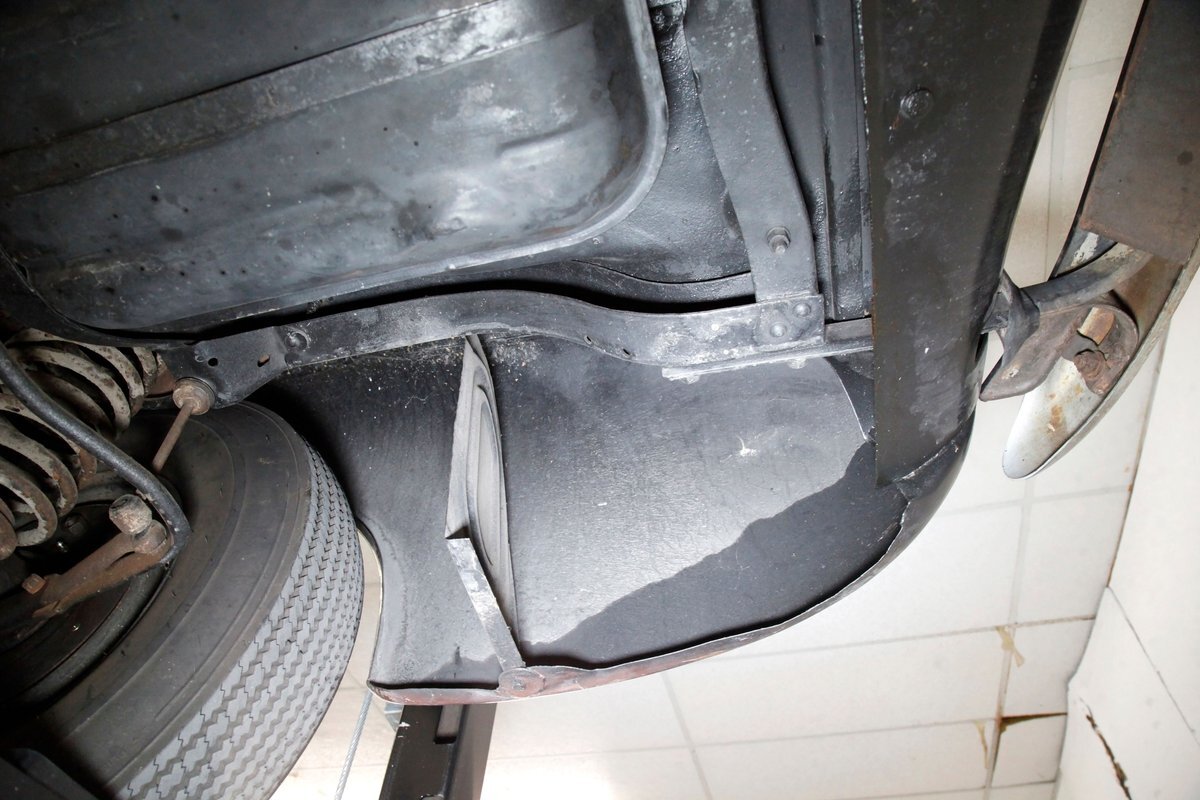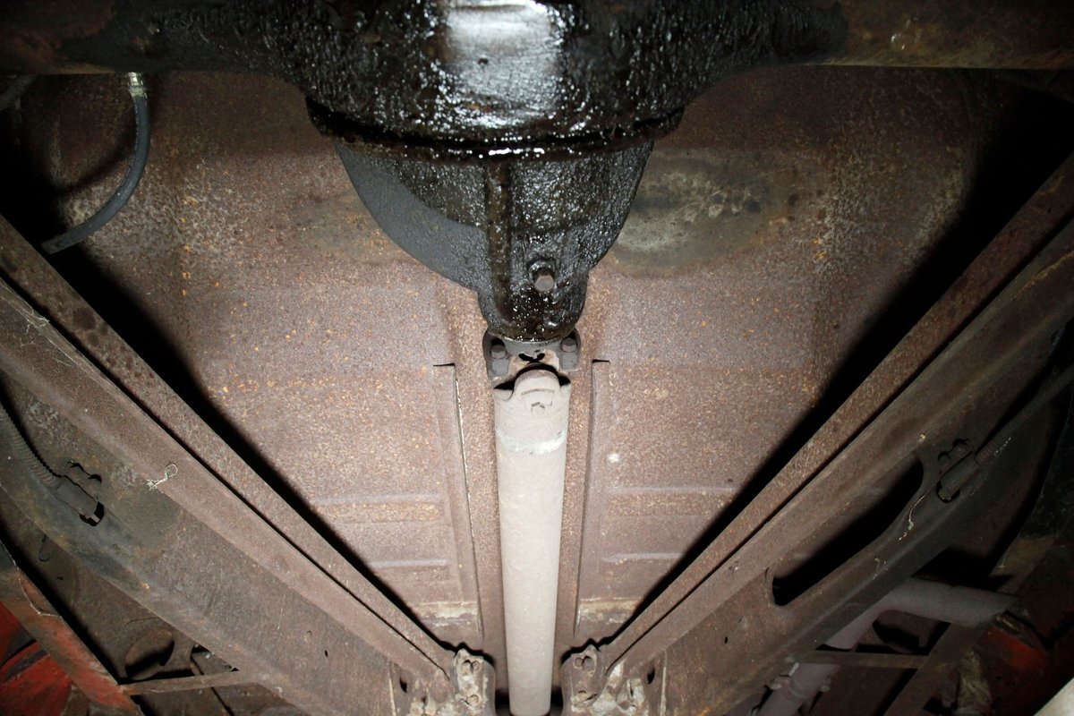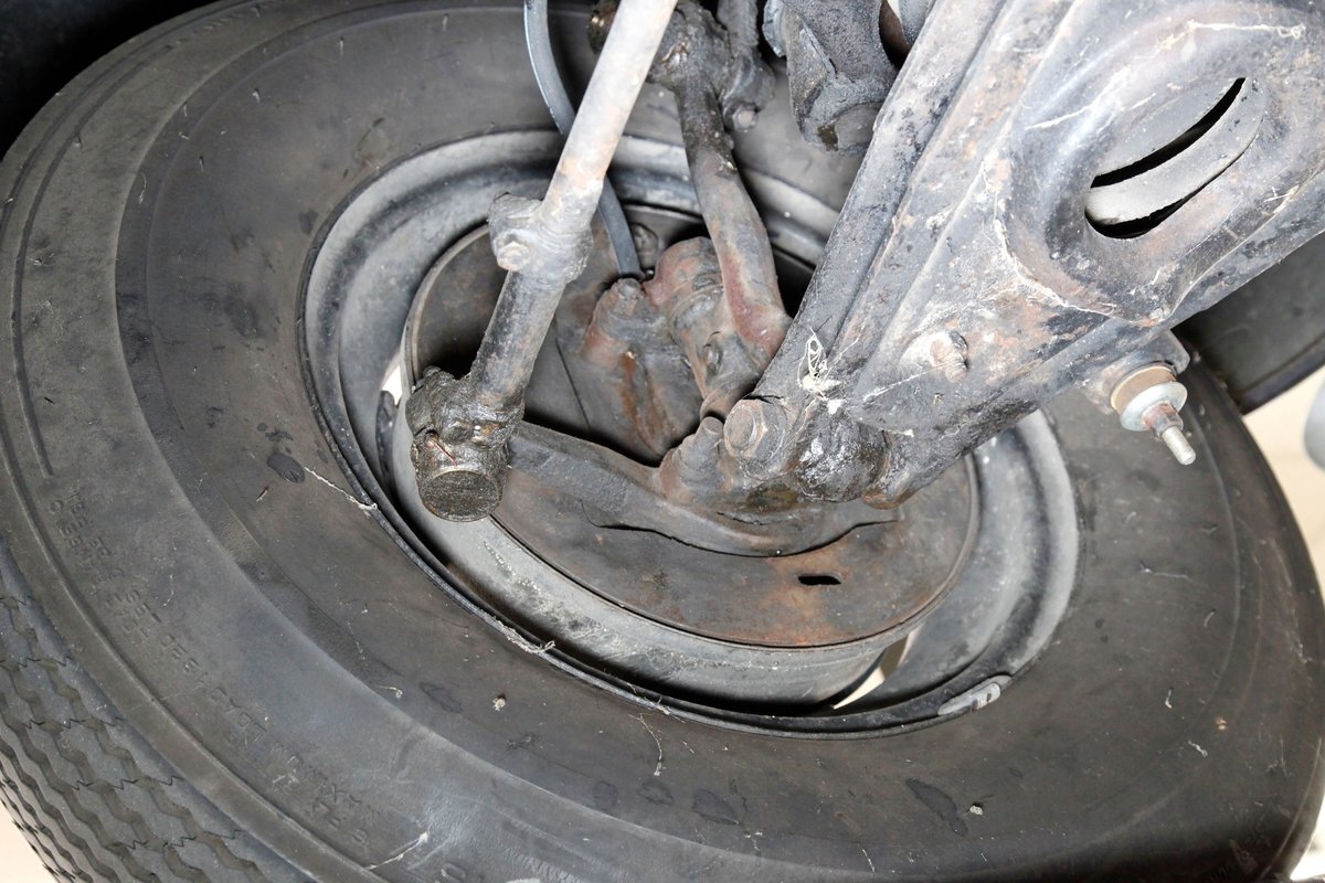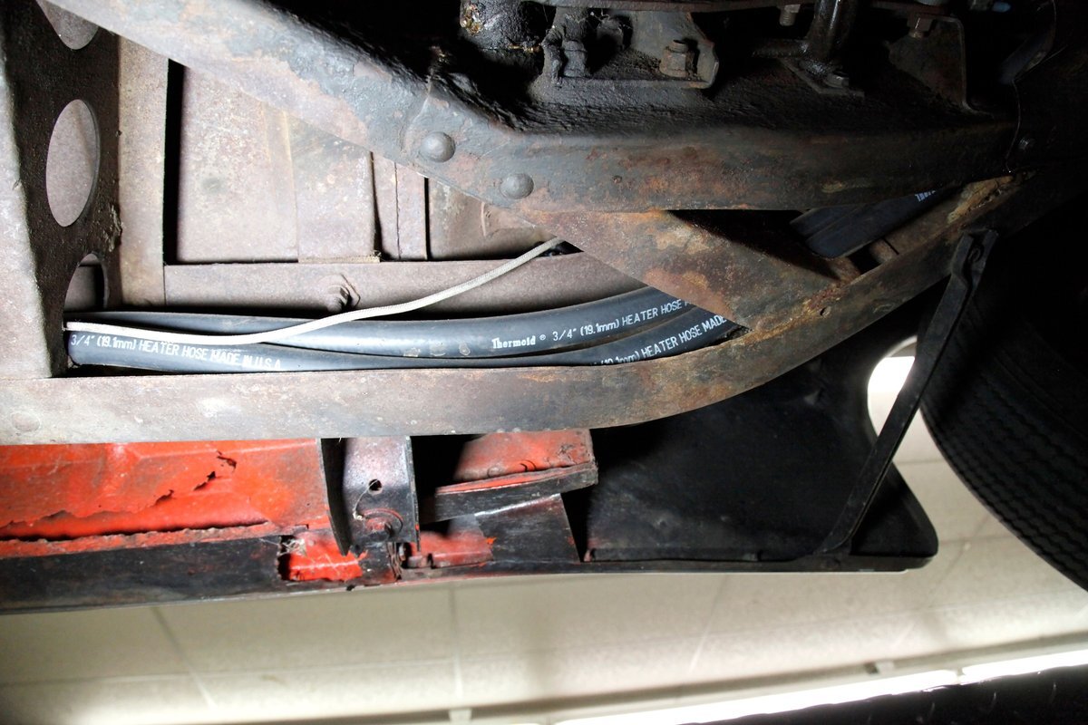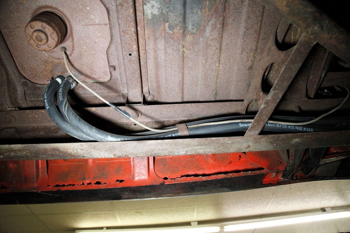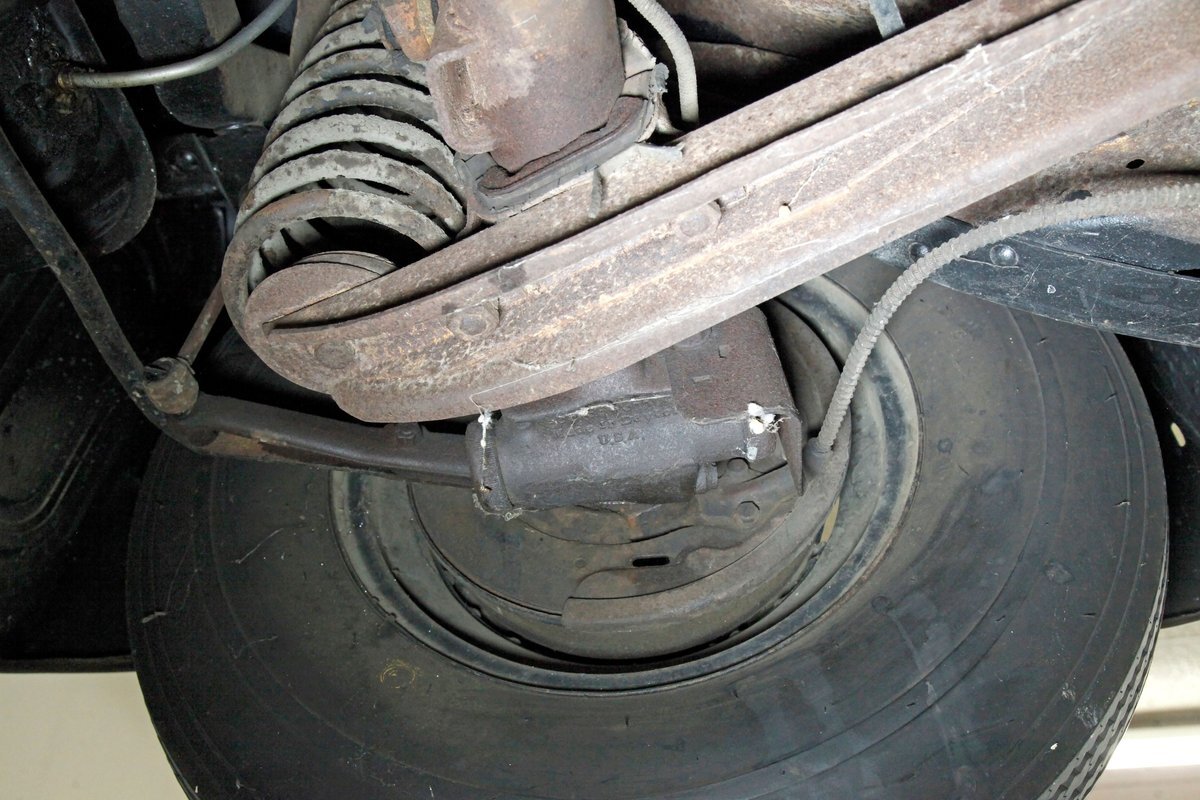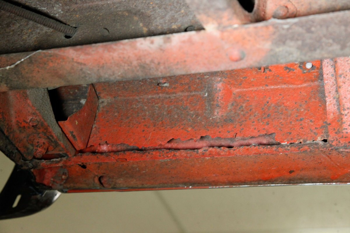 Underneath we spot a cleaned and resealed fuel tank attached to a surface rusted undercarriage. It is an X frame design and appears structurally sound. A coating of orange paint graces the metal on the rockers and shows a few areas of invasive rust near the lower pinch welds. A surface rusted single exhaust pipe runs from the engine rearward and is bolted to a stock style replacement muffler. Recently gone through drum brakes are noted all around and we see independent coil spring suspension in the front and a 3 link and coil spring in the rear.
