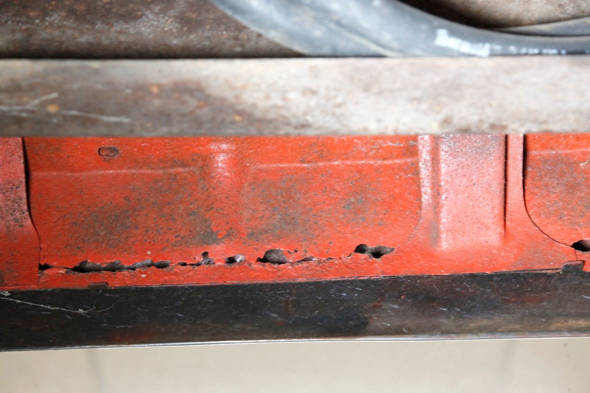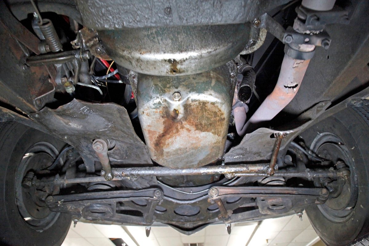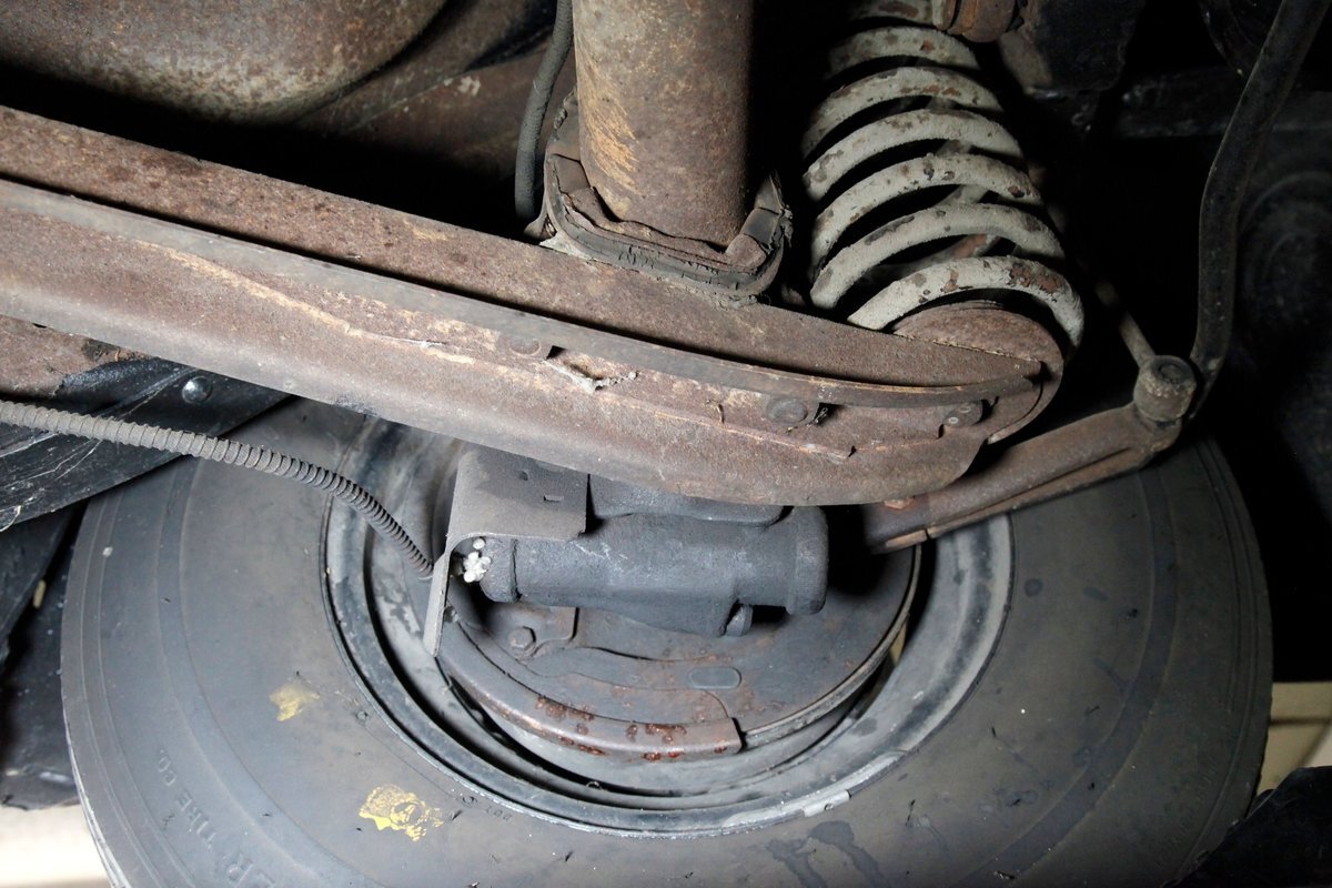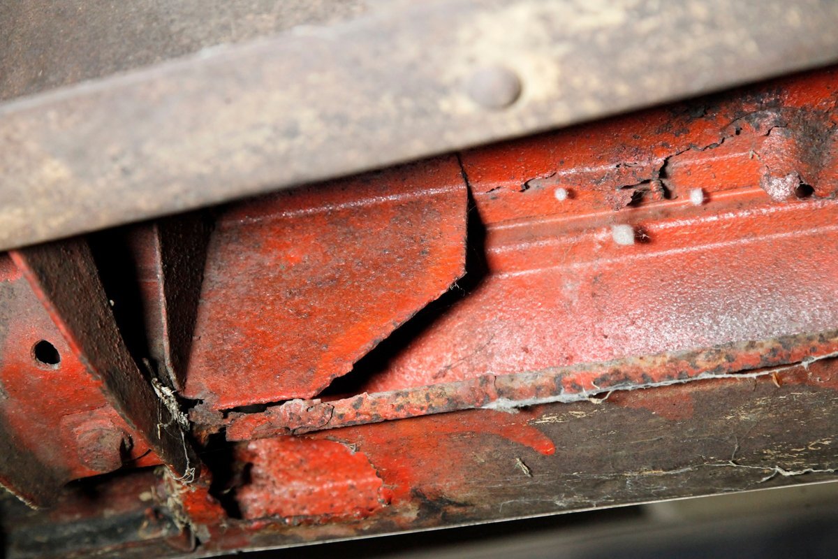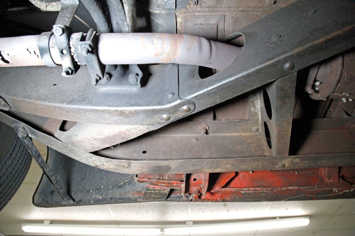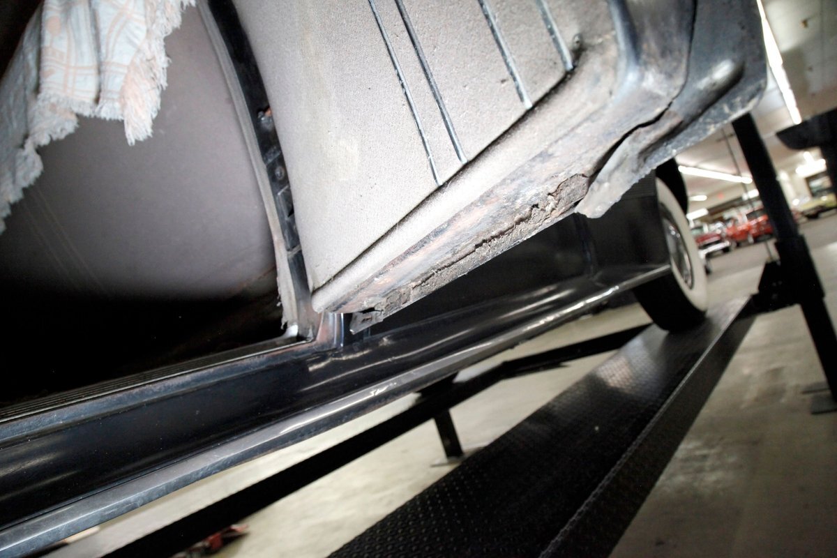 Underneath we spot a cleaned and resealed fuel tank attached to a surface rusted undercarriage. It is an X frame design and appears structurally sound. A coating of orange paint graces the metal on the rockers and shows a few areas of invasive rust near the lower pinch welds. A surface rusted single exhaust pipe runs from the engine rearward and is bolted to a stock style replacement muffler. Recently gone through drum brakes are noted all around and we see independent coil spring suspension in the front and a 3 link and coil spring in the rear.