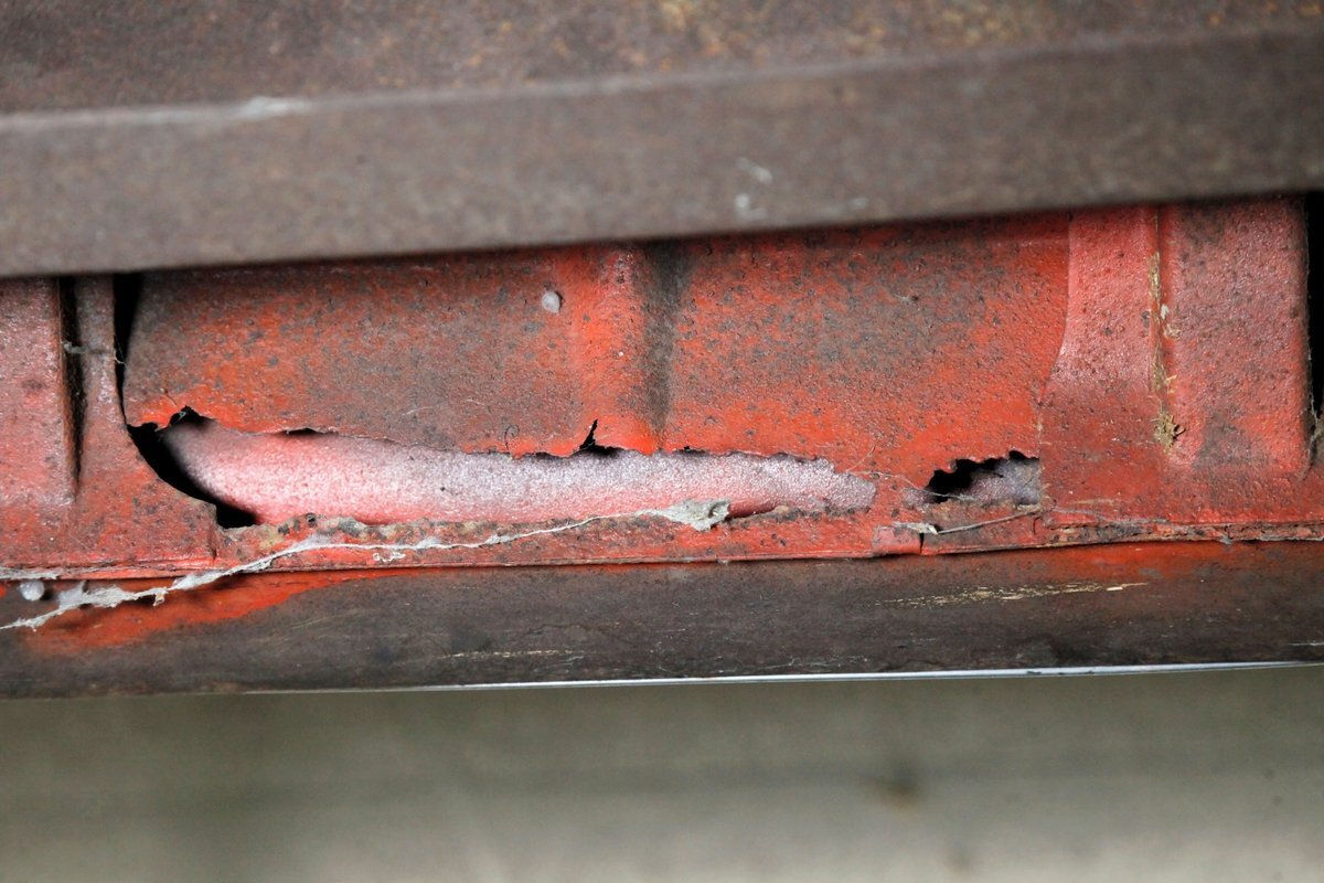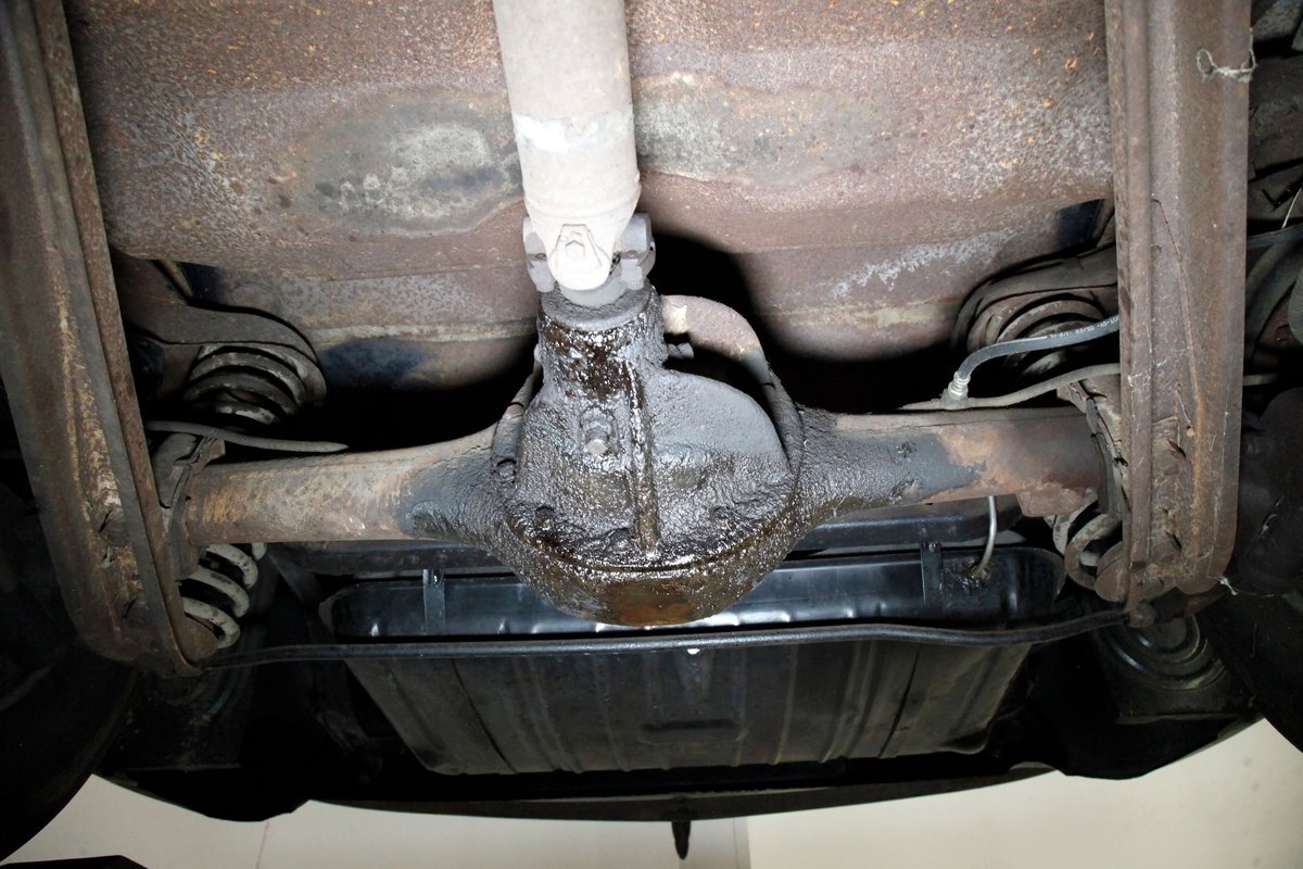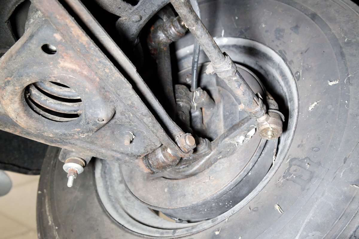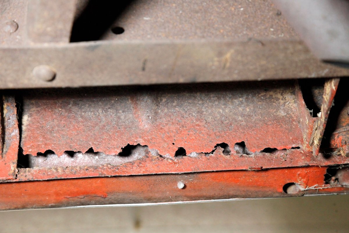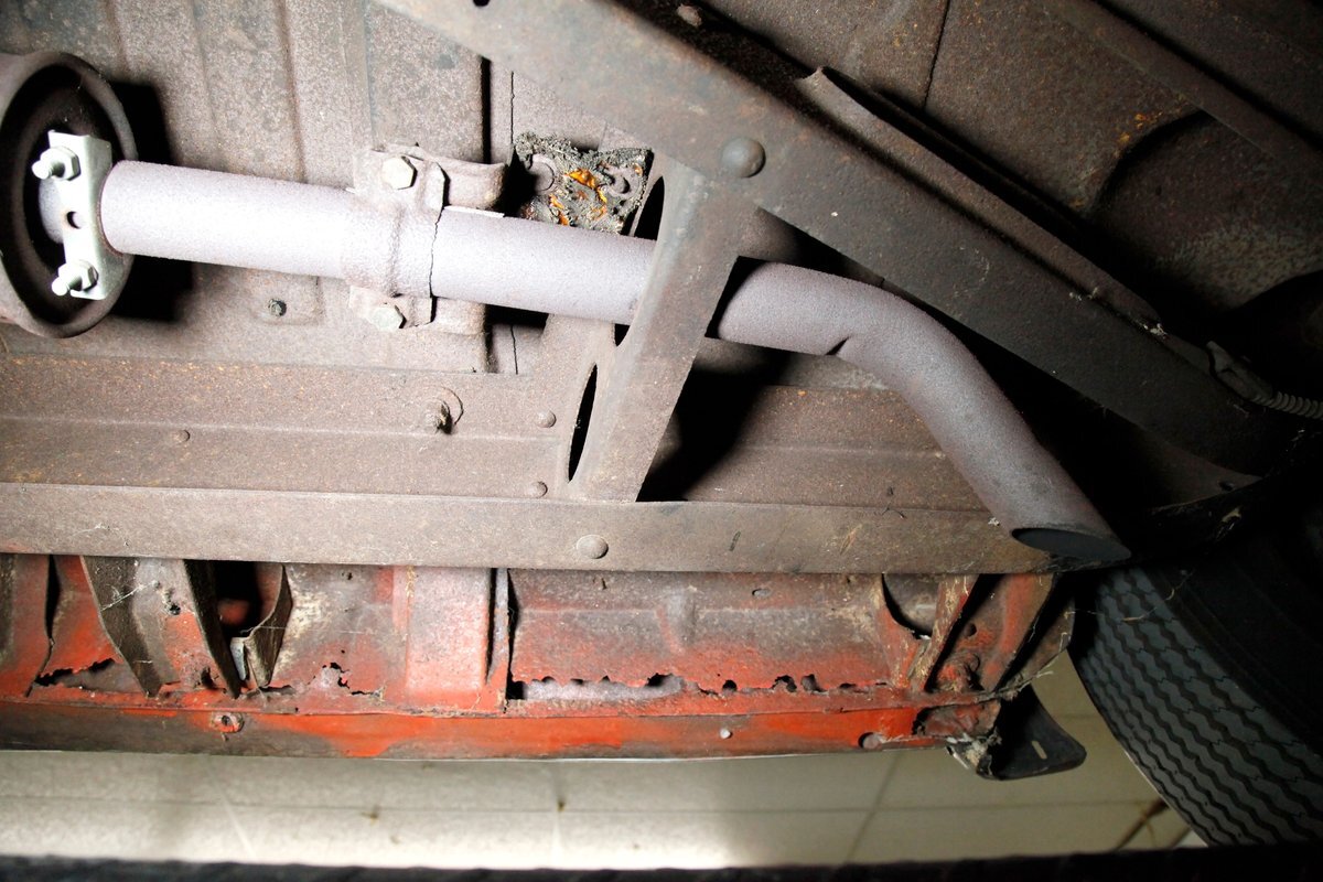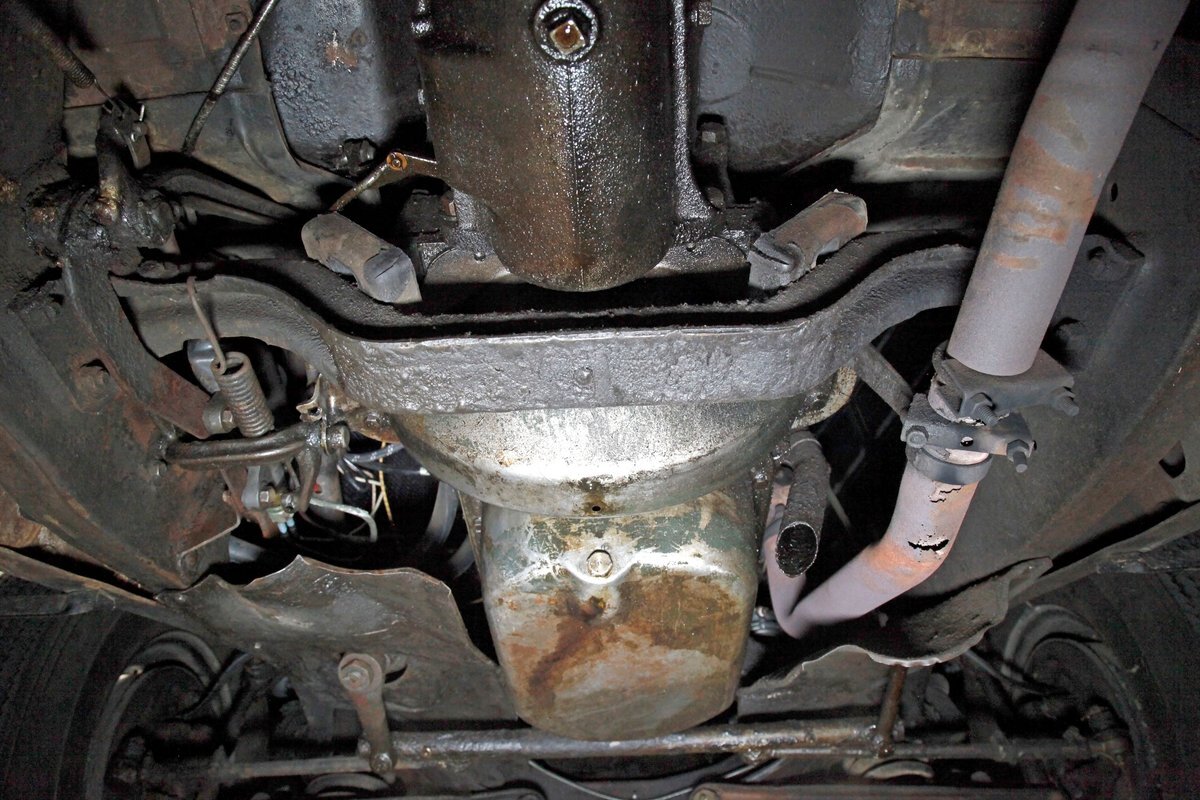 Underneath we spot a cleaned and resealed fuel tank attached to a surface rusted undercarriage. It is an X frame design and appears structurally sound. A coating of orange paint graces the metal on the rockers and shows a few areas of invasive rust near the lower pinch welds. A surface rusted single exhaust pipe runs from the engine rearward and is bolted to a stock style replacement muffler. Recently gone through drum brakes are noted all around and we see independent coil spring suspension in the front and a 3 link and coil spring in the rear.