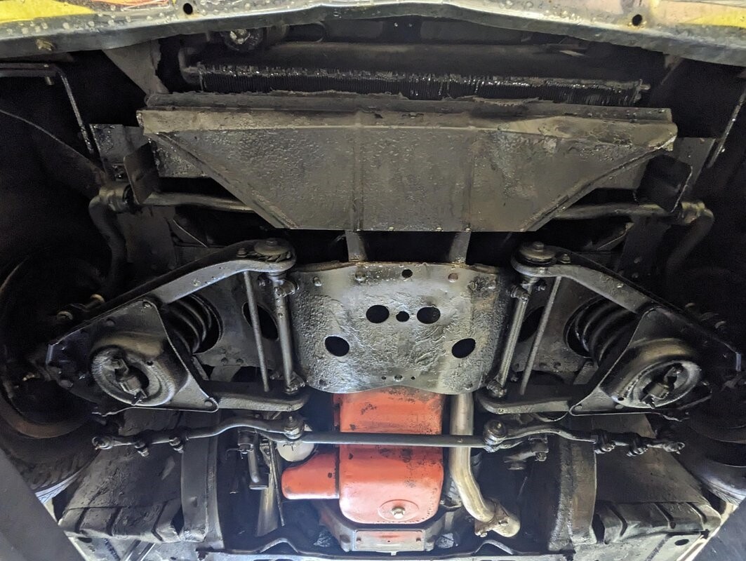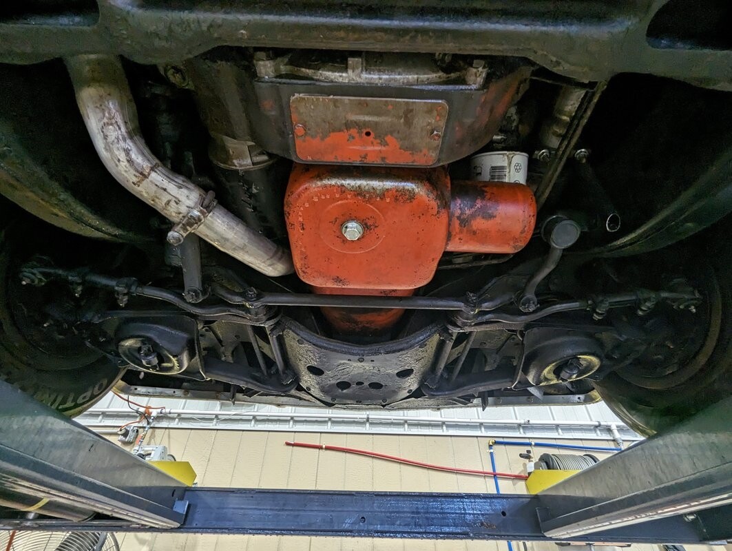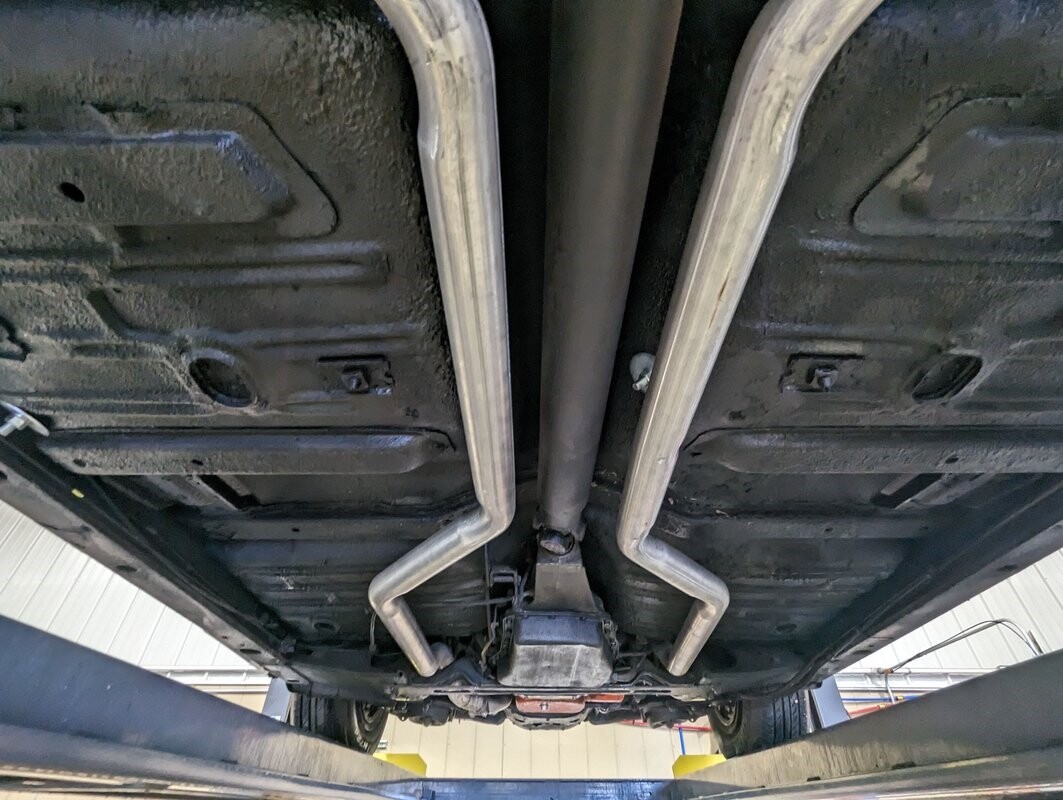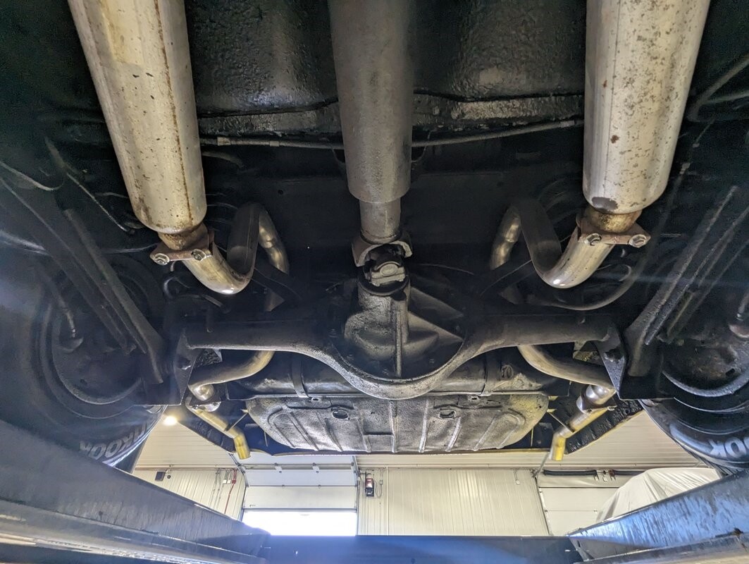UNDERSIDE: Underneath the car appears to be solid and maintained as needed. The dual exhaust looks recent with glass pack style mufflers. The fuel tank has been replaced. The front end has been inspected and serviced. The shocks and springs look like they were replaced. The starter was just rebuilt. It has the original Hydramatic trans, the 1962 tag is still attached.