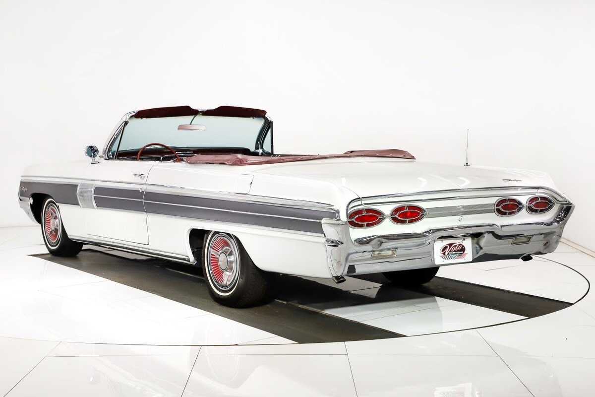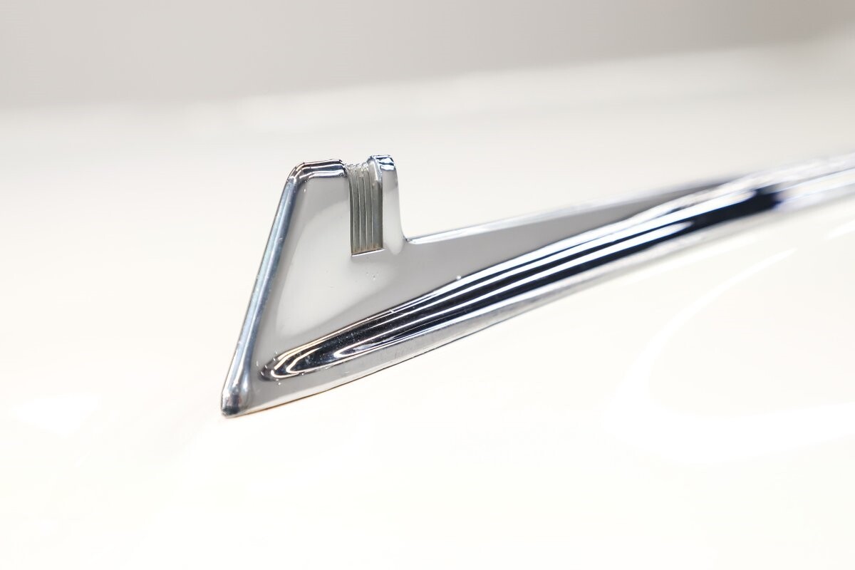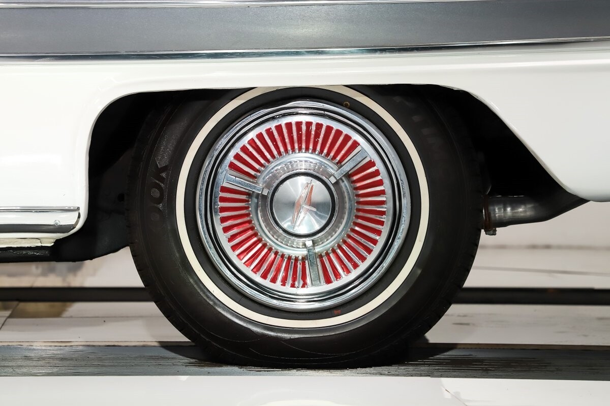 EXTERIOR: Overall it's a great looking car. I would be proud to go to any cruise night or car show with it. Very solid, straight and fits good. The paint is a white metal flake that is smooth and glossy. It's an older paint job with minor flaws if you look for them. The chrome and trim are original and present nicely. There is a dent in the rear bumper. Original glass, weather strips were replaced. Dark red convertible top looks sharp!