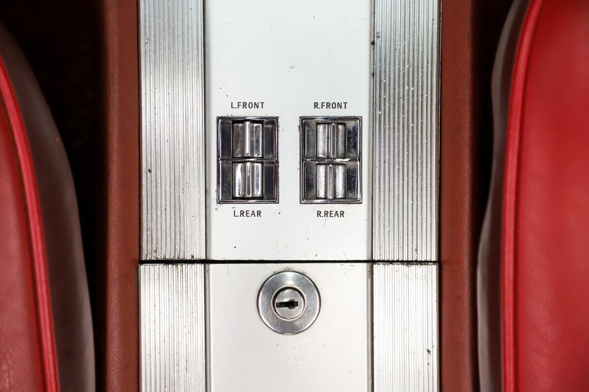 INTERIOR: Best part of the car. Someone spent some coin on genuine leather upholstery! The door panels are really stylish, upper panels are new leather. The seats are really cool too; buckets in front and the back is shaped like buckets too. All leather seats including the sides. The dash is also very cool with lots of trim, shapes and check out the clear plastic over the glove box and the cool steering wheel! Even the pedals have style. There is a modern stereo hidden in the glove box. Features include a console with a tachometer, power windows and seat, wonderbar radio, front seat belts and speed warning indicator.