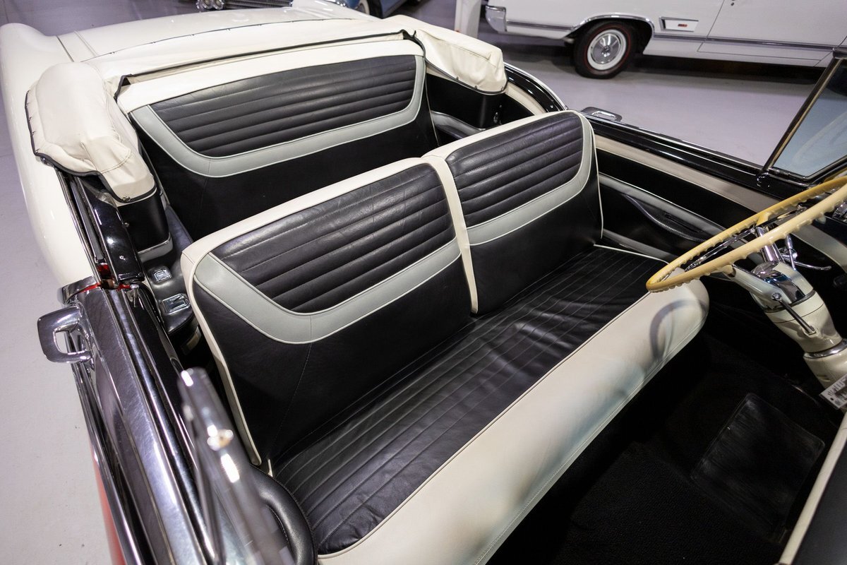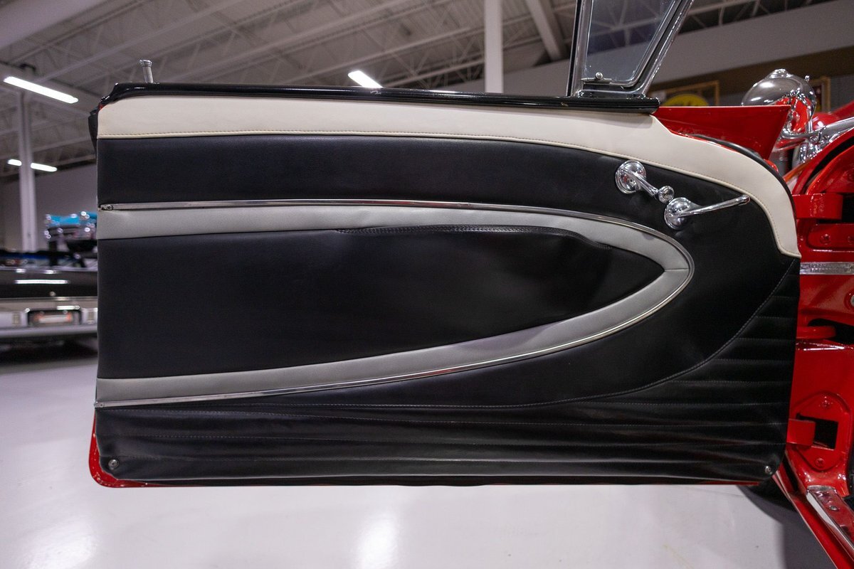 This 1957 Oldsmobile Super 88 J-2 Convertible is a beautifully restored, 50s convertible with fantastic luxury and performance-oriented options! Regardless of the manufacturer, it seems like every automaker had an absolutely gorgeous, and in many cases their most iconic, design for the 1957 model year. In 1957, Oldsmobile produced one of its most elegant designs in the GM marque's history. In the immediate few years following the end of World War II, America's automobile manufacturers were essentially releasing recycled pre-war designs and it wasn't until the late 40s that American manufacturers truly released their new post-war designs. For Oldsmobile, the GM marque kicked off its "Futuramic" style era in 1948 with this design motif, ultimately culminating in 1957. Up front, the chrome grille sported large recessed oval layout that was similar to the previous two years' designs and is seemingly a combination of the 1955 and 1956 grilles. New trim runs down the sides of the 1957 Olds, featuring a new painted accent stripe, straddled by chrome strips, and runs from the vent window down and out through the rear quarter panel. In the rear, a new larger taillight design caps off the truly iconic automobile design. In 1957, Oldsmobile offered three distinct series, the entry-level "Golden Rocket" 88, the sporty Super 88, and the premium "Starfire" 98. Both the sporty Super 88 and entry-level 88 series shared the same body shell and their 122" wheelbase, but the Super 88 came with a more highly-appointed interior and exterior, and it came with more standard features such as special trim and interior lights, among other items. Perhaps the most notable addition to Oldsmobile's lineup in 1957 was the introduction of the "J-2" induction system option comprised of a trifecta of dual-barrel carburetors (i.e. Tri-Power) that pushed the standard horsepower output from 277 to 300 on the J-2 equipped Oldsmobiles. The goal of the J-2 Tri-Power system was to improve Oldsmobile's performance on the NASCAR circuit however, NASCAR would ultimately ban multi-carburetor setups leaving the GM marque with only 5 Grand National wins before it pulled out of the racing circuit. Oldsmobile was America's 5th largest automaker in 1957 and it produced a total of 7,128 Super 88 Convertibles which makes this particular Super 88 quite a rare 50s cruiser. This particular example comes to us from from a southern museum where it spent its most recent years as a part of the esteemed collection. Powering this '57 Olds Super 88 is a recently rebuilt 371 Cubic Inch V8 engine fed by a "J-2 Rocket" induction Tri-Power system comprised of three dual-barrel carburetors and that was rated at 300 horsepower when new. The J-2 371 V8 is mated to a Hydra-Matic Automatic transmission that makes this '57 Oldsmobile an easy car for just about anybody to drive. Exhaust leaves this Rocket J-2 powerplant via a dual exhaust setup that exits through the bumper and creates a wonderful throaty sound in the rear. This 1957 Super 88 Convertible comes loaded with numerous desirable options! "Pedal-Ease" Power Brakes make bringing this 50s cruiser to a complete stop much easier, especially with all of that extra horsepower under the hood. With power steering, wrangling this '57 Olds Super 88 in and out of a tight space at the local car show or drive-in is an absolute breeze and the overall driving experience is greatly improved as well. The white vinyl power convertible top is in wonderful condition and it goes up and down with the simple flick of a switch. The driver's side spotlight is another tasteful addition, giving additional 50s flair to this classic Oldsmobile. Riding on a set of wide whitewall radial tires, each paired with a full wheelcover, this 1957 Olds Super 88 has a fantastic look and even better ride. The exterior of this '57 Oldsmobile Convertible has been correctly refinished in a tri-tone color scheme consisting of Festival Red and Alcan White with Black accents, completing the exterior look of the car. The interior of this 1957 Oldsmobile Super 88 Convertible is absolutely gorgeous! The front and rear bench seats have been reupholstered in White and Black two-tone leather. The white and black upholstered door panels, black carpeting, black padded dash, and steering wheel all appear to be in wonderful condition as well and all appear to retain a nice stock appearance. The interior of this Super 88 is also appointed with several terrific options! All four windows are power windows that go up and down with the simple flick of a switch. Sitting atop the dash is an Autronic Eye, which is another delightful option seen on the most luxurious GM cars of the day. The front bench seat is power adjustable as well so that you can be sure that you'll reach the pedals while cruising down the road. The instrument cluster comes equipped with a 120 MPH speedometer and fuel gauge, along with indicator lights for engine temperature and generator function. The dash is finished off with a Wonderbar AM radio, clock, and locking glovebox, along with several other controls for the vehicle's functions. A temperature gauge and oil pressure gauge have also been mounted neatly under the dash for improved insight into the engine's performance. Whether you're buying your very first classic car or you're adding to your existing collection with the finest 50s GM cruisers, this 1957 Oldsmobile Super 88 Convertible would make an excellent choice. Give Ellingson's a call today at763-428-7337!