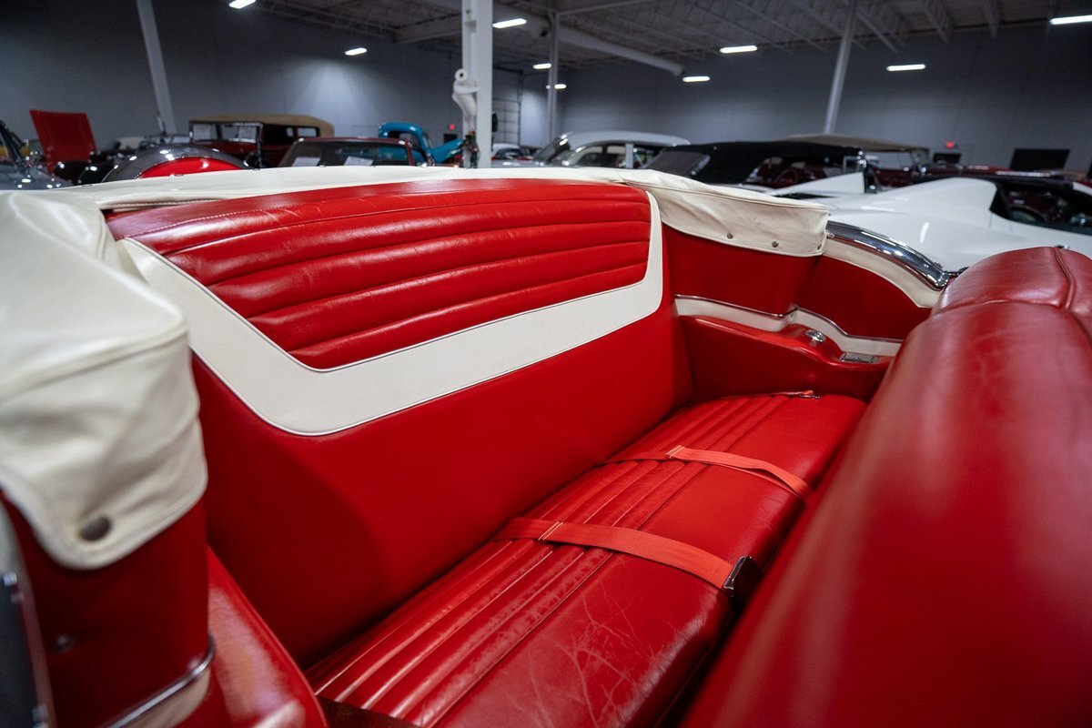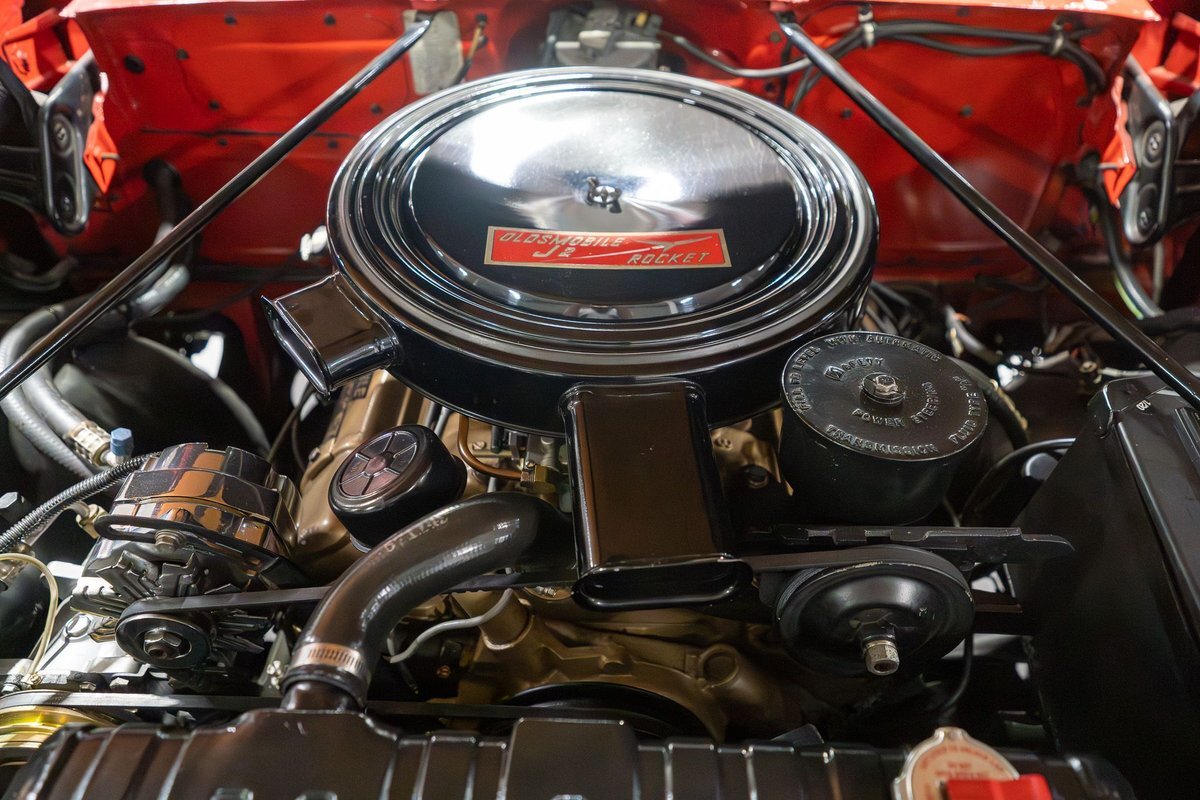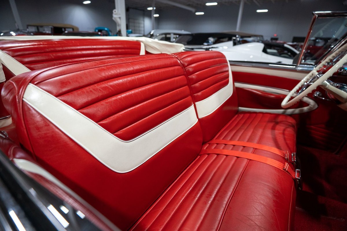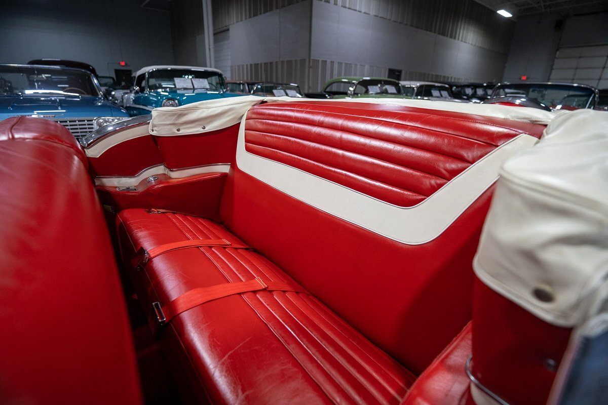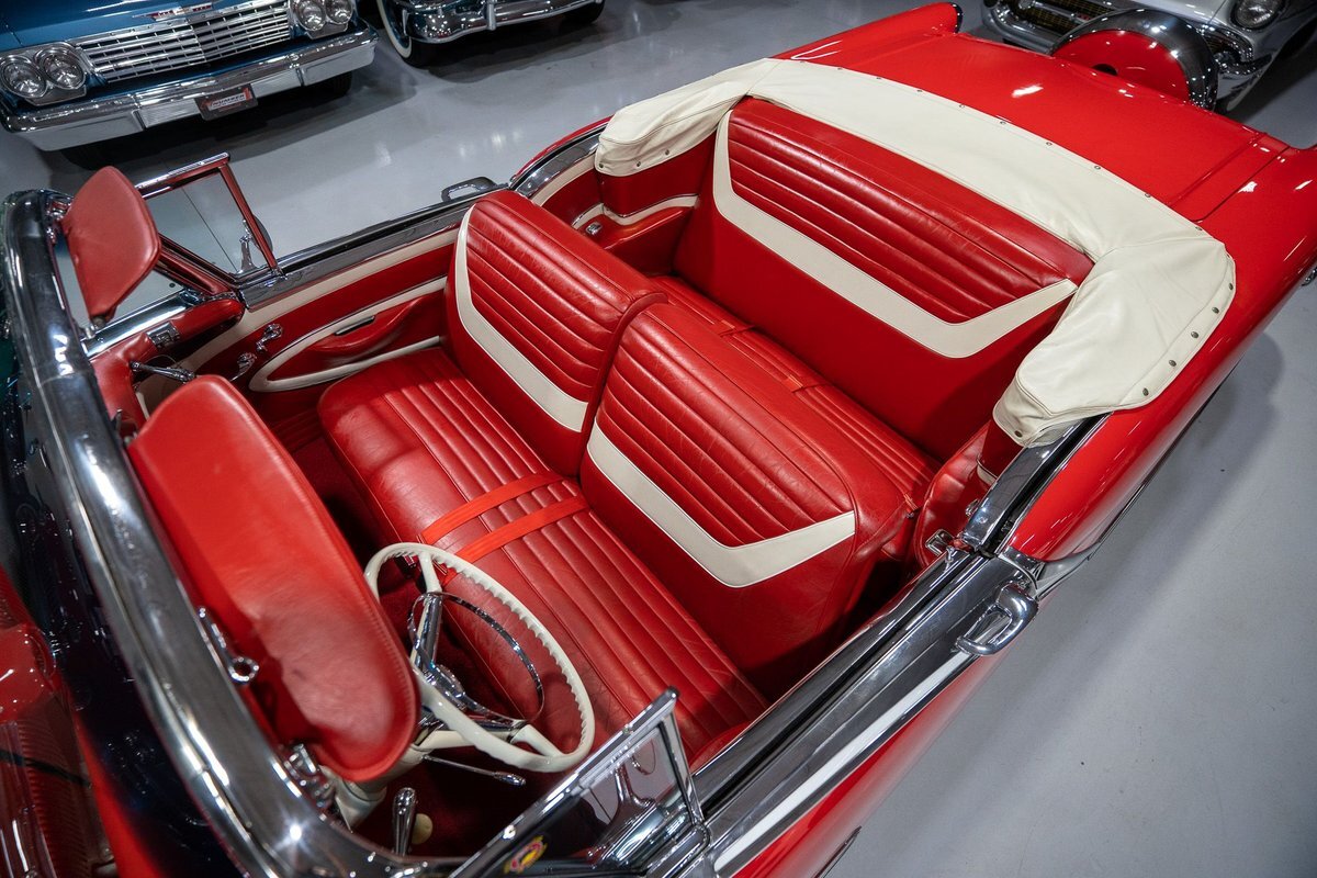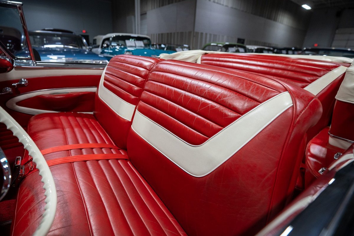 This 1957 Oldsmobile Super 88 J-2 Convertible is an absolutely gorgeous convertible with fantastic options and is a former 3-time concours participant. 1957 marked the final year of Oldsmobile's "Futuramic" styling, bookending an era that began in 1948. At the nose, the large oval recessed chrome grille was reminiscent of previous years' style, almost a combination of the grilles from 1955 and 1956. Down the sides, a piece of chrome trim runs from the front quarter through most of the front door and a new painted accent stripe, straddled by chrome strips, runs from the vent window down and out through the rear quarter. Changes to the '57 rear end included a new, larger taillight design that capped off a truly elegant automobile. In 1957, Oldsmobile was the fifth-largest American automaker and the GM marque offered three distinct series, the entry-level "Golden Rocket" 88, the sporty Super 88, and the premium "Starfire" 98. The Super 88 shared the same body shell and 122" wheelbase as the entry-level 88, but came more highly-appointed and with more standard features including special trim and interior lights, among other items. The other big addition to Oldsmobile's 1957 lineup was the introduction of the "J-2" induction system option comprised of a trifecta of dual-barrel carburetors that pushed the horsepower output from 277 to 300. This particular '57 Super 88 J-2 comes to us from a longtime owner who oversaw the car's extensive professional restoration and showed the car extensively, including in 3 separate east coast Concours D'Elegance events. Powering this 1957 Oldsmobile is a 371 Cubic Inch V8 engine paired with a "J-2 Rocket" induction tri-power system comprised of three dual-barrel carburetors and that was said to have created 300 horsepower when new. The J-2 371 V8 is backed by a "Jetaway" Hydra-Matic Automatic transmission that makes this Super 88 an easy car for anybody to drive. Exhaust exits the 371 V8 powerplant via a dual exhaust setup that produces a nice throaty sound out of the rear of this 50s cruiser. This 1957 Olds is loaded with options! Power steering and dual outside mirrors make maneuvering this Super 88 Convertible in and out of tight spaces at the local car show or drive-in is a total breeze and greatly improves the overall driving experience. Outfitted with "Pedal-Ease" Power Brakes, bringing this 1957 Oldsmobile to a full stop requires much less effort and is another one of those highly desirable options on vintage cars. Dual outside spotlights, fender skirts, and rear-mounted Continental Kit are all period-type options that add to the fifties allure of this Super 88. The white vinyl power convertible top is in great shape and it goes up and down with the simple flick of a switch. The previous owners of this '57 Olds also added several upgrades for improved drivability and performance. The original generator was replaced by an alternator to improve battery charging and overall electrical output. Previous ownership also added Vintage Air Conditioning so that you can stay cool while cruising even on the hottest summer days. The exterior of this 1957 J-2 Super 88 has been refinished in Festival Red with an Alcan White accent that just makes the exterior of this Olds pop. The chrome and brightwork around the exterior of this Super 88 is in fantastic shape and completes the exterior look of the car. The interior on this Super 88 Convertible is absolutely gorgeous! The front power seat and rear bench have been reupholstered in beautiful Red and Ivory leather. The color-matched door panels, chrome power window controls, red carpeting, padded dash, and steering wheel are all in wonderful condition as well and all appear to be in their stock configuration. The instrument cluster is equipped with a 120 MPH speedometer and fuel gauge, along with indicator lights for engine temperature, oil pressure, and battery charging. Integrated into the dash is a Wonderbar Super Deluxe AM radio sitting below the controls for the power antenna and power convertible top, and a clock. A Sunpro volt gauge and controls and vents for the Air Conditioning system are mounted neatly under the dash. Whether you're buying your first classic 50s car or you're adding to your existing collection this 1957 Oldsmobile Super 88 J-2 Convertible would make an excellent choice. Give us a call today at763-428-7337!