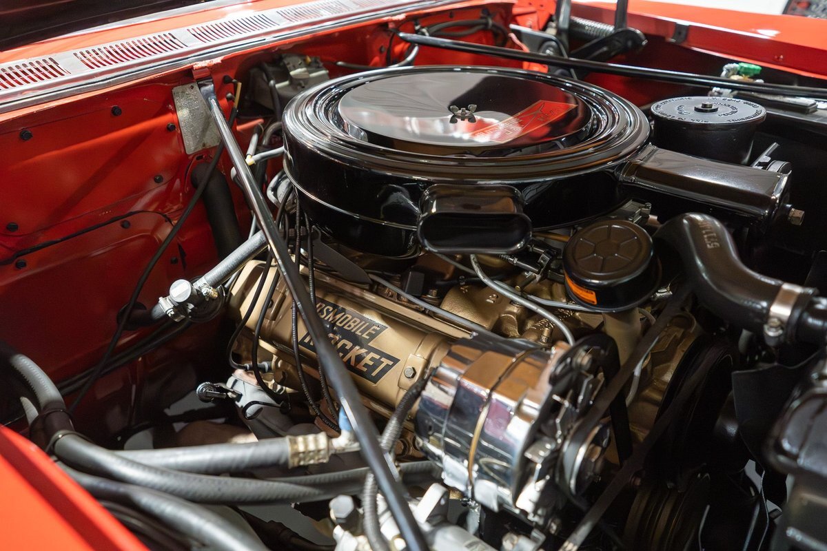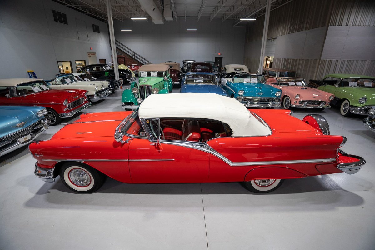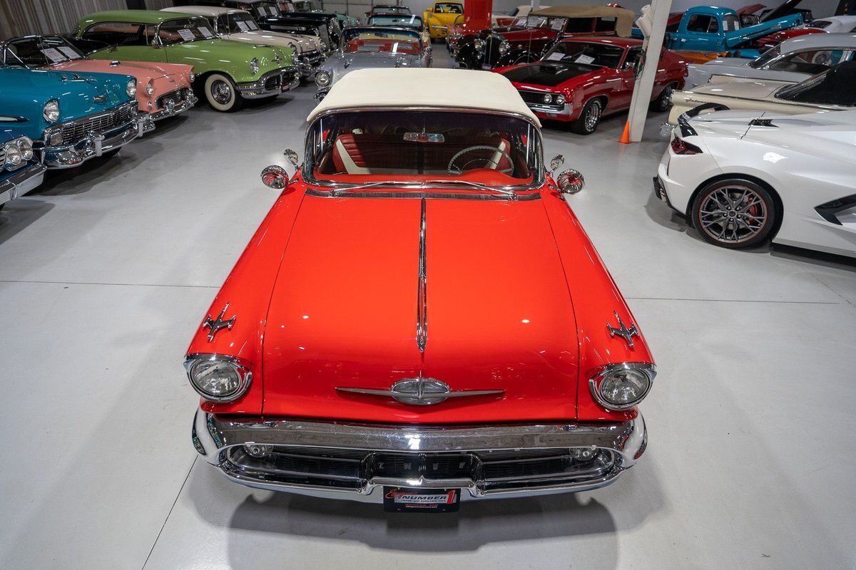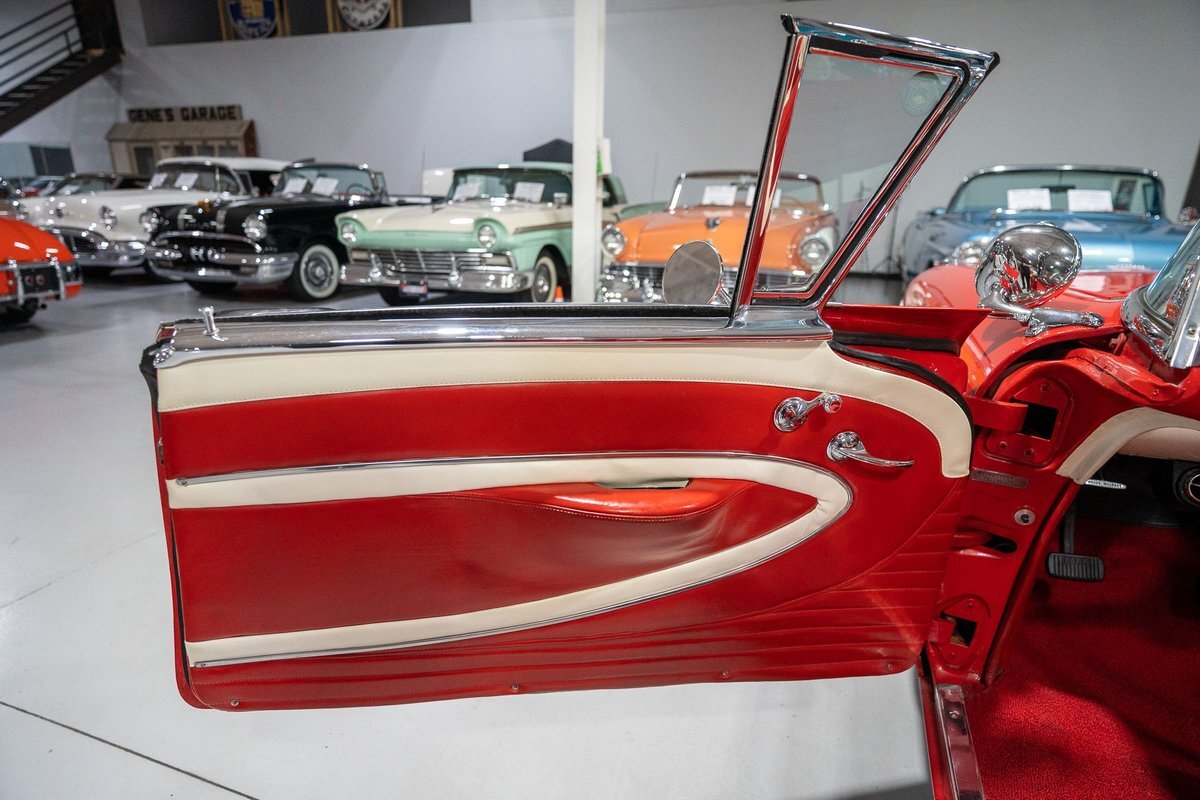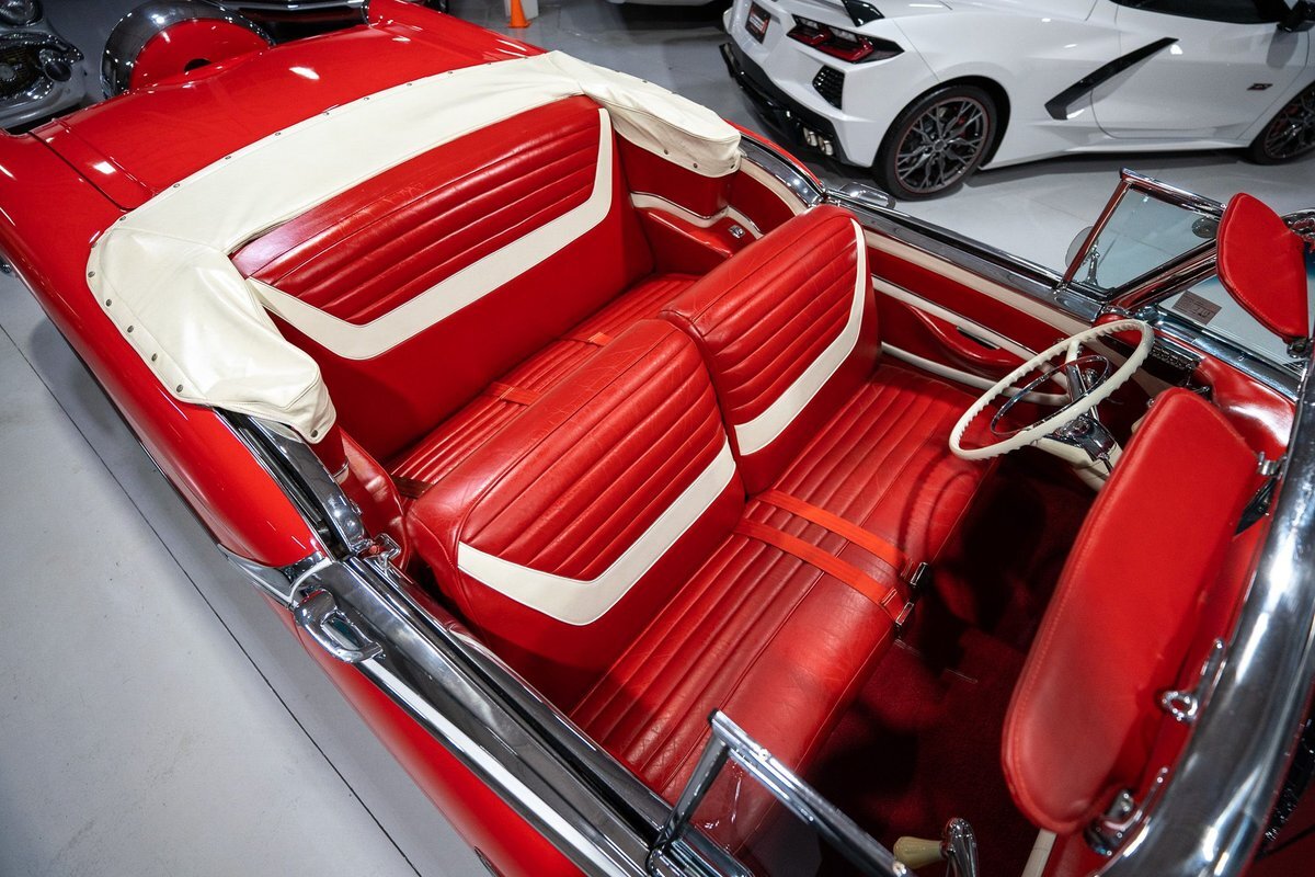 This 1957 Oldsmobile Super 88 J-2 Convertible is an absolutely gorgeous convertible with fantastic options and is a former 3-time concours participant. 1957 marked the final year of Oldsmobile's "Futuramic" styling, bookending an era that began in 1948. At the nose, the large oval recessed chrome grille was reminiscent of previous years' style, almost a combination of the grilles from 1955 and 1956. Down the sides, a piece of chrome trim runs from the front quarter through most of the front door and a new painted accent stripe, straddled by chrome strips, runs from the vent window down and out through the rear quarter. Changes to the '57 rear end included a new, larger taillight design that capped off a truly elegant automobile. In 1957, Oldsmobile was the fifth-largest American automaker and the GM marque offered three distinct series, the entry-level "Golden Rocket" 88, the sporty Super 88, and the premium "Starfire" 98. The Super 88 shared the same body shell and 122" wheelbase as the entry-level 88, but came more highly-appointed and with more standard features including special trim and interior lights, among other items. The other big addition to Oldsmobile's 1957 lineup was the introduction of the "J-2" induction system option comprised of a trifecta of dual-barrel carburetors that pushed the horsepower output from 277 to 300. This particular '57 Super 88 J-2 comes to us from a longtime owner who oversaw the car's extensive professional restoration and showed the car extensively, including in 3 separate east coast Concours D'Elegance events. Powering this 1957 Oldsmobile is a 371 Cubic Inch V8 engine paired with a "J-2 Rocket" induction tri-power system comprised of three dual-barrel carburetors and that was said to have created 300 horsepower when new. The J-2 371 V8 is backed by a "Jetaway" Hydra-Matic Automatic transmission that makes this Super 88 an easy car for anybody to drive. Exhaust exits the 371 V8 powerplant via a dual exhaust setup that produces a nice throaty sound out of the rear of this 50s cruiser. This 1957 Olds is loaded with options! Power steering and dual outside mirrors make maneuvering this Super 88 Convertible in and out of tight spaces at the local car show or drive-in is a total breeze and greatly improves the overall driving experience. Outfitted with "Pedal-Ease" Power Brakes, bringing this 1957 Oldsmobile to a full stop requires much less effort and is another one of those highly desirable options on vintage cars. Dual outside spotlights, fender skirts, and rear-mounted Continental Kit are all period-type options that add to the fifties allure of this Super 88. The white vinyl power convertible top is in great shape and it goes up and down with the simple flick of a switch. The previous owners of this '57 Olds also added several upgrades for improved drivability and performance. The original generator was replaced by an alternator to improve battery charging and overall electrical output. Previous ownership also added Vintage Air Conditioning so that you can stay cool while cruising even on the hottest summer days. The exterior of this 1957 J-2 Super 88 has been refinished in Festival Red with an Alcan White accent that just makes the exterior of this Olds pop. The chrome and brightwork around the exterior of this Super 88 is in fantastic shape and completes the exterior look of the car. The interior on this Super 88 Convertible is absolutely gorgeous! The front power seat and rear bench have been reupholstered in beautiful Red and Ivory leather. The color-matched door panels, chrome power window controls, red carpeting, padded dash, and steering wheel are all in wonderful condition as well and all appear to be in their stock configuration. The instrument cluster is equipped with a 120 MPH speedometer and fuel gauge, along with indicator lights for engine temperature, oil pressure, and battery charging. Integrated into the dash is a Wonderbar Super Deluxe AM radio sitting below the controls for the power antenna and power convertible top, and a clock. A Sunpro volt gauge and controls and vents for the Air Conditioning system are mounted neatly under the dash. Whether you're buying your first classic 50s car or you're adding to your existing collection this 1957 Oldsmobile Super 88 J-2 Convertible would make an excellent choice. Give us a call today at763-428-7337!
