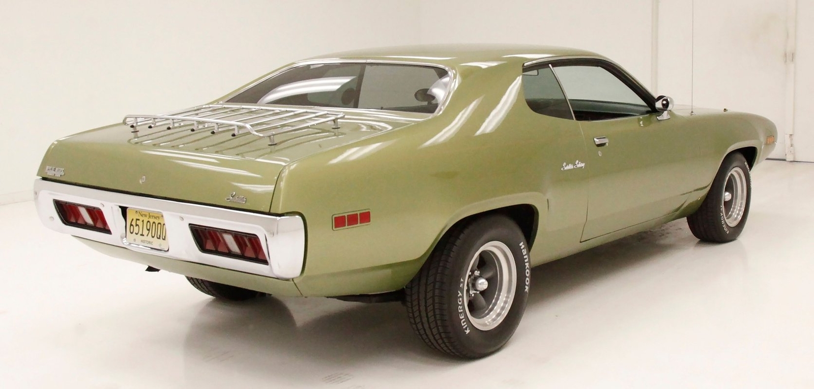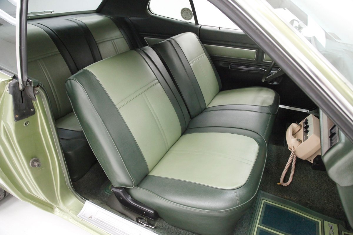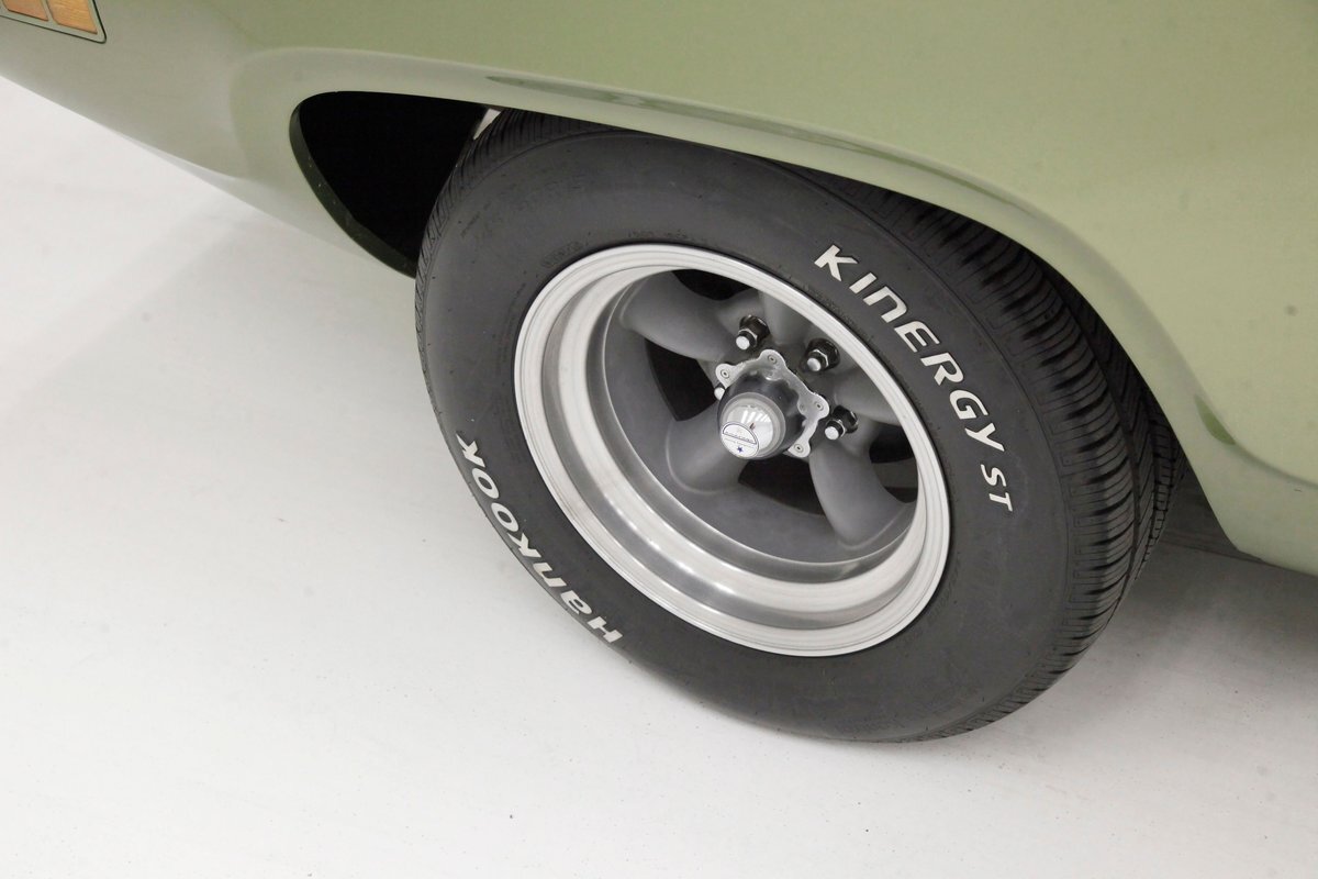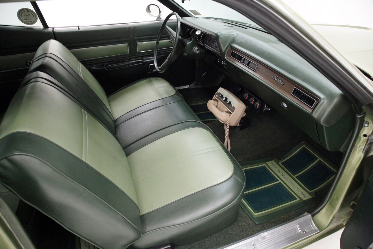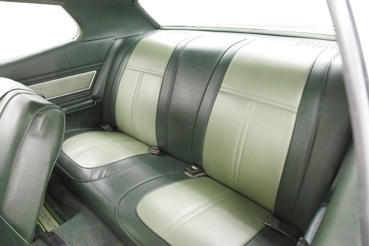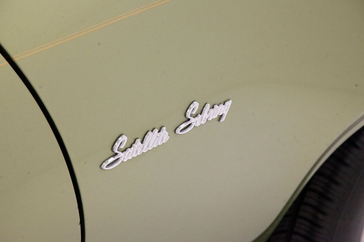 With a near show quality finish for the carefully resprayed body done with fender tag matching Amber Sherwood Green Metallic, it will be difficult to find any fault on this fuselage looker other than some small inclusions down low. Great looking Satellite Sebring script trim is seen dressing the coke bottle sides, and going around the front wheel well, then headed back through the door and rear quarter panel where it goes for another up and down ride around the rear wheel well, and finally ending at the rear bumper is an embossed body line giving the look of motion even when standing still. Speaking of the bumpers, they're both new and for the front is an ovalesque chrome surrounding the quad headlights, grill assembly and the traditional red white and blue Satellite emblem. Signal markers are mounted down below on the valance and all front lighting has been updated to CIBIE high power LED bulbs. A large slightly inward scooped hood wears not only hood pins but is flanked outboard by some body colored fender mounted turn signals. Well polished stainless surrounds dress the clear and clean glass and new chrome sport mirrors are dressing both doors. Out back, the flat rectangular trunk lid has been fitted with a new chrome laden luggage rack. New tail light lenses with LED bulbs sit within black trimmings and are surrounded by the all encompassing new chrome rear bumper. 1970's era American Racing Torque Thrust wheels dress the 4's and are wrapped in raised white letter staggered width Hankook rubber from 2021, and there you have it...Sebring trim.