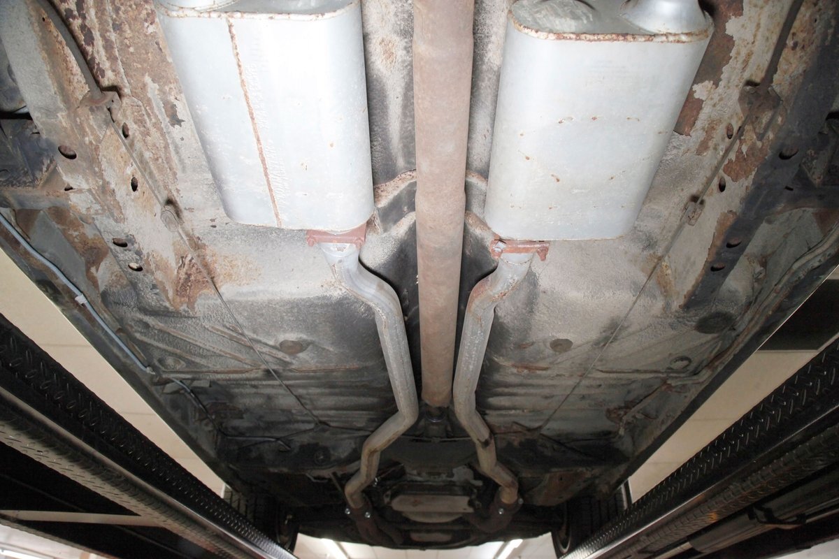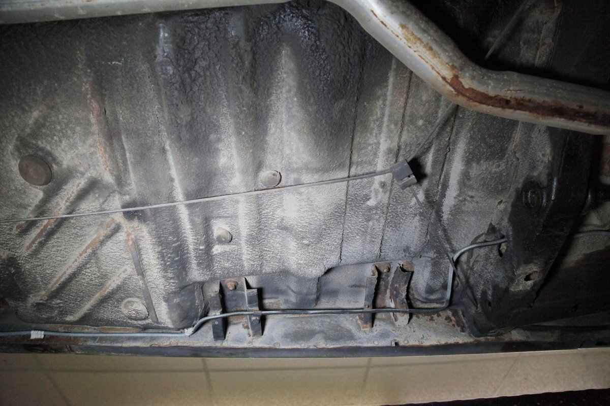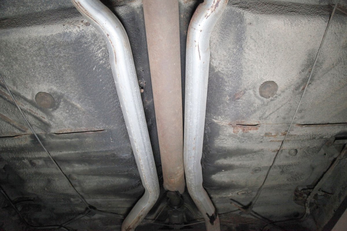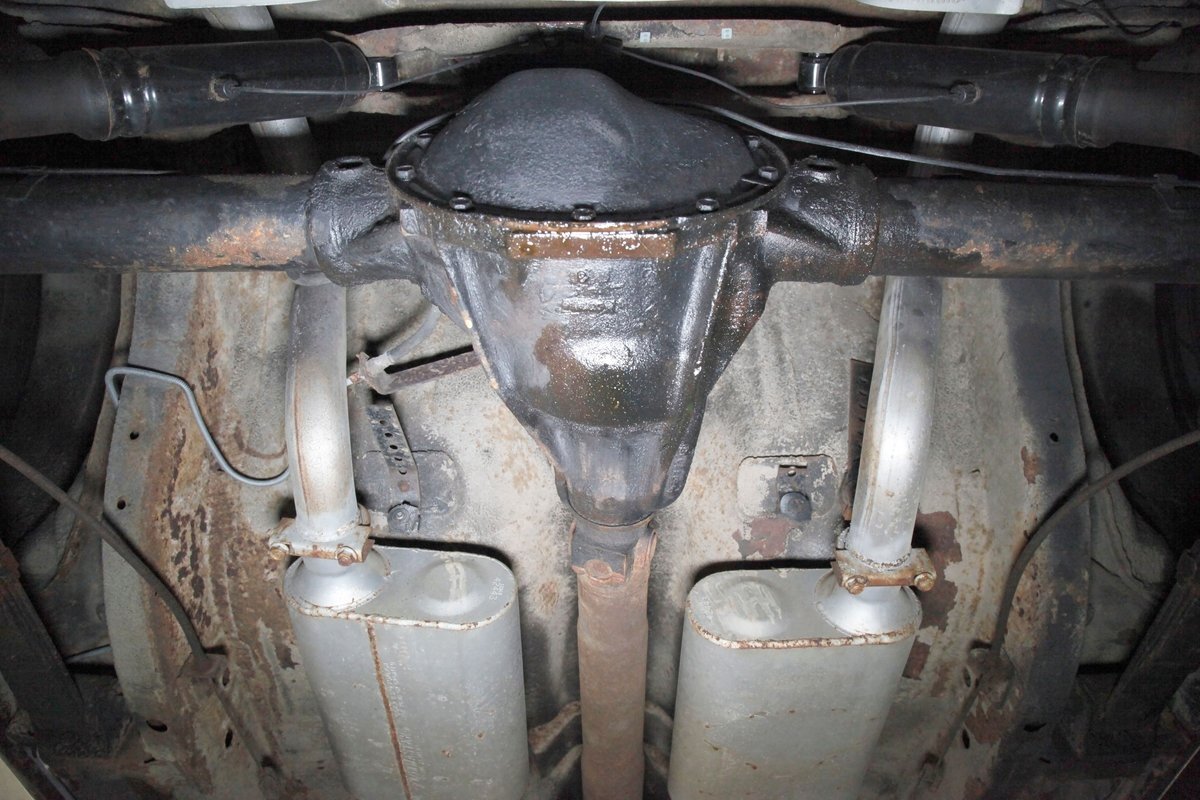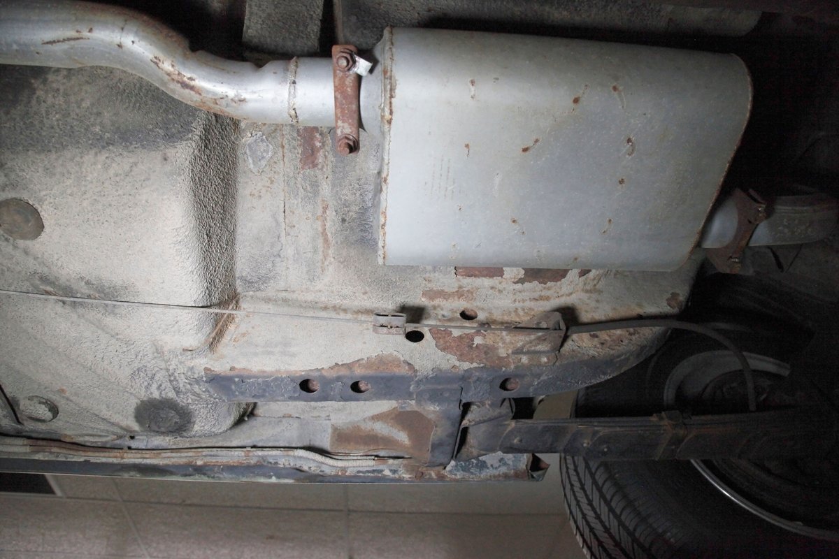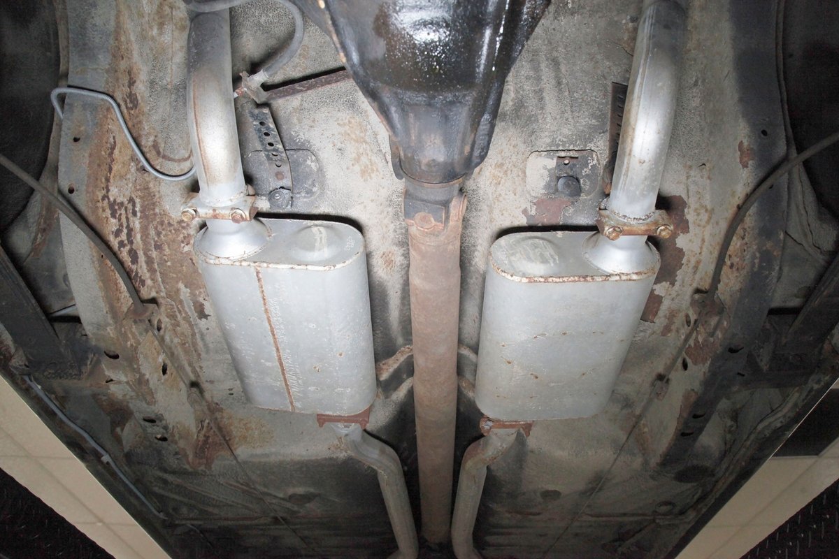 Slight surface rust is noted on an otherwise clean undercoated and patinaed frame and floor panels as well as underside of rockers. A newer Flowmaster dual exhaust snakes its way rearward from the headers attached to the 318ci mill. Providing the ride is an independent torsion bar front suspension with new ball joints and new air shocks and in the back we note leaf springs with more new air shocks. We note a new master cylinder actuating the power disc brakes with new hoses up front and power drums in the rear along with a new fuel tank. Our consignor also notes that the power steering box and power steering pump are also new.