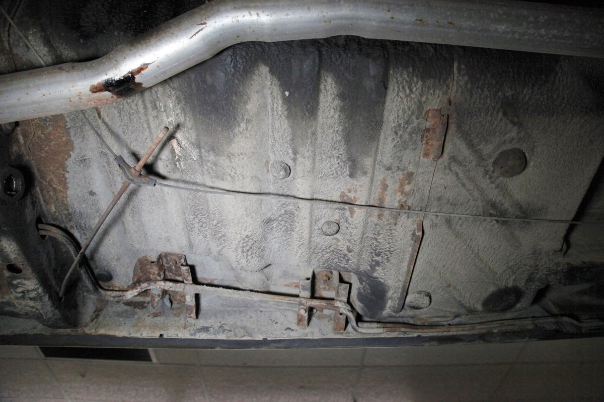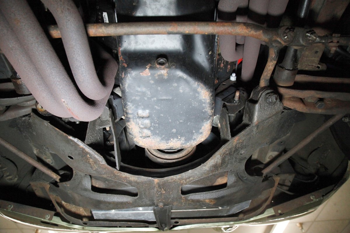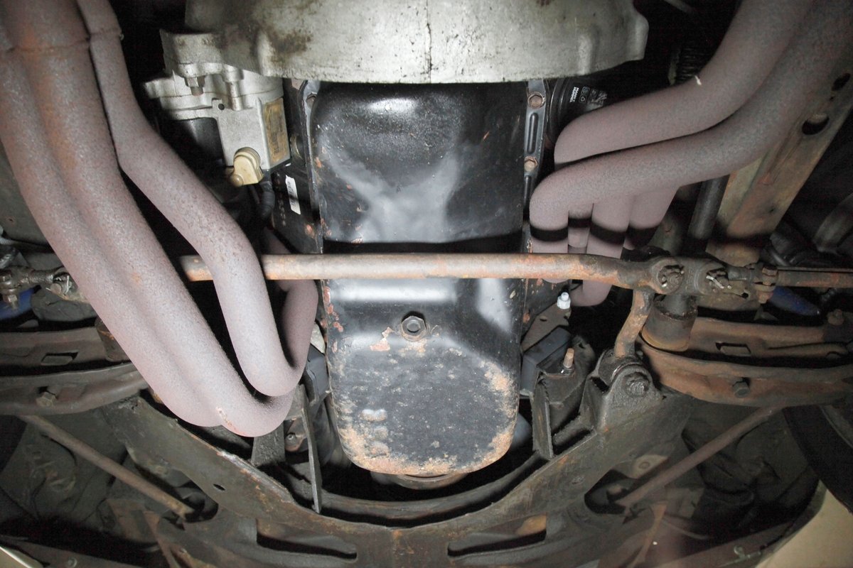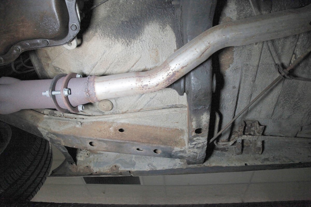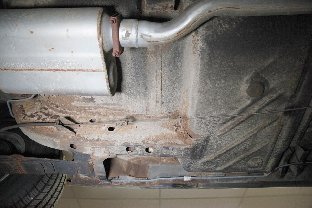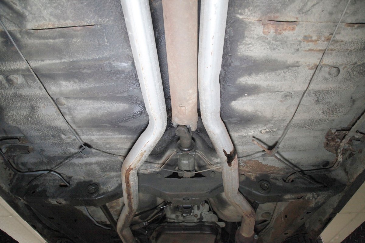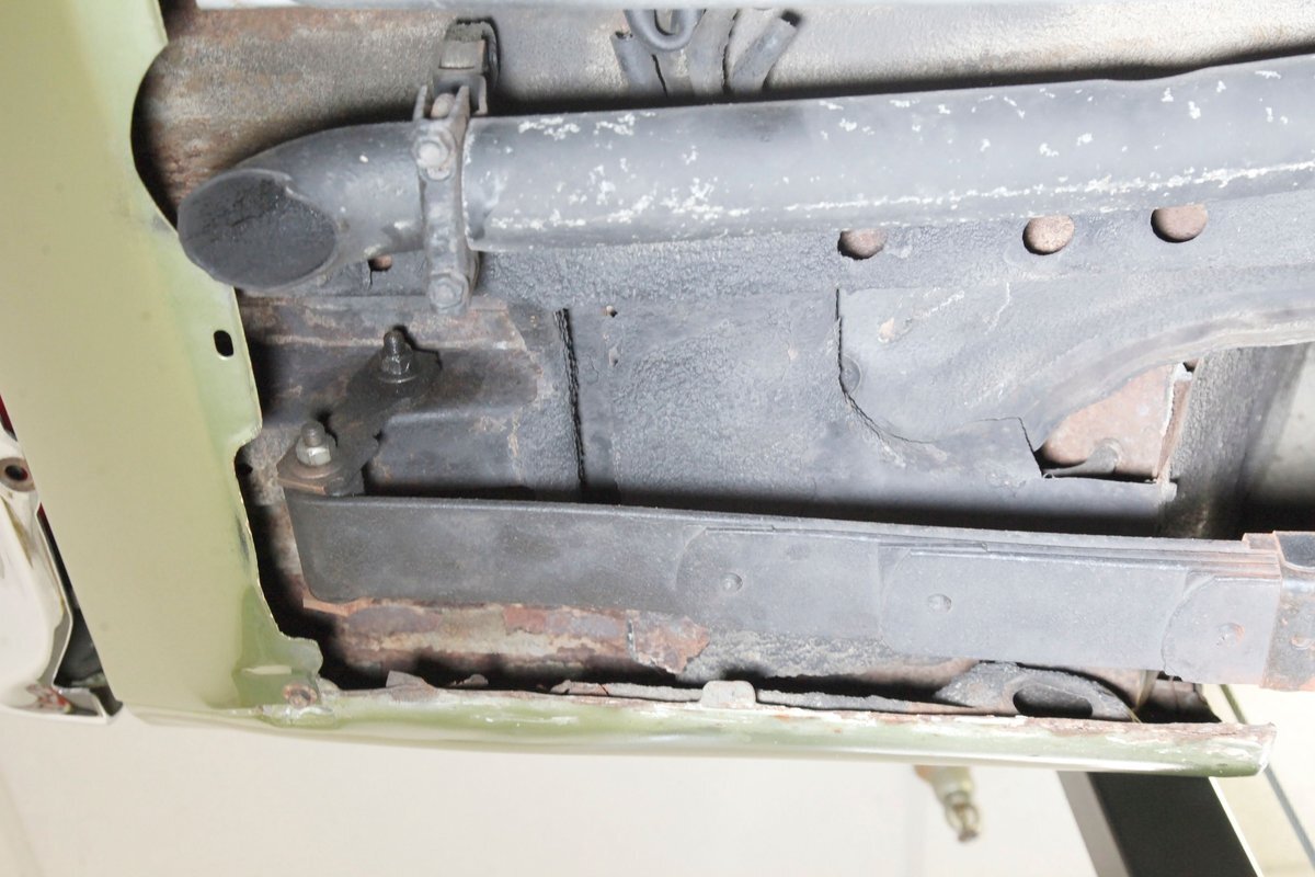 Slight surface rust is noted on an otherwise clean undercoated and patinaed frame and floor panels as well as underside of rockers. A newer Flowmaster dual exhaust snakes its way rearward from the headers attached to the 318ci mill. Providing the ride is an independent torsion bar front suspension with new ball joints and new air shocks and in the back we note leaf springs with more new air shocks. We note a new master cylinder actuating the power disc brakes with new hoses up front and power drums in the rear along with a new fuel tank. Our consignor also notes that the power steering box and power steering pump are also new.
