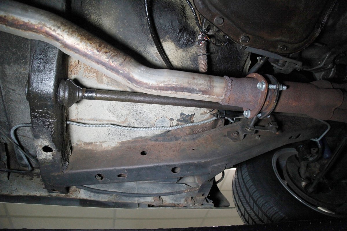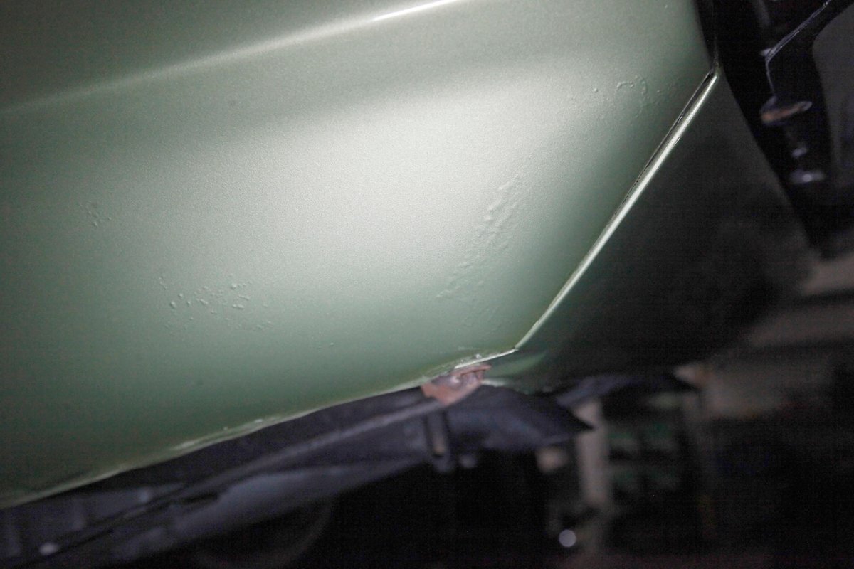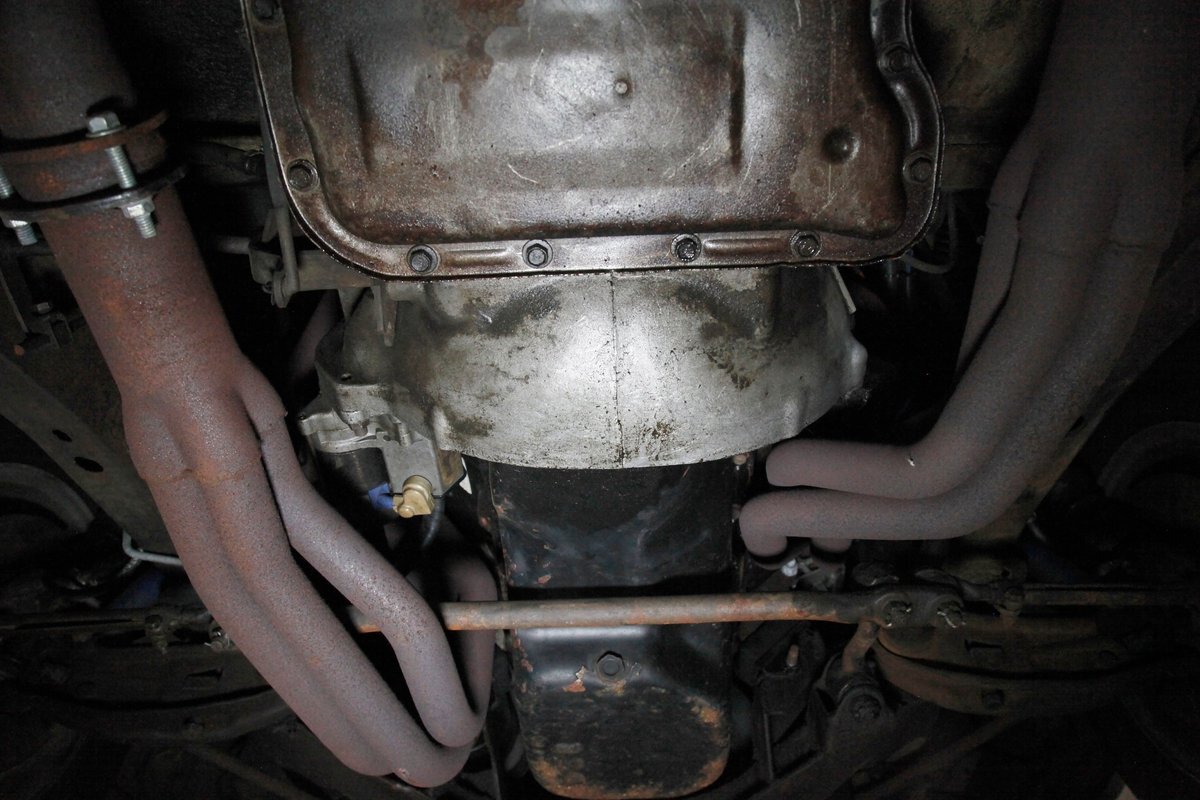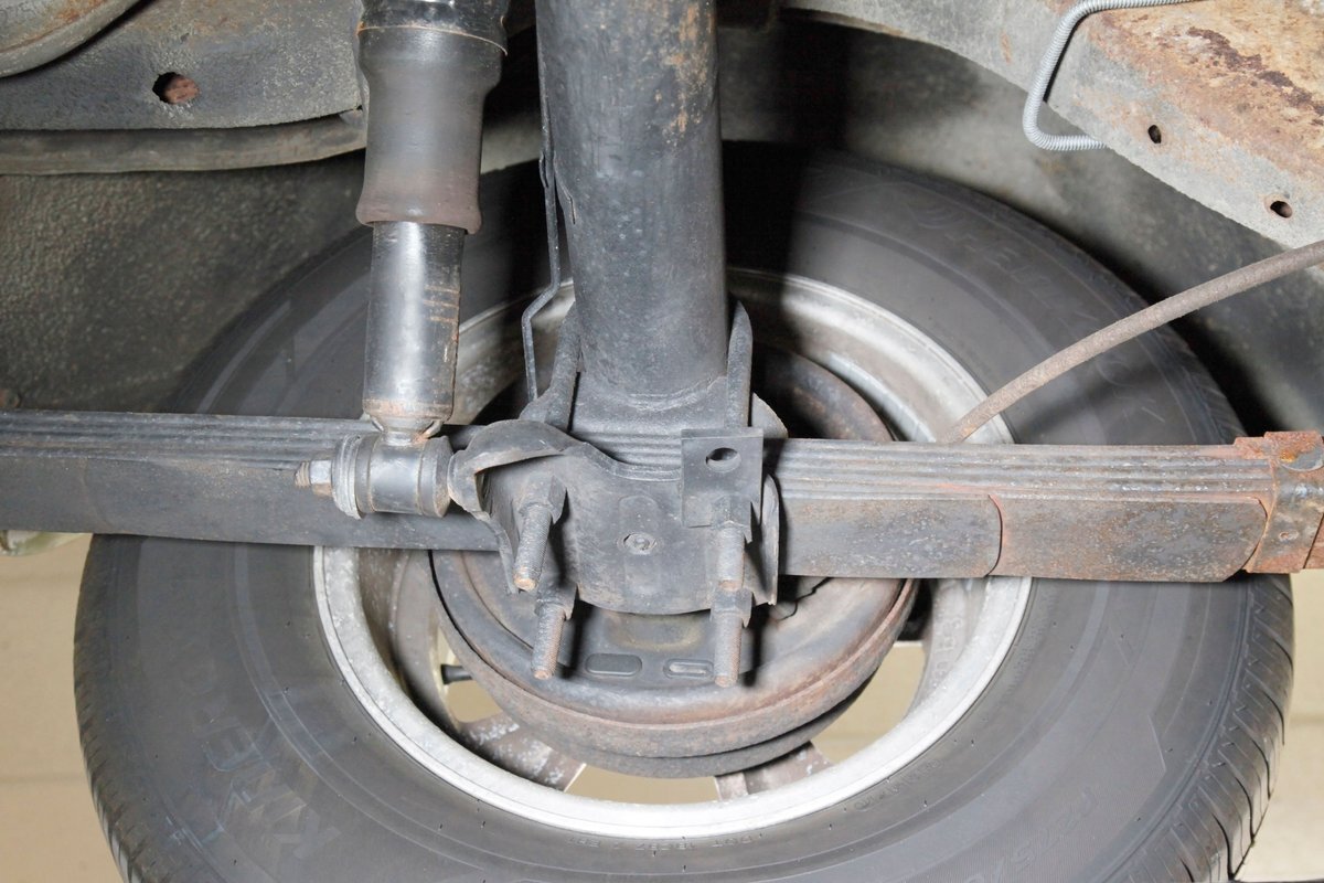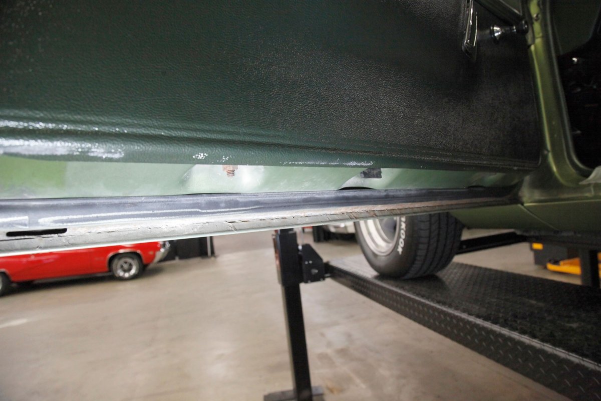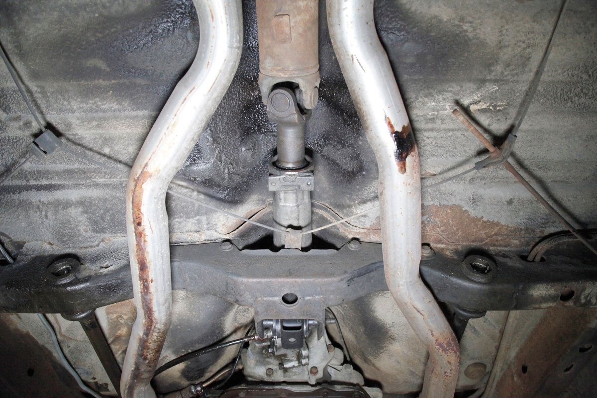 Slight surface rust is noted on an otherwise clean undercoated and patinaed frame and floor panels as well as underside of rockers. A newer Flowmaster dual exhaust snakes its way rearward from the headers attached to the 318ci mill. Providing the ride is an independent torsion bar front suspension with new ball joints and new air shocks and in the back we note leaf springs with more new air shocks. We note a new master cylinder actuating the power disc brakes with new hoses up front and power drums in the rear along with a new fuel tank. Our consignor also notes that the power steering box and power steering pump are also new.