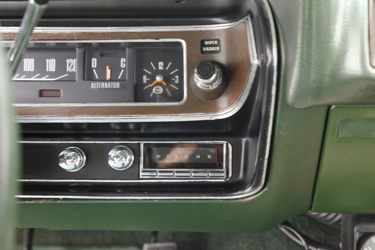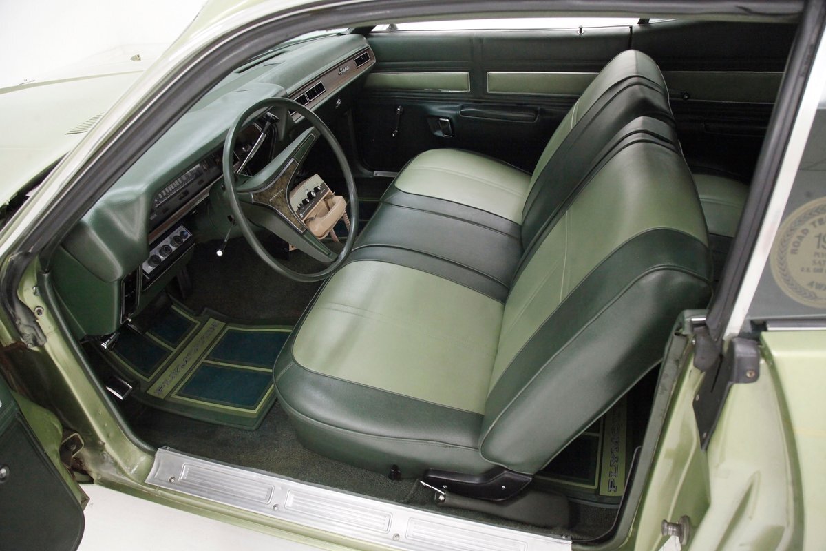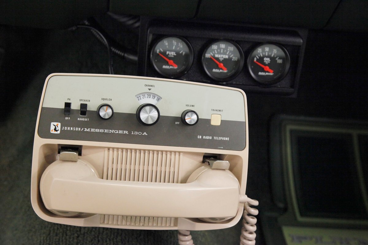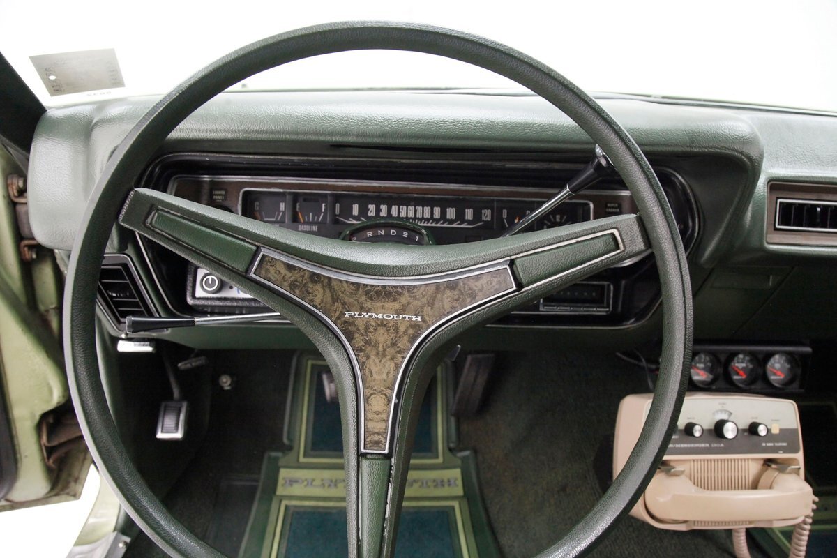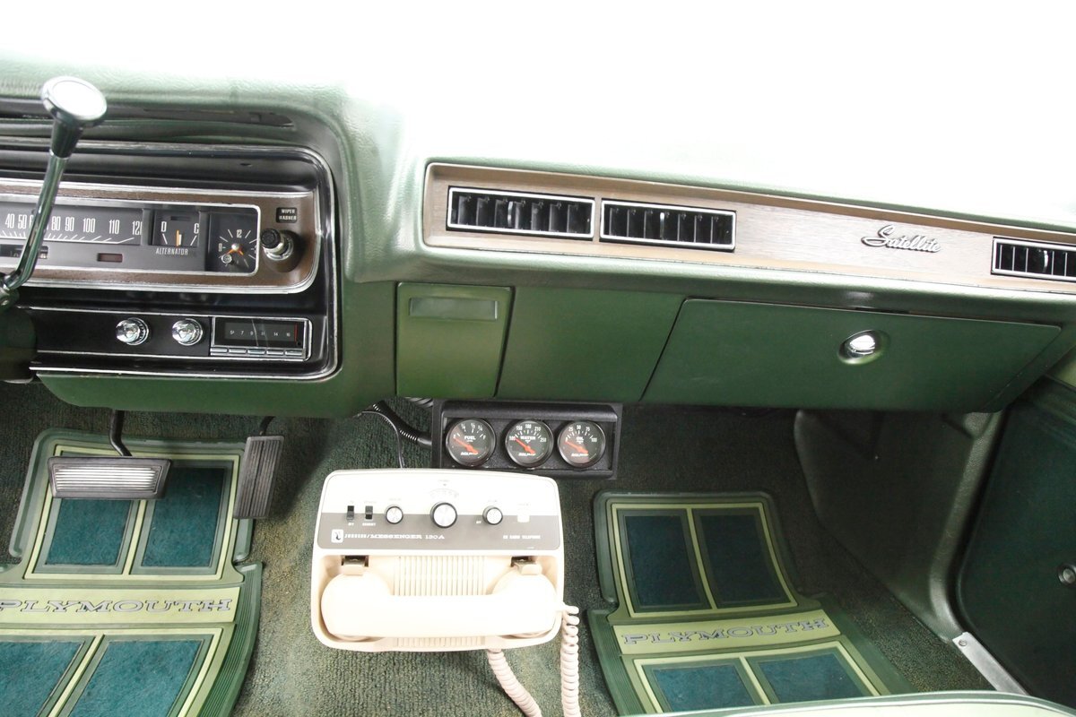 A swing of the doors and we see very nice medium green embossed upper door panels then some molded vinyl below in a darker green. A shiny door actuating paddle and window crank are also in this differing field of texture and surfaces and we are blown away by the chrome trimmed light green rectangular inserts. Upfront we note the split front bench in medium and light green vinyl with the light green reserved for embossed inserts and the dark for the smooth bolsters in nearly perfect condition. In back is a pattern matching bench which is also presenting very nicely and perfectly clean. This interior looks like new because it is with all the parts coming from the folks at Legendary Interiors. Some extra wood applique is on the dash and frames the squared off gauges, radio and black knobs and aftermarket AC and heat dials, while down below a modern AM/FM/Bluetooth radio resides in its factory location. New aftermarket gauges hang below dash central and on the hump is a Johnson/Messenger 130A 2-way CB radio In front of the passenger seat is a large glove box door below a Satellite badged band of applique and topping things off is a new padded dash topper, again from Legendary Interiors. On the steering column is the original 3 spoke dark green and applique Plymouth badged steering wheel. This is all within a field of like new dark green low pile carpeting and above is a tight dark green headliner and nice B pillar coverings with some embossing in back.