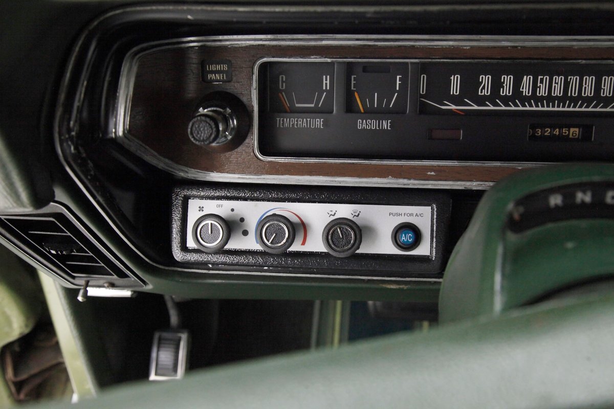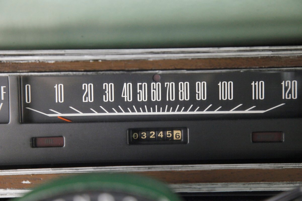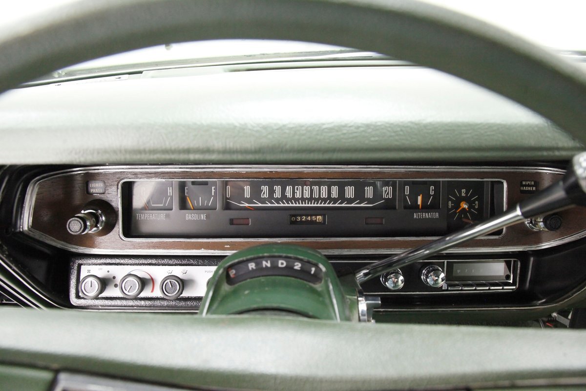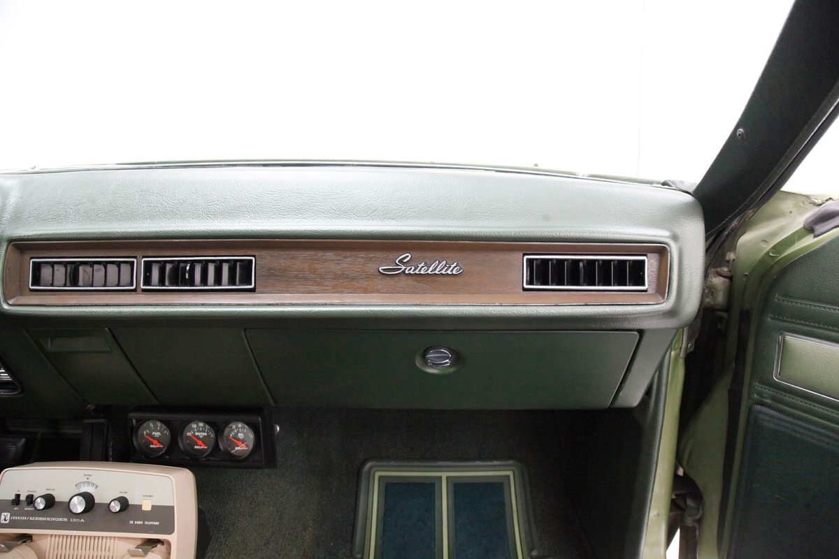 A swing of the doors and we see very nice medium green embossed upper door panels then some molded vinyl below in a darker green. A shiny door actuating paddle and window crank are also in this differing field of texture and surfaces and we are blown away by the chrome trimmed light green rectangular inserts. Upfront we note the split front bench in medium and light green vinyl with the light green reserved for embossed inserts and the dark for the smooth bolsters in nearly perfect condition. In back is a pattern matching bench which is also presenting very nicely and perfectly clean. This interior looks like new because it is with all the parts coming from the folks at Legendary Interiors. Some extra wood applique is on the dash and frames the squared off gauges, radio and black knobs and aftermarket AC and heat dials, while down below a modern AM/FM/Bluetooth radio resides in its factory location. New aftermarket gauges hang below dash central and on the hump is a Johnson/Messenger 130A 2-way CB radio In front of the passenger seat is a large glove box door below a Satellite badged band of applique and topping things off is a new padded dash topper, again from Legendary Interiors. On the steering column is the original 3 spoke dark green and applique Plymouth badged steering wheel. This is all within a field of like new dark green low pile carpeting and above is a tight dark green headliner and nice B pillar coverings with some embossing in back.