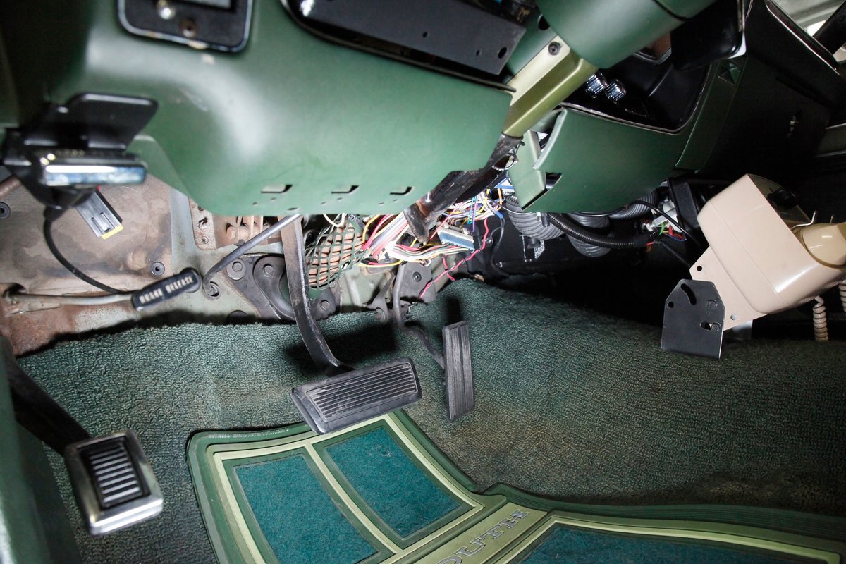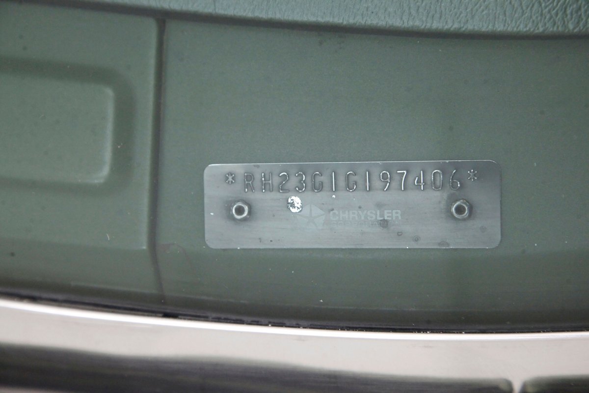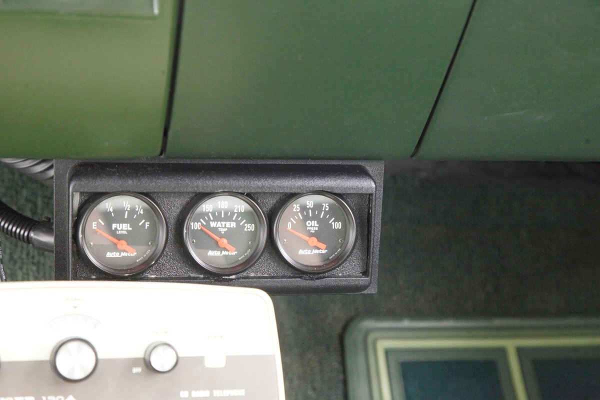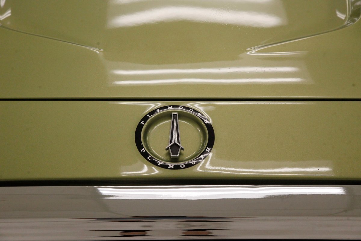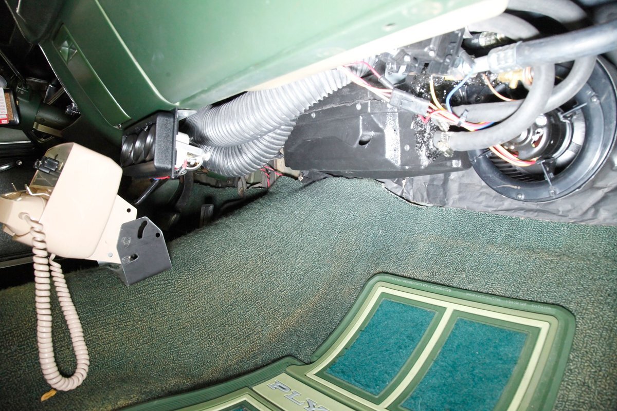 A swing of the doors and we see very nice medium green embossed upper door panels then some molded vinyl below in a darker green. A shiny door actuating paddle and window crank are also in this differing field of texture and surfaces and we are blown away by the chrome trimmed light green rectangular inserts. Upfront we note the split front bench in medium and light green vinyl with the light green reserved for embossed inserts and the dark for the smooth bolsters in nearly perfect condition. In back is a pattern matching bench which is also presenting very nicely and perfectly clean. This interior looks like new because it is with all the parts coming from the folks at Legendary Interiors. Some extra wood applique is on the dash and frames the squared off gauges, radio and black knobs and aftermarket AC and heat dials, while down below a modern AM/FM/Bluetooth radio resides in its factory location. New aftermarket gauges hang below dash central and on the hump is a Johnson/Messenger 130A 2-way CB radio In front of the passenger seat is a large glove box door below a Satellite badged band of applique and topping things off is a new padded dash topper, again from Legendary Interiors. On the steering column is the original 3 spoke dark green and applique Plymouth badged steering wheel. This is all within a field of like new dark green low pile carpeting and above is a tight dark green headliner and nice B pillar coverings with some embossing in back.