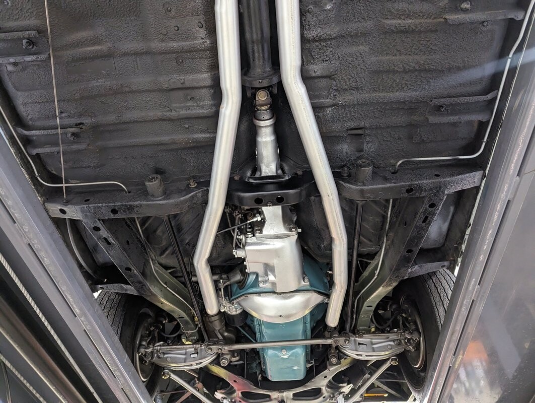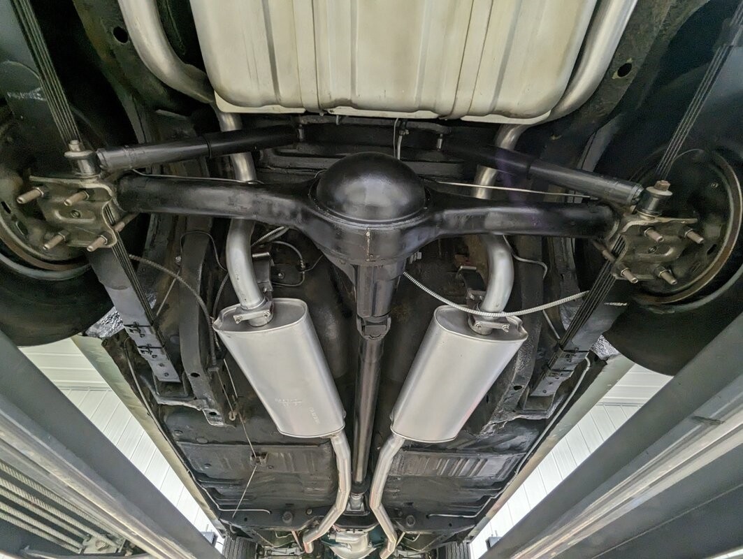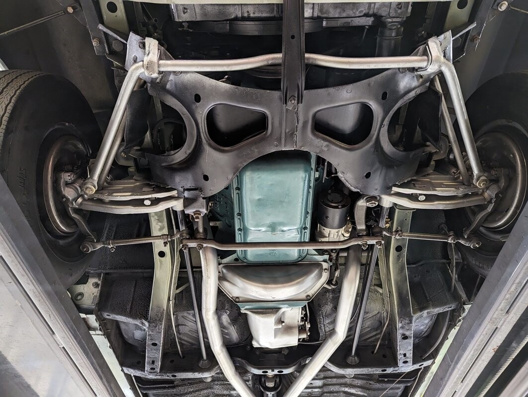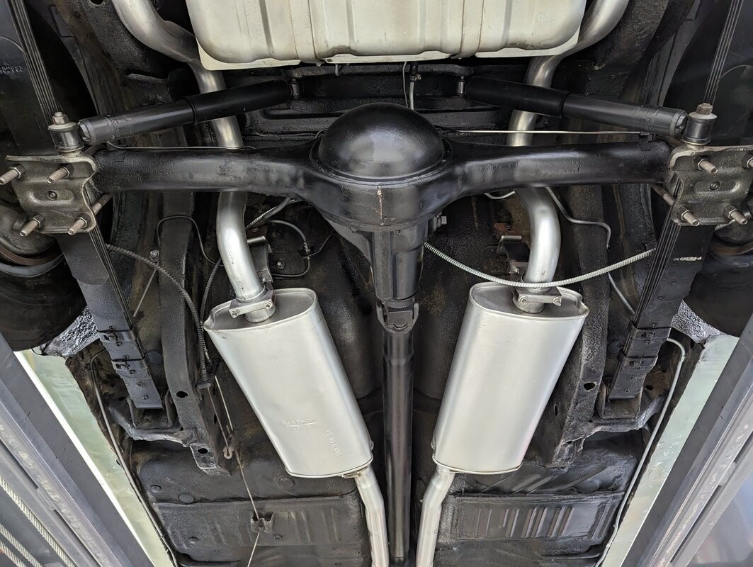 UNDERSIDE: Under this car appears to be rust free original metal. It looks like just about every component has been rebuilt or replaced. The steering, front and rear suspension were rebuilt. New dual exhaust was neatly installed. The fuel system was replaced including the tank. Correct drum brakes at all four wheels have been gone through, e-brake is hooked up. Looking up at the motor, it's clean and painted nicely, it has a high torque starter. Original #s matching 4-speed transmission was completely rebuilt. Everything is powered through the original restored 8 3/4 rear end with 3.55 Sure Grip gears.