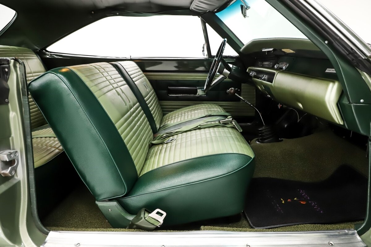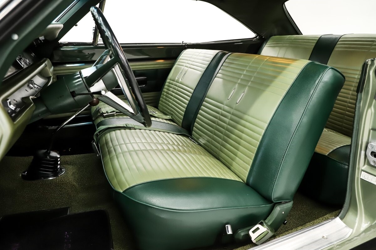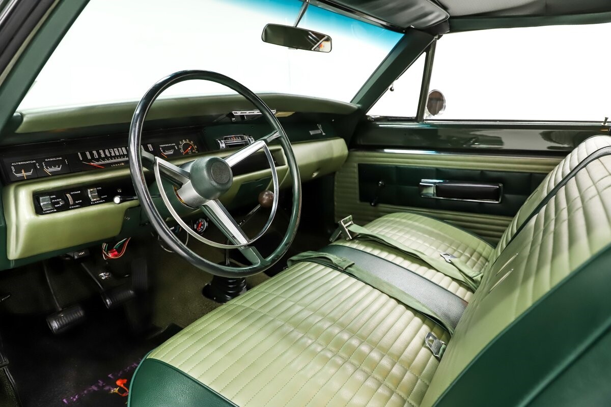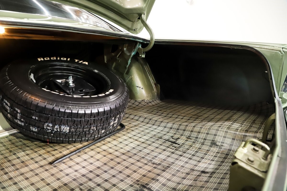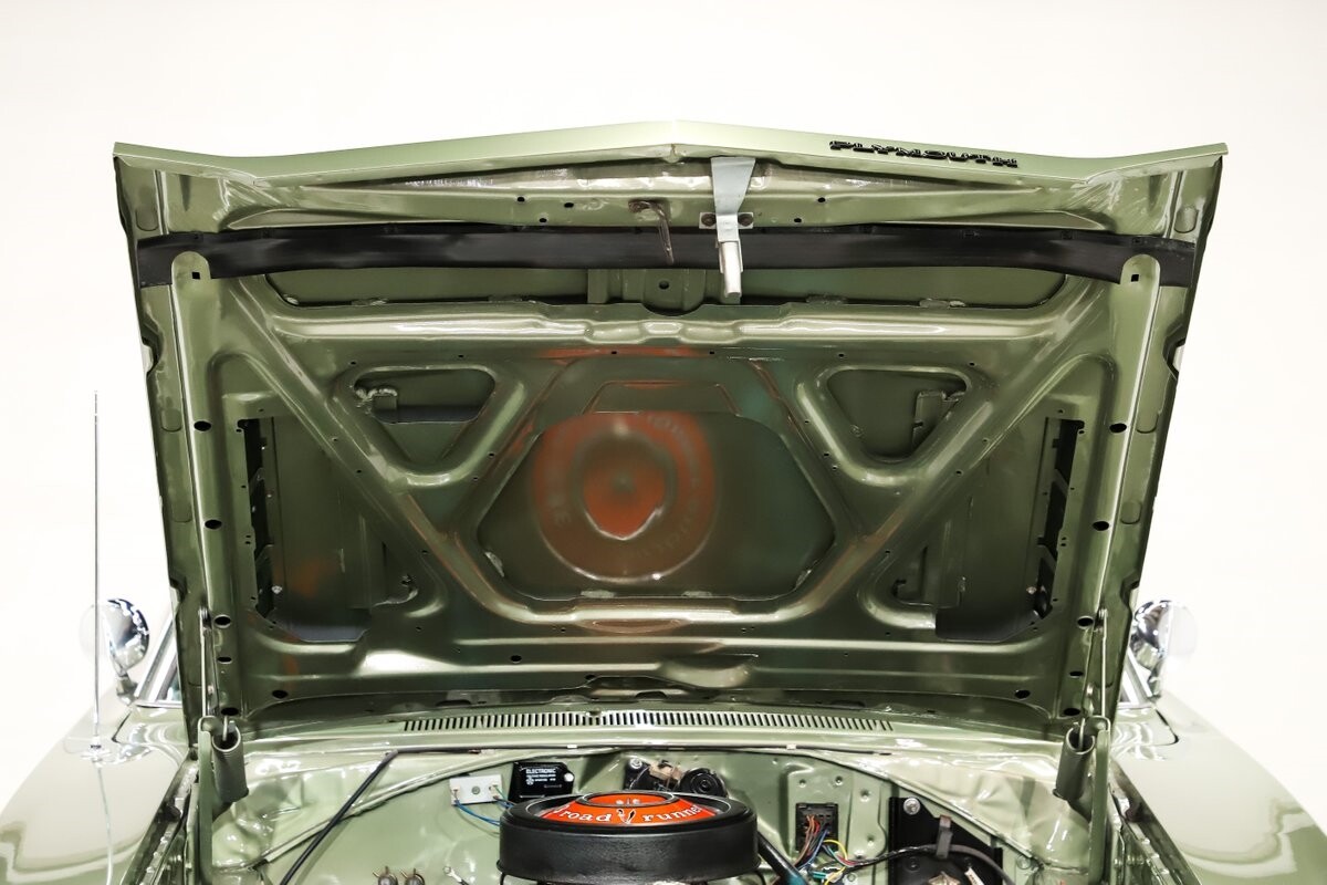 EXTERIOR: The body is clean and straight with excellent gaps. It was media blasted before being painted professionally back to its original Avocado Green with black vinyl top. 3 coats of base coat, 3 coats of clear, sanded between coats. The vinyl top looks new. Mostly original chrome with minimal patina. Optional fender mounted turn signals look new. Crystal clear windshield. Rolling on correct magnum wheels wrapped in reproduction Wide Oval redlines.