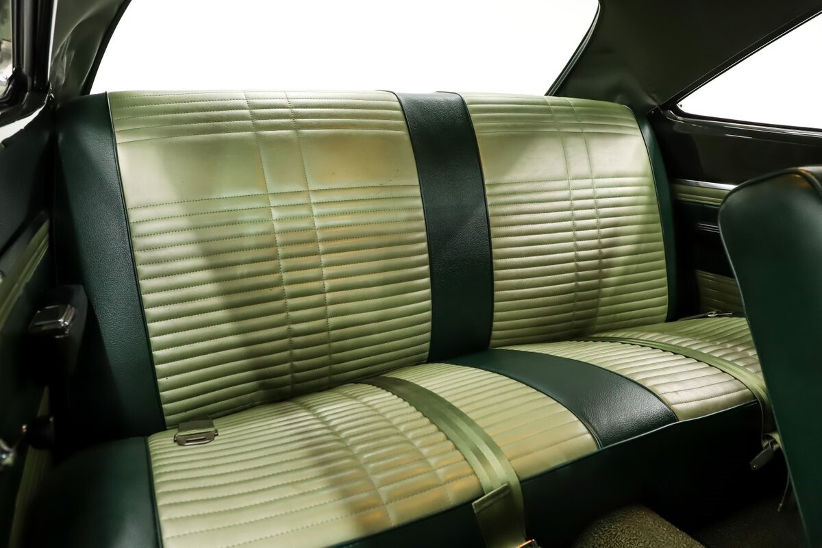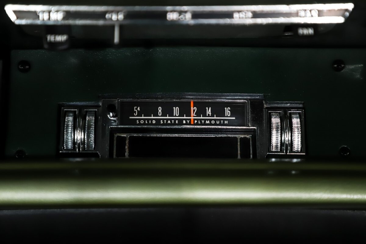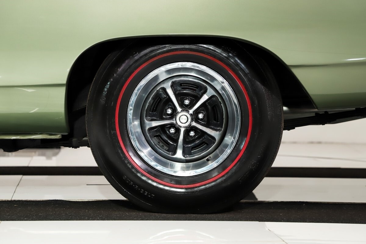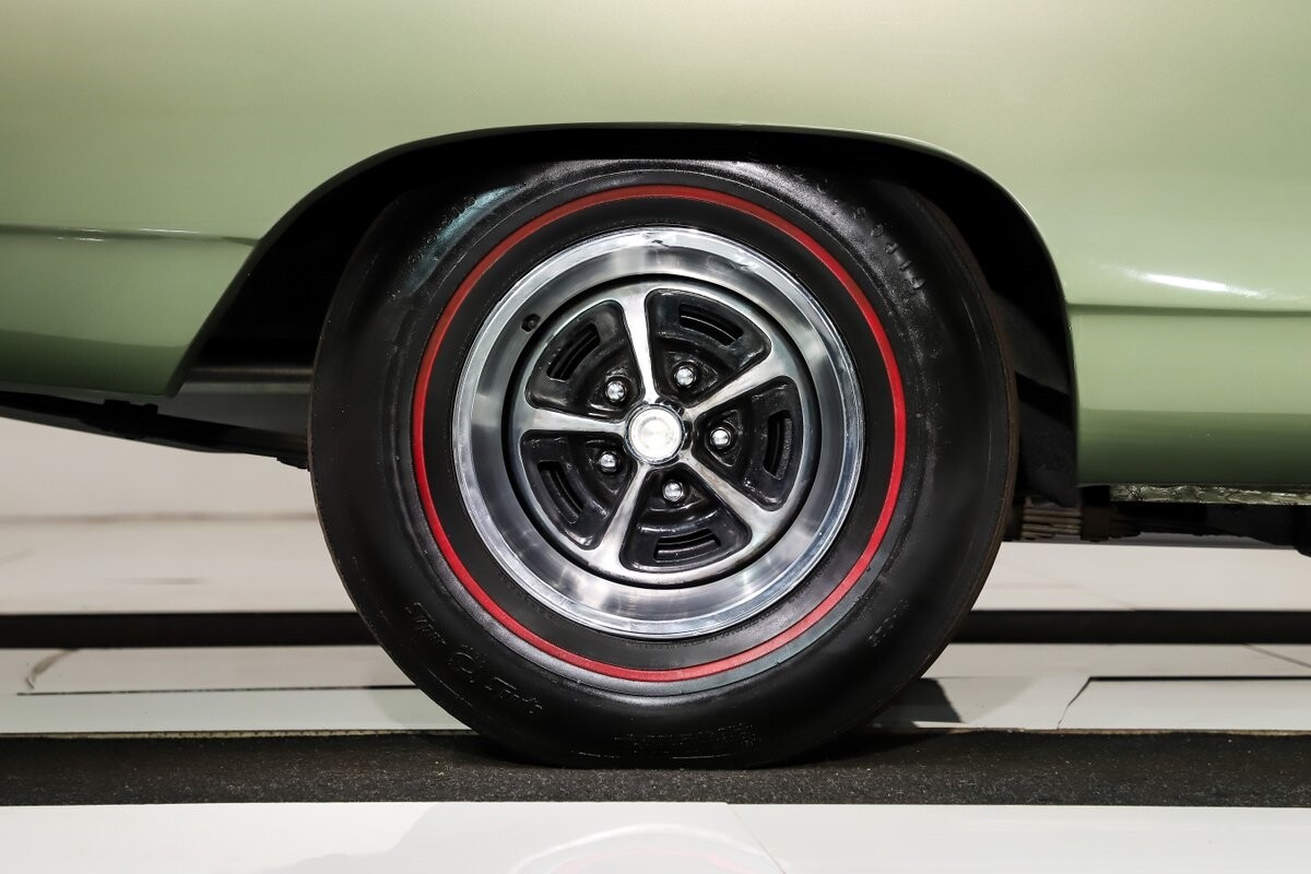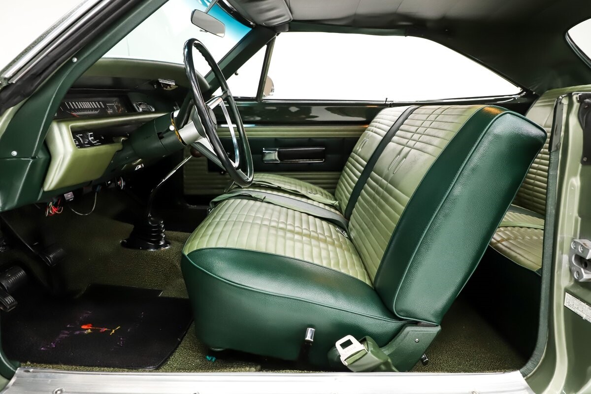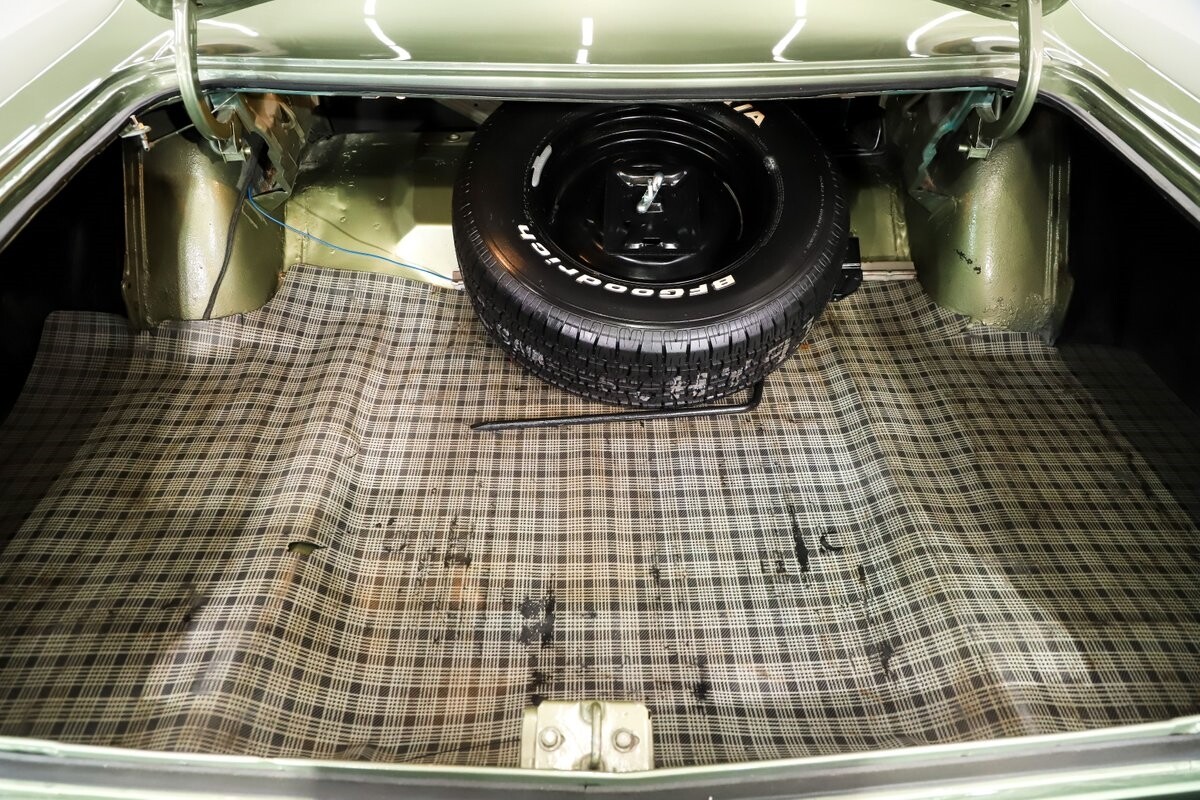 EXTERIOR: The body is clean and straight with excellent gaps. It was media blasted before being painted professionally back to its original Avocado Green with black vinyl top. 3 coats of base coat, 3 coats of clear, sanded between coats. The vinyl top looks new. Mostly original chrome with minimal patina. Optional fender mounted turn signals look new. Crystal clear windshield. Rolling on correct magnum wheels wrapped in reproduction Wide Oval redlines.
