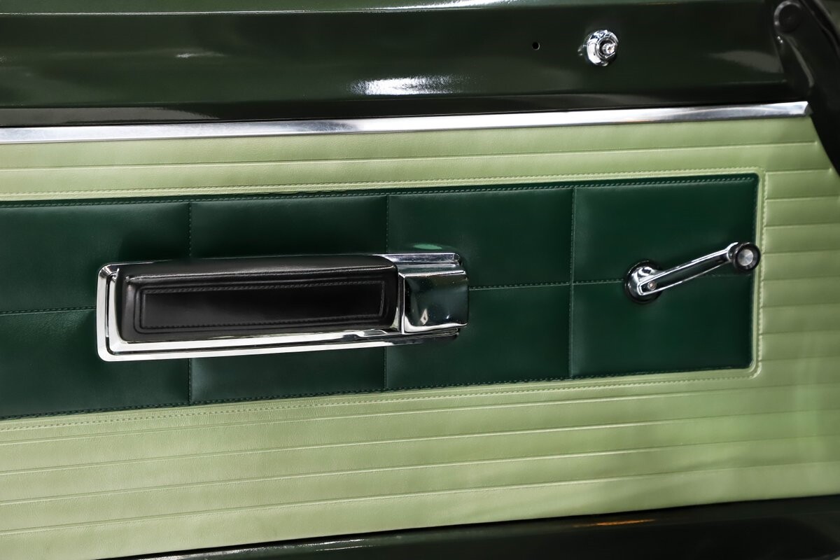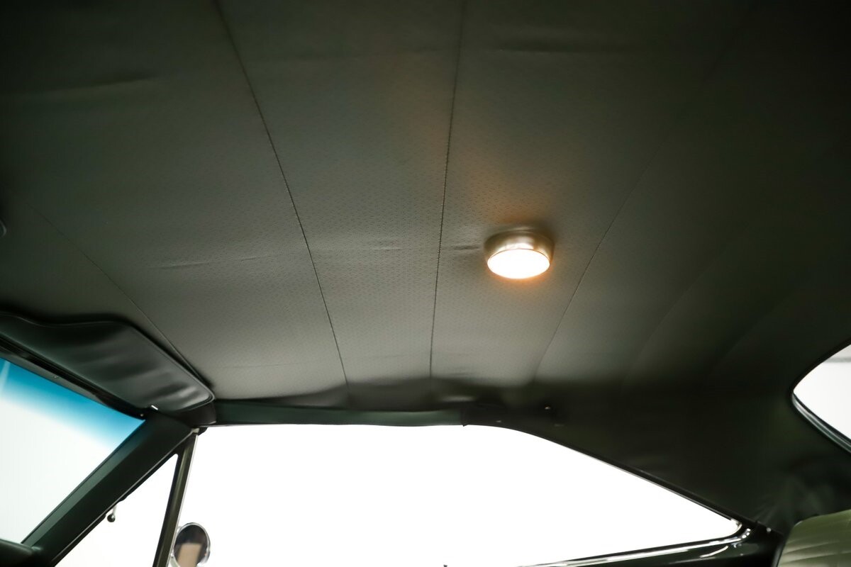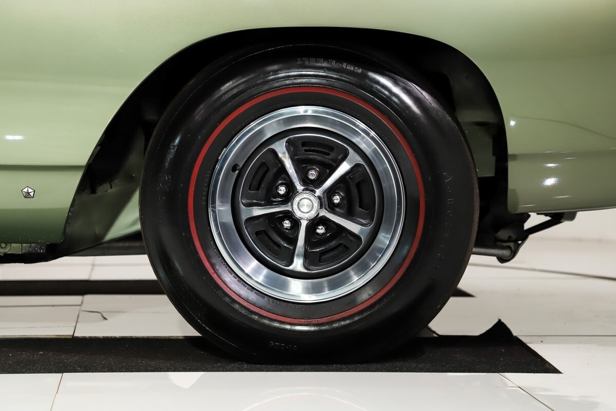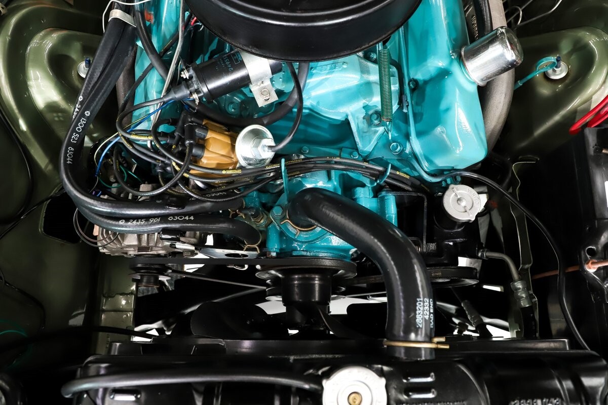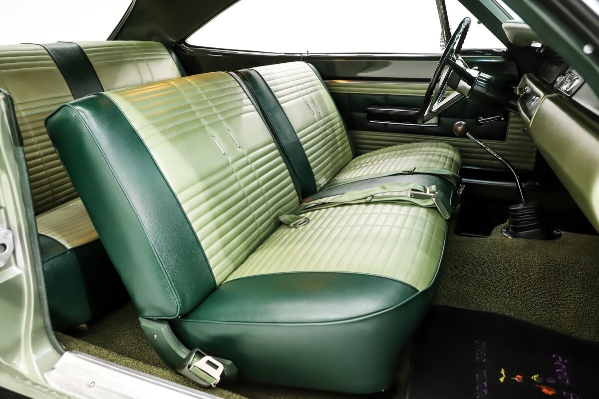 EXTERIOR: The body is clean and straight with excellent gaps. It was media blasted before being painted professionally back to its original Avocado Green with black vinyl top. 3 coats of base coat, 3 coats of clear, sanded between coats. The vinyl top looks new. Mostly original chrome with minimal patina. Optional fender mounted turn signals look new. Crystal clear windshield. Rolling on correct magnum wheels wrapped in reproduction Wide Oval redlines.