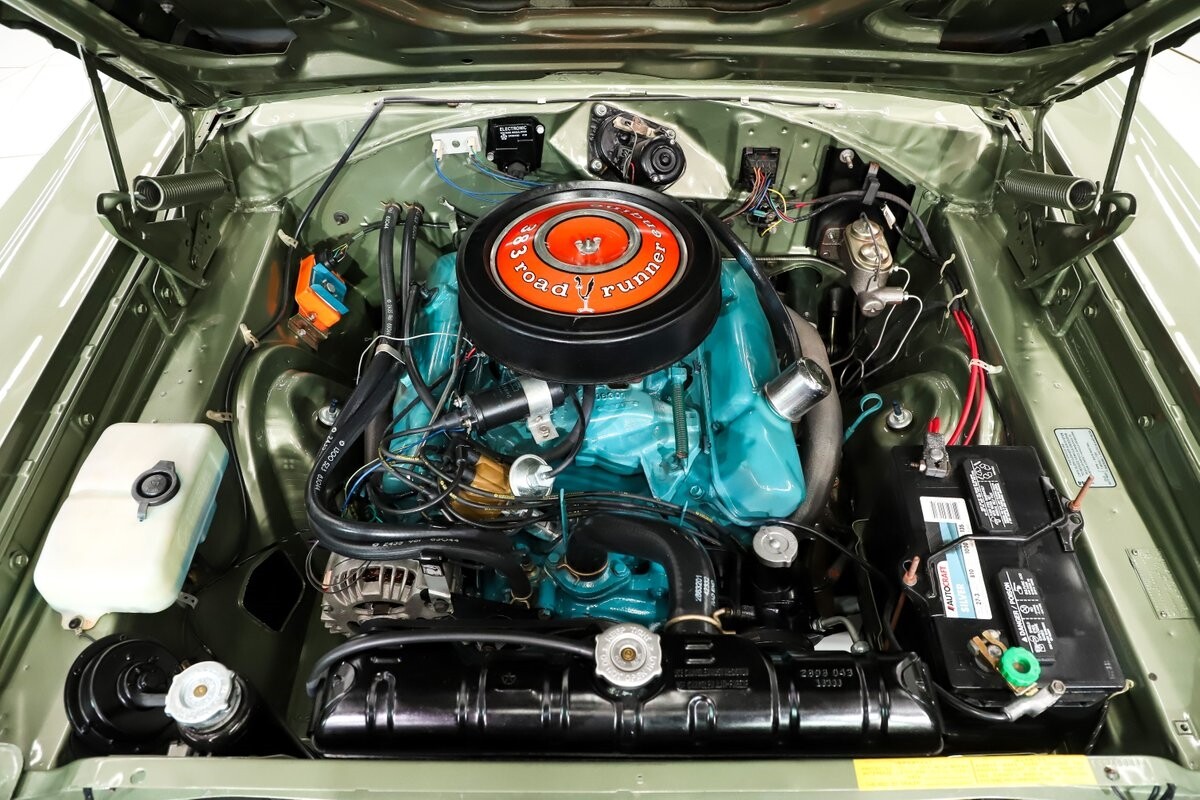 ENGINE COMPARTMENT: Numbers matching 383 rebuilt and bored to 406ci! Upgraded with Keith Black pistons, Comp Cams, Magnum Muscle cam and high-volume oil pump, rebuilt heads. Stock manifolds, air cleaner, valve covers etc. Reproduction plug wires, hoses and clamps. Upgraded Edelbrock carb, high-capacity alternator, and electronic ignition added. It has power steering; the steering column has been rebuilt. It is very proper: battery is secured, wires are properly attached and routed, squirters are hooked up. The original fender tag is still in place and #s on core support matches. The engine bay is painted beautifully.
