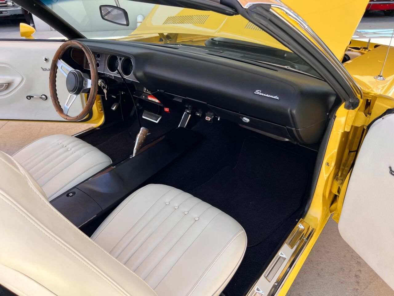 1970 Plymouth 426 Hemi-Powered Cuda Convertible Replica Why This Car Is Special One of the most valuable and collectable muscle cars ever was the 1970 Plymouth 426 Hemi-Powered Cuda Convertible. If you can find a one for sale, you had better have deep pockets as there were only a dozen or so ever made and they command in the millions of dollars to be able to buy one! We have a great alternative for you here at Skyway Classics with a 1970 Plymouth Barracuda convertible replica that was rotisserie rebuilt and modified including the installation of a 426 cubic inch Hemi V8 crate engine and a 3-speed 727 automatic transmission from Mancini Racing. It has been repainted in Lemon Twist with a new white leather interior, and a host of other parts into a stunning representation of that icon Hemi Cuda. Features 1970 Plymouth 426 Hemi-Powered Cuda Convertible Replica 426 cubic inch Hemi V8 crate engine Hemi K-member Holley 750 carburetor Hydraulic camshaft Ceramic long-tube headers connected to a mandrel-bent dual exhaust Lightweight driveshaft with 1350 Spicer U-joints Powermaster starter and alternator Black Hemi valve covers Black Hemi shaker air cleaner assembly Performance spark plug wires Power steering and brakes 3-speed 727 automatic transmission Dana 60 9A 3/4 aˆ? rear axle with Heavy-duty Dutchman 35 spline axles from Mancini Racing. Front KYB shocks Adjustable rear Koni shocks Lightweight driveshaft Front discs with slotted and drilled rotors and rear drums 15aˆ3 Rallye wheels BFGoodrich Radial T/A tires Heidts front end, Hemi leaf springs. New white leather upholstery was sourced from Legendary Auto Interiors Matching door panels Contrasting black carpets Reconditioned seat belts Power steering Tilting steering column Wood-rimmed steering wheel Pistol grip slap-stick shifter Rallye instrument cluster was also refurbished and includes an 8k-rpm tachometer, a 150-mph speedometer, clock, a combo alternator/oil/water temperature gauge, and fuel level gauge AM/FM/8-track stereo with MP3 input Battery disconnect switch within reach of the driver Finished in Lemon Twist Shaker hood Black aˆoeHemiaˆ? hockey stick stripes White convertible top Underside was coated in Rhino Lining Mechanical Our Cuda has had the factory 318ci V8 engine replaced during refurbishment with a 426 cubic inch Hemi V8 crate engine on the Hemi K-member. It has a Holley 750 carburetor, hydraulic camshaft, ceramic long-tube headers connected to a mandrel-bent dual exhaust, a lightweight driveshaft with 1350 Spicer U-joints, Powermaster starter and alternator, black Hemi valve covers, black Hemi shaker air cleaner assembly, performance spark plug wires, power steering and brakes, with everything looking just as it should from 1970. The power is sent to the rear wheels through a 3-speed 727 automatic transmission and Dana 60 9A 3/4 aˆ? rear axle with Heavy-duty Dutchman 35 spline axles, all from Mancini Racing. Additional performance modifications include front KYB shocks, adjustable rear Koni shocks, a lightweight driveshaft, while braking is handled by front discs with slotted and drilled rotors and rear drums, and track-style front and rear brake linings. It rides on 15aˆ3 Rallye wheels and wears BFGoodrich Radial T/A tires while the suspension utilizes a Heidts front end, and Hemi leaf springs. Interior New white leather upholstery was sourced from Legendary Auto Interiors and installed during the restoration along with matching door panels, contrasting black carpets, and reconditioned seat belts. Equipment includes power steering with a tilting steering column and a wood-rimmed steering wheel, a pistol grip slap-stick shifter, and slotted courtesy lights. The Rallye instrument cluster was also refurbished and includes an 8k-rpm tachometer, a 150-mph speedometer, clock, a combo alternator/oil/water temperature gauge, and fuel level gauge. It also has an AM/FM/8-track stereo with MP3 input as is a battery disconnect switch within reach of th