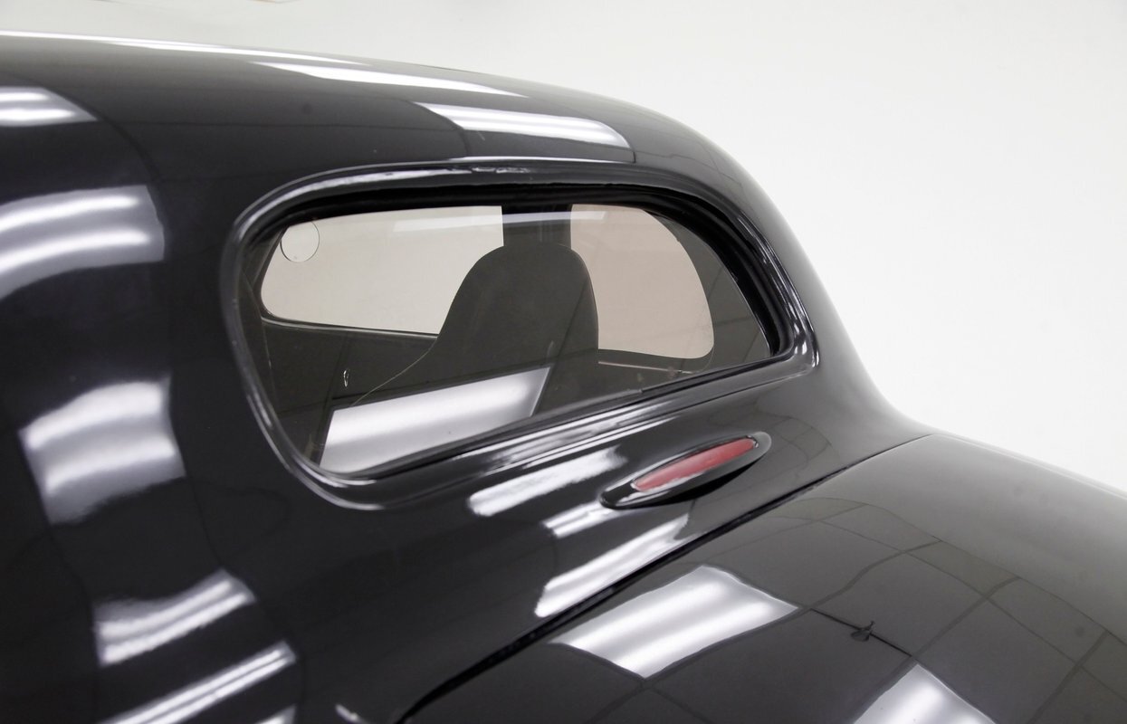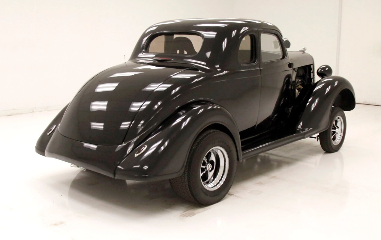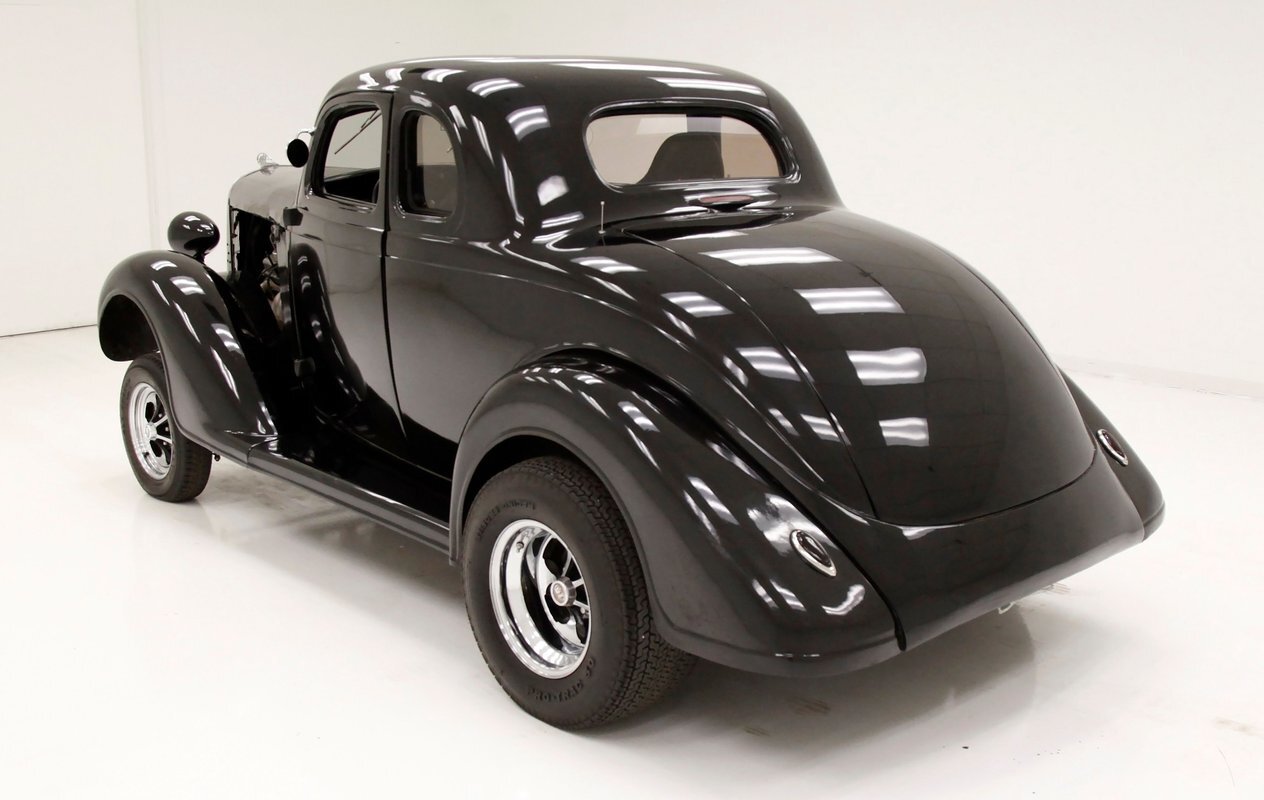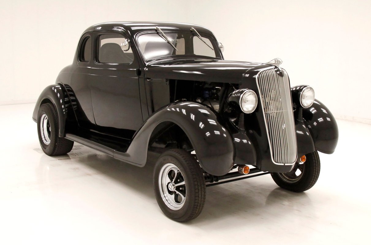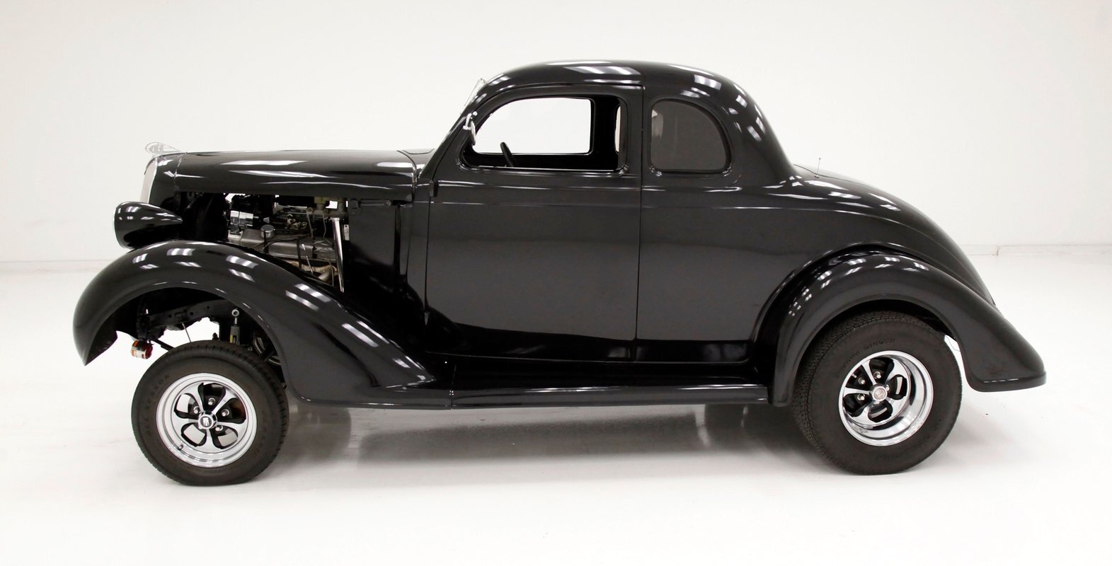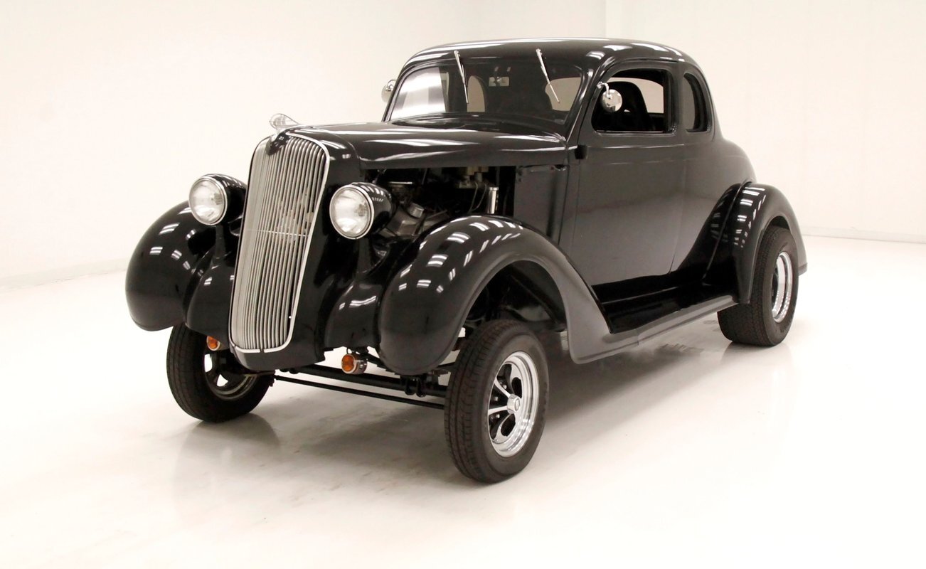 For consignment, a 5-window version of a Plymouth coupe that has been modified as a street rod in gasser form. Major engine improvements have been made to the V8 which has long since replaced the inline 6-cylinder engine that came with the car from the showroom.