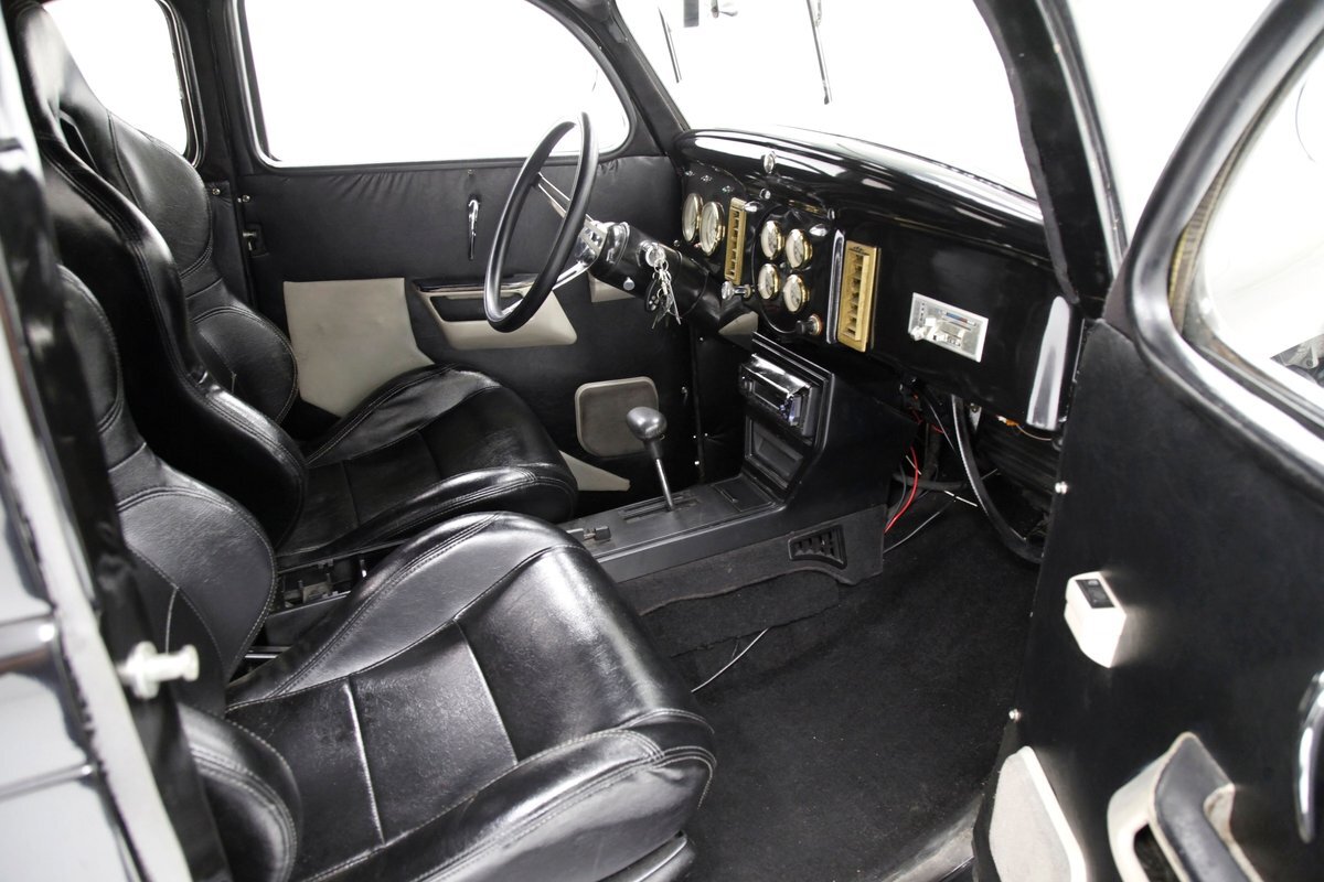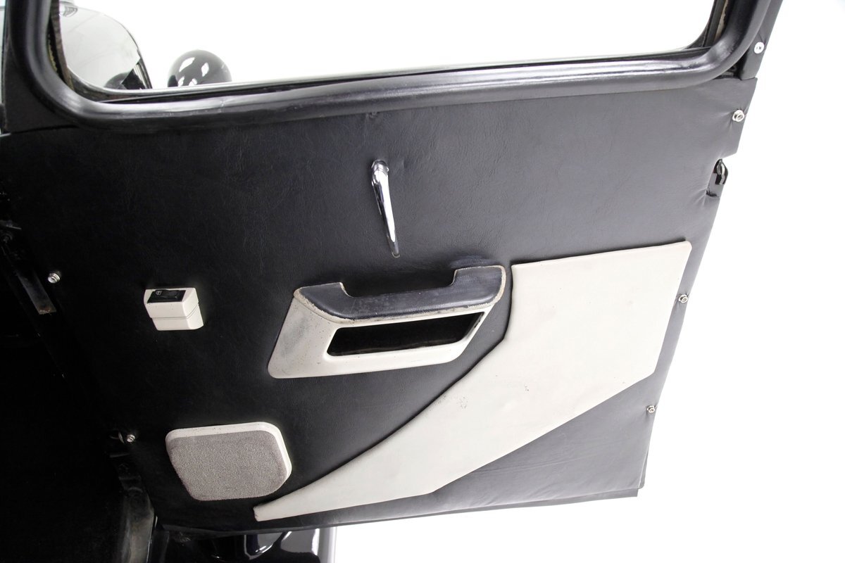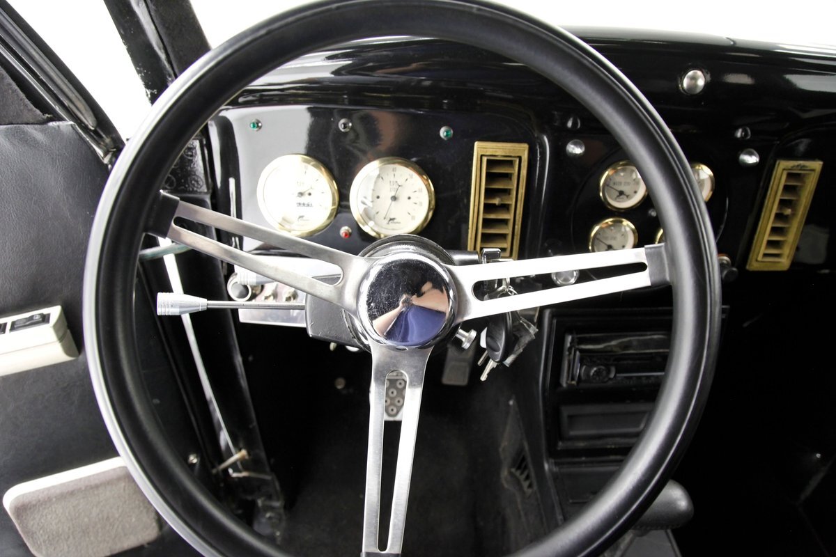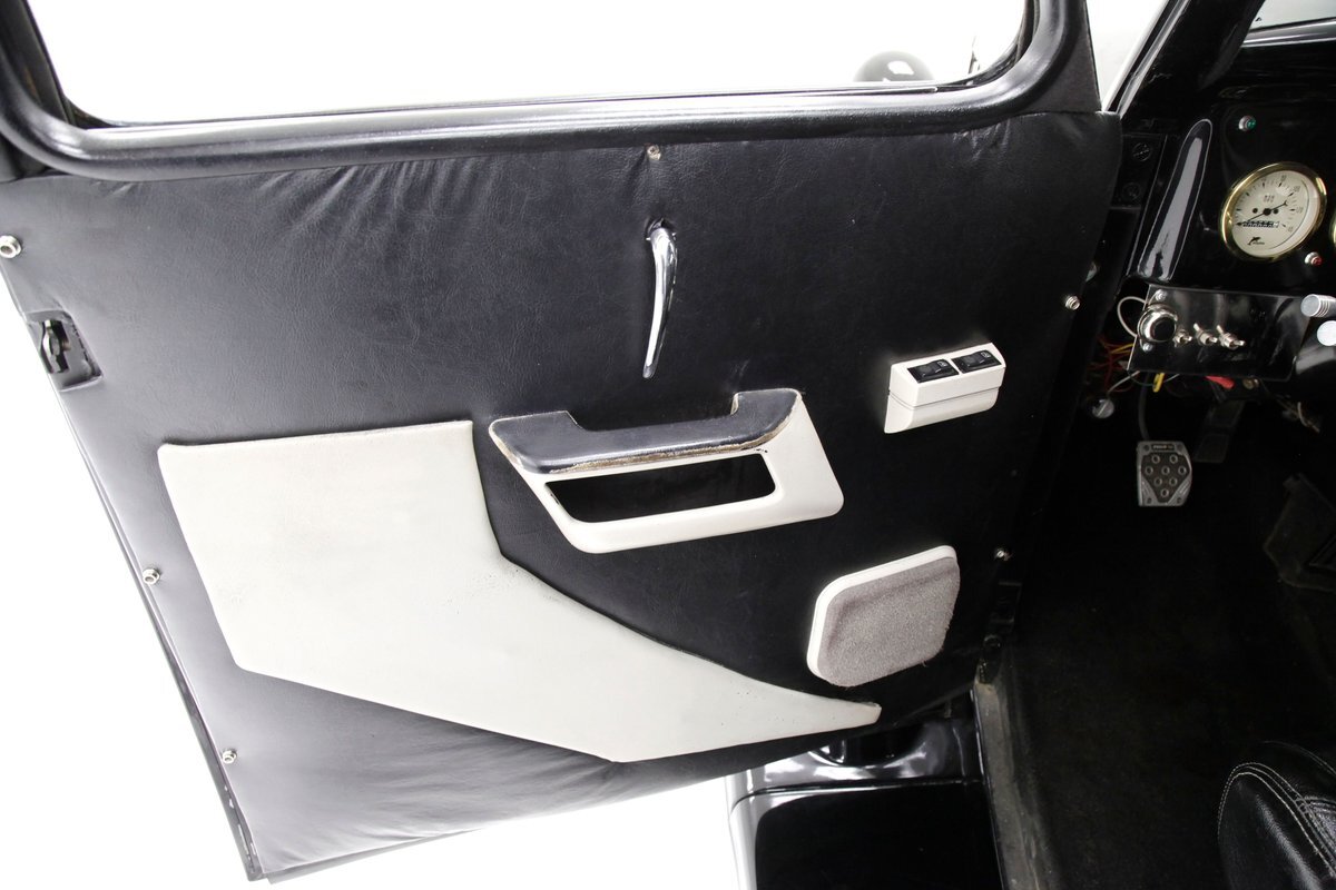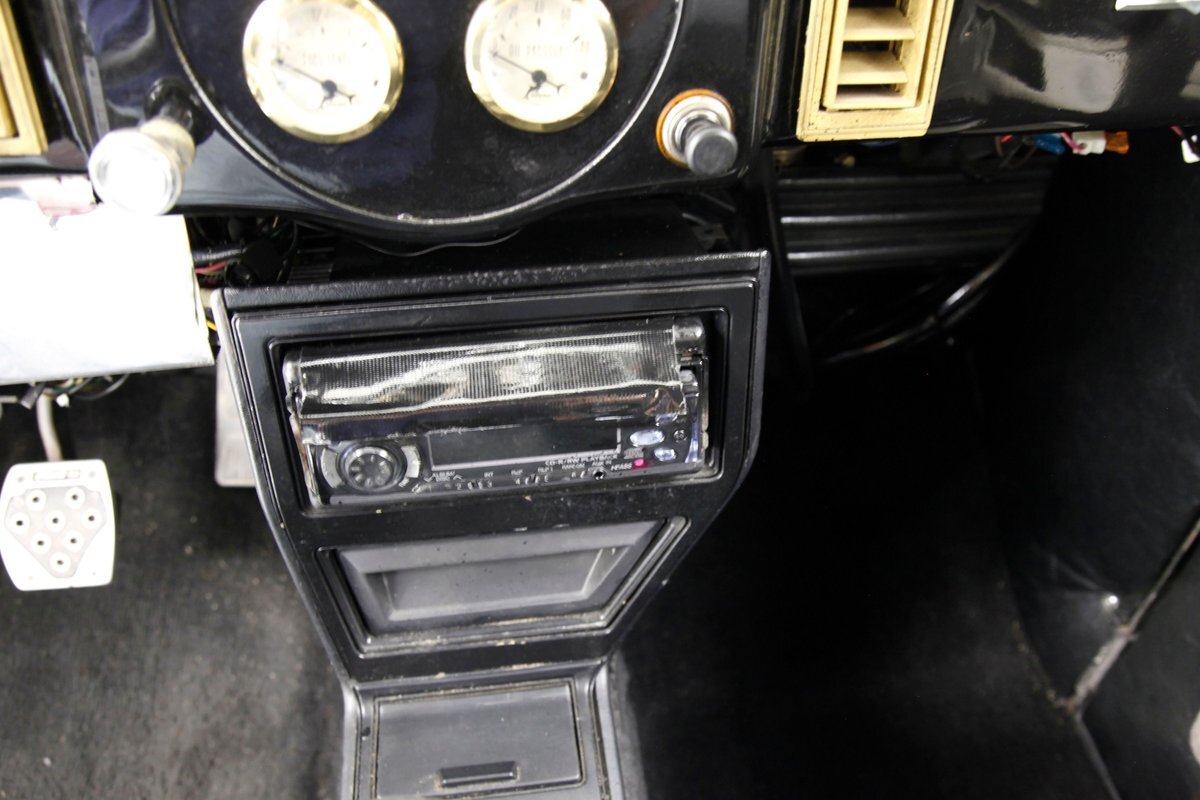 With little left from the original car, beautiful buckets wrapped in black, with white stitching creates the allure of wonderfully aged leather. The door panels are finished the same way as the buckets but have white vinyl inlays for some extra bling. We see a large white vinyl swoop along with white highlighting around the power window switches, speakers and armrest support. A center console has been added, and has a storage compartment sans lid, houses the gear selector and wraps up to meet the dash all the while holding an aftermarket AM/FM/CD stereo. Fronting the dash is a GM tilt steering column topped with a 3 spoke black rimmed steering wheel. The dash front is done to a near mirror finish, and houses gold bezeled Dolphin vintage looking gauges along with gold painted heater vents. More black vinyl makes up the rear side panels and covers the small package tray behind the seat. A good condition but sagging black headliner hangs above and looks splendid.