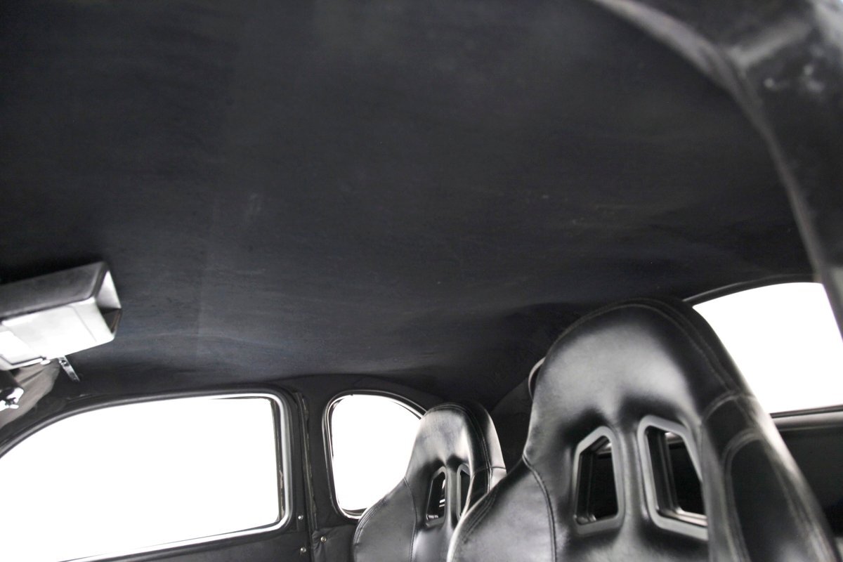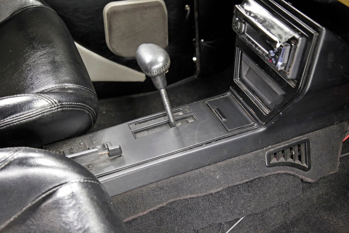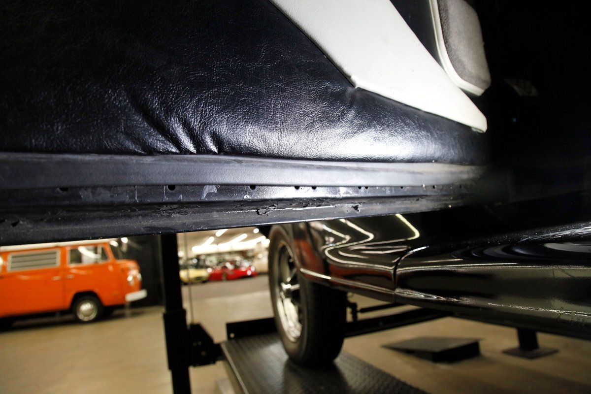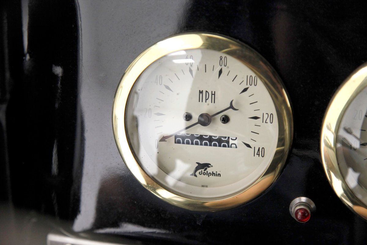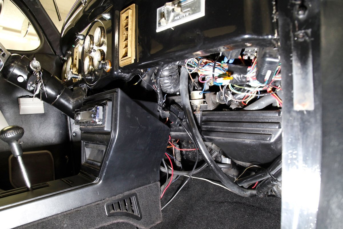 With little left from the original car, beautiful buckets wrapped in black, with white stitching creates the allure of wonderfully aged leather. The door panels are finished the same way as the buckets but have white vinyl inlays for some extra bling. We see a large white vinyl swoop along with white highlighting around the power window switches, speakers and armrest support. A center console has been added, and has a storage compartment sans lid, houses the gear selector and wraps up to meet the dash all the while holding an aftermarket AM/FM/CD stereo. Fronting the dash is a GM tilt steering column topped with a 3 spoke black rimmed steering wheel. The dash front is done to a near mirror finish, and houses gold bezeled Dolphin vintage looking gauges along with gold painted heater vents. More black vinyl makes up the rear side panels and covers the small package tray behind the seat. A good condition but sagging black headliner hangs above and looks splendid.