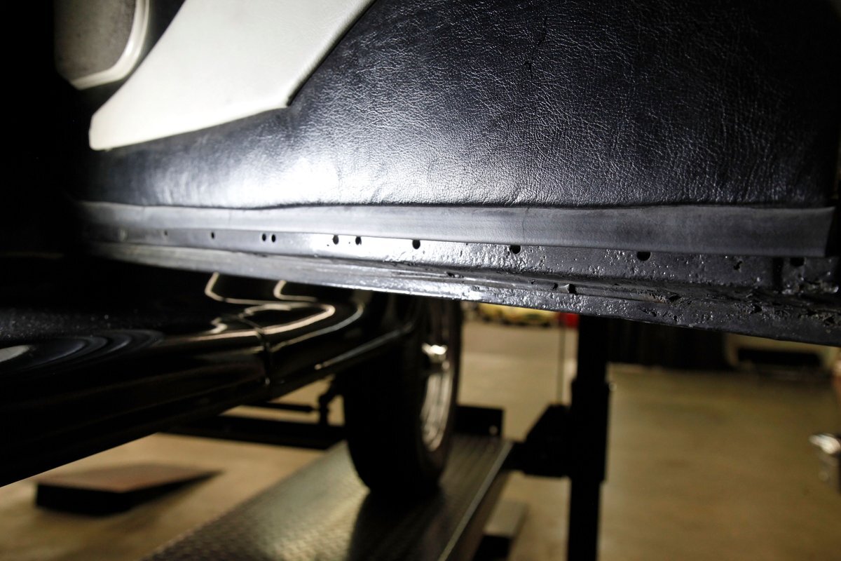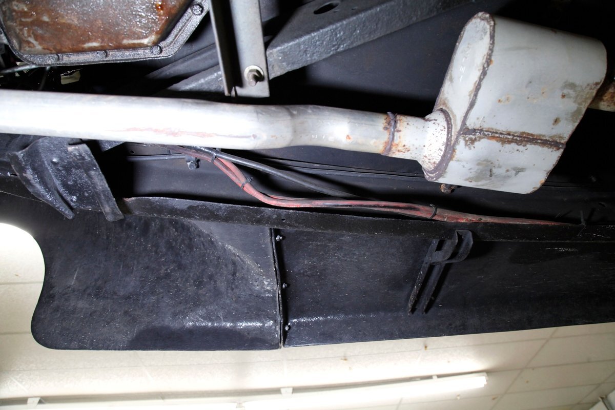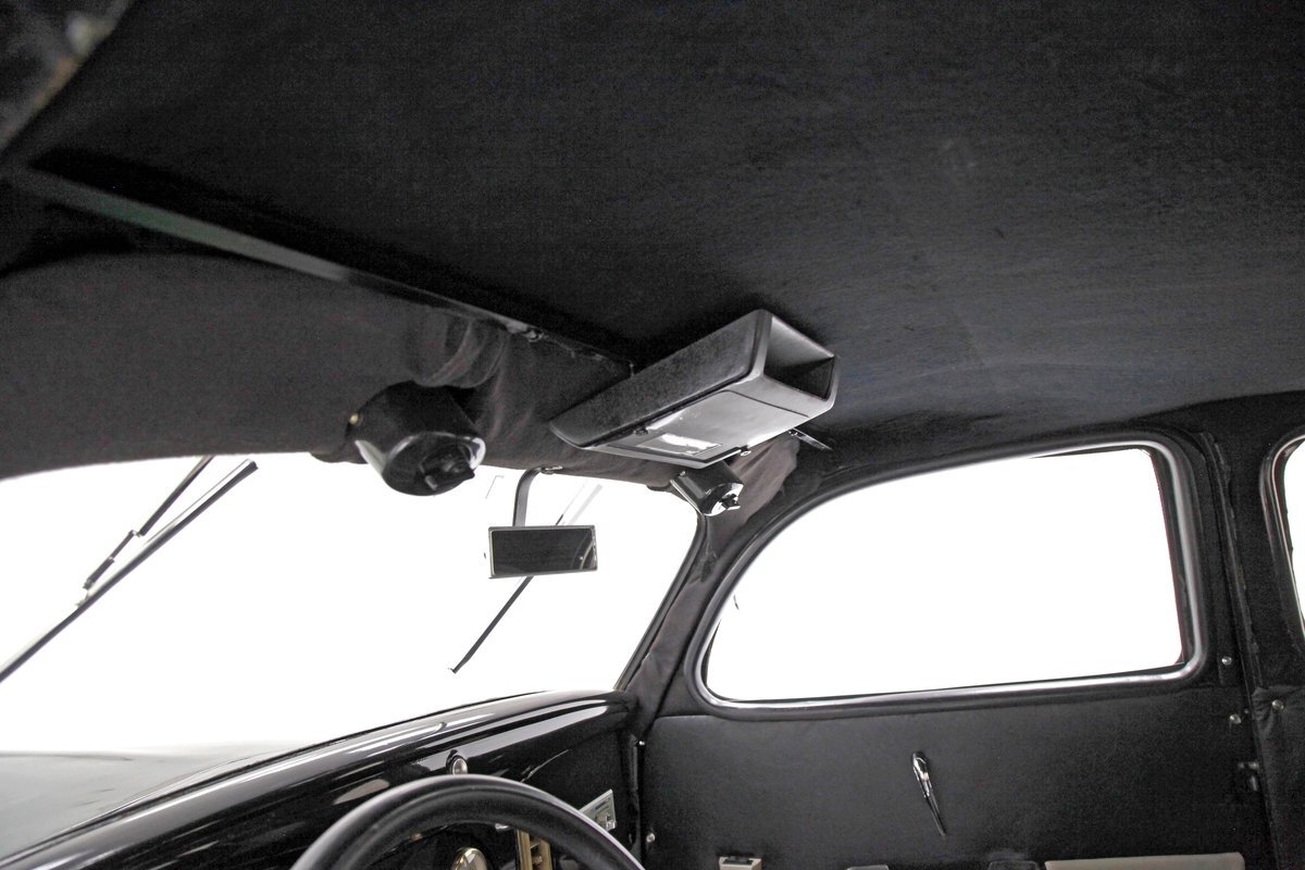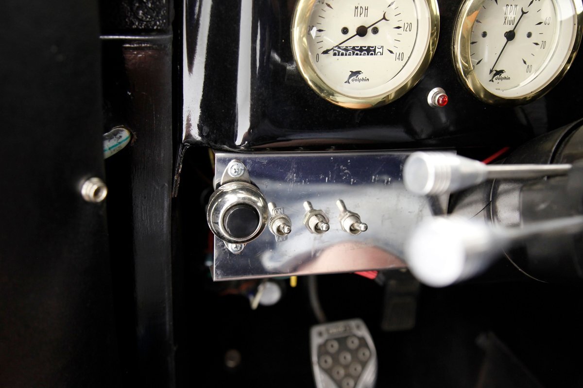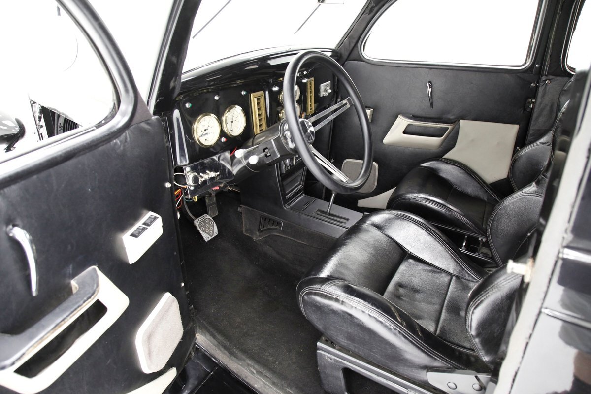 With little left from the original car, beautiful buckets wrapped in black, with white stitching creates the allure of wonderfully aged leather. The door panels are finished the same way as the buckets but have white vinyl inlays for some extra bling. We see a large white vinyl swoop along with white highlighting around the power window switches, speakers and armrest support. A center console has been added, and has a storage compartment sans lid, houses the gear selector and wraps up to meet the dash all the while holding an aftermarket AM/FM/CD stereo. Fronting the dash is a GM tilt steering column topped with a 3 spoke black rimmed steering wheel. The dash front is done to a near mirror finish, and houses gold bezeled Dolphin vintage looking gauges along with gold painted heater vents. More black vinyl makes up the rear side panels and covers the small package tray behind the seat. A good condition but sagging black headliner hangs above and looks splendid.