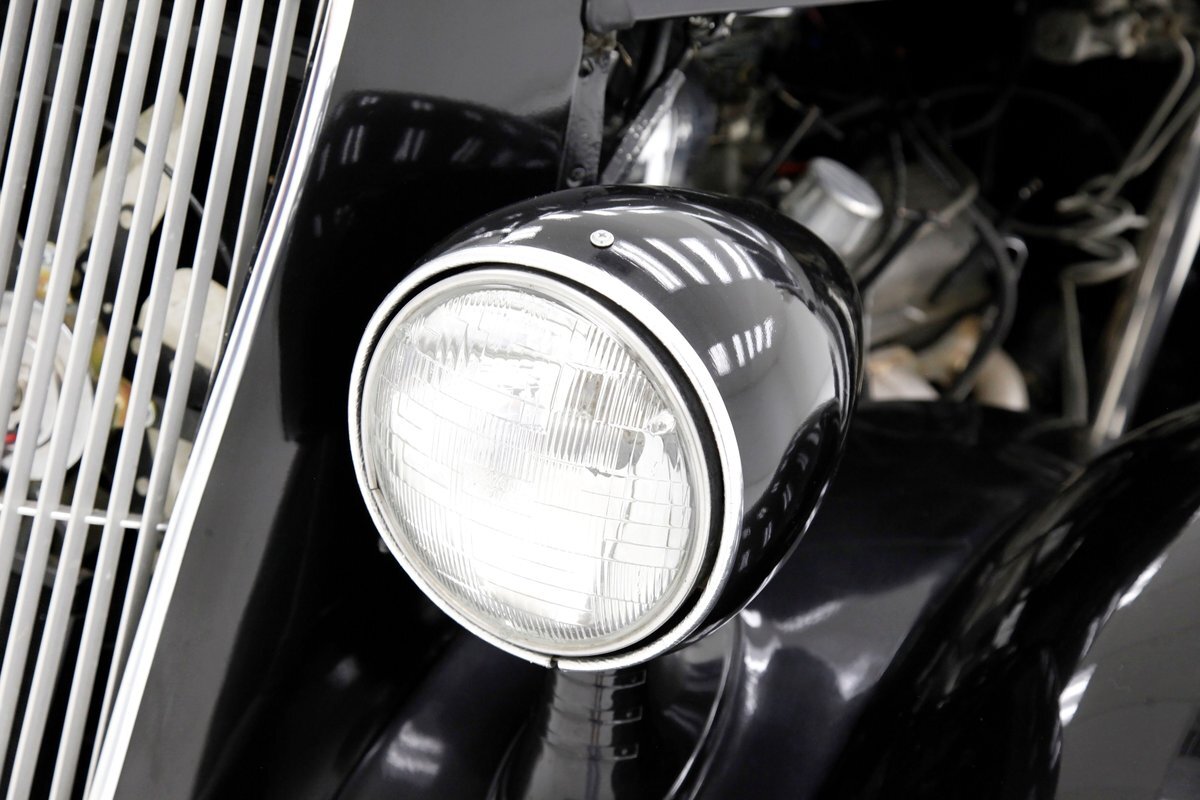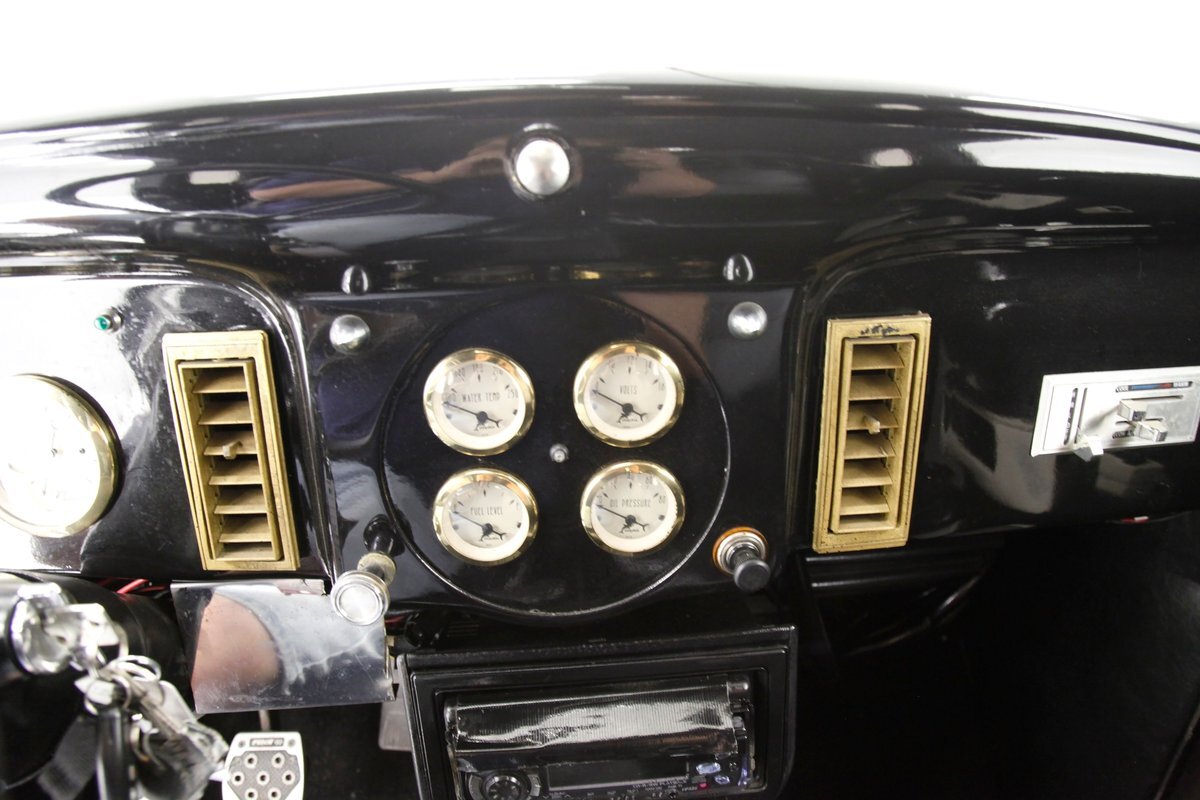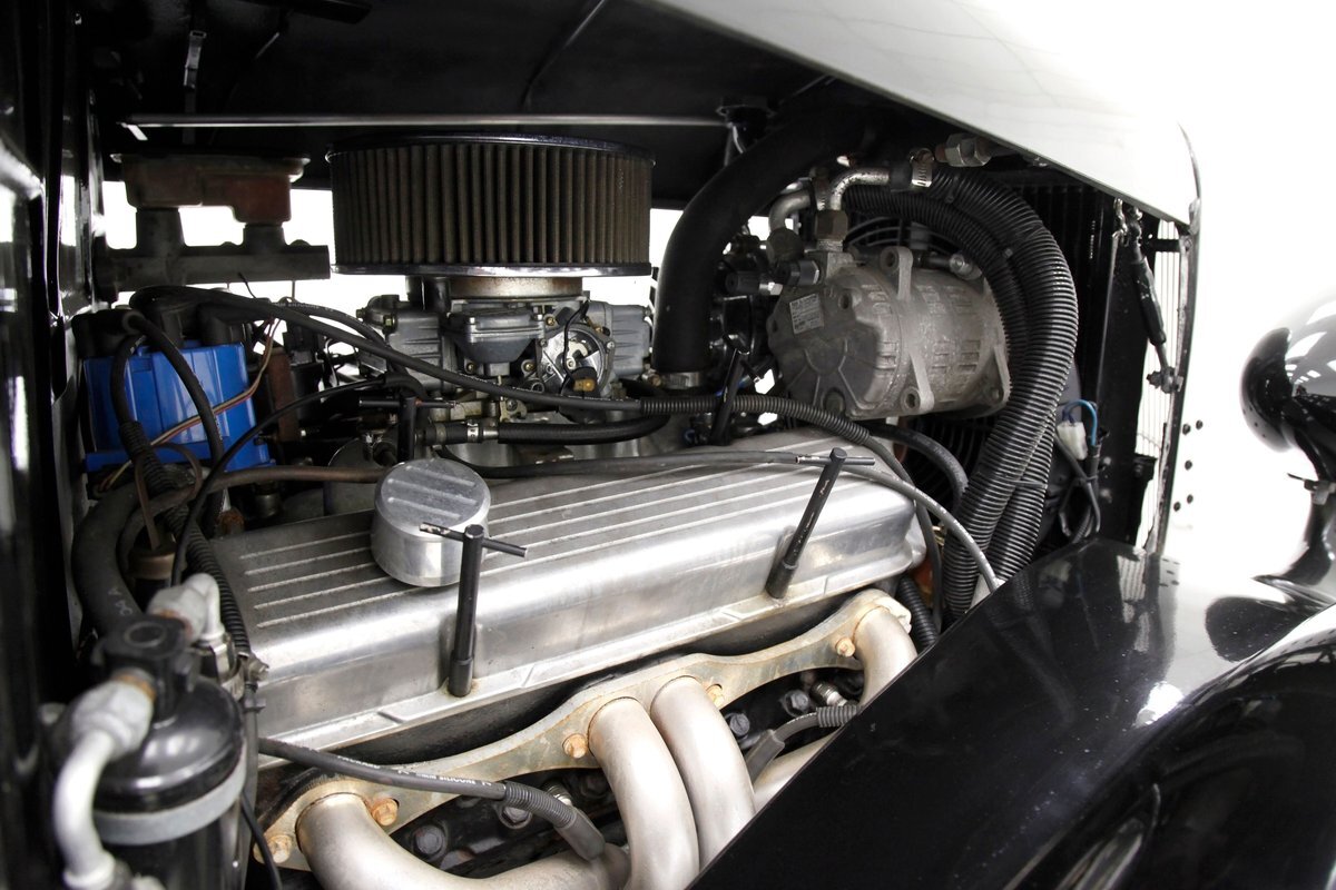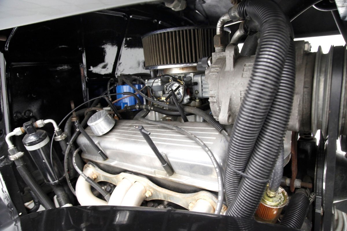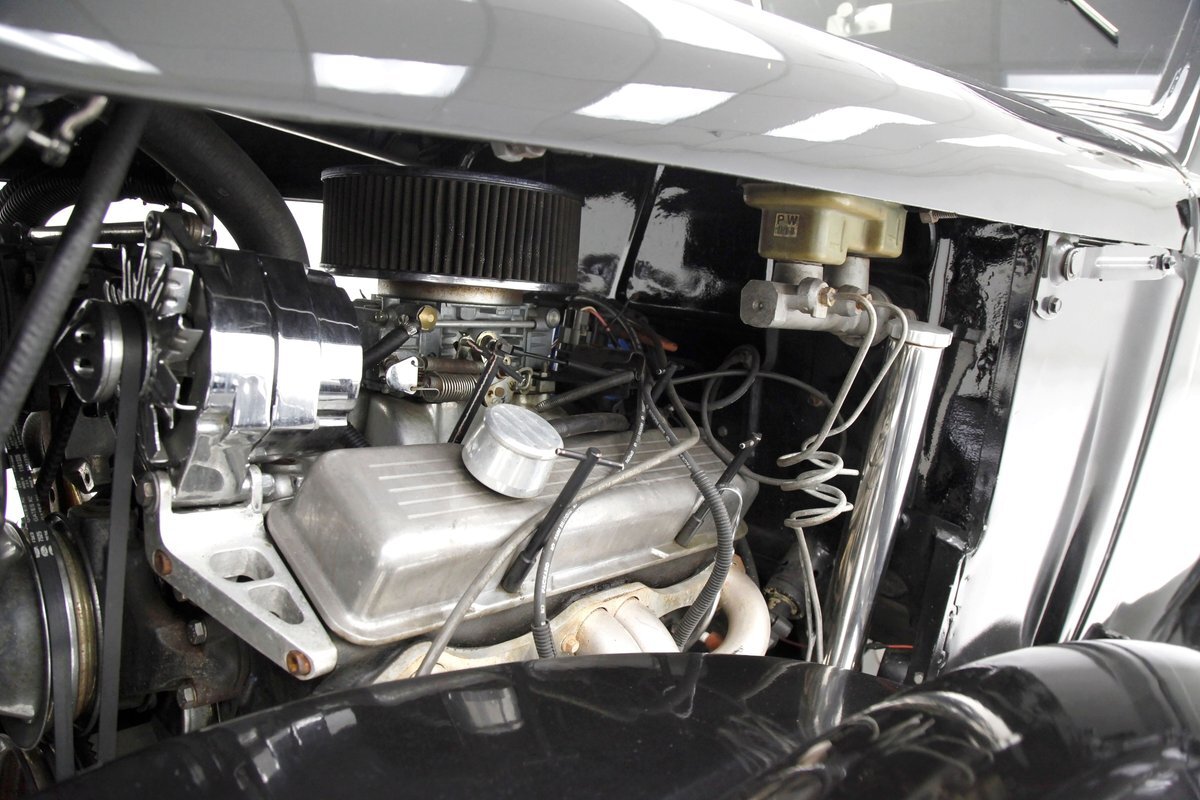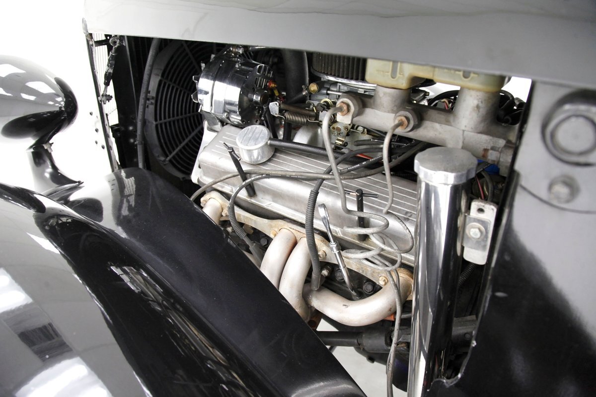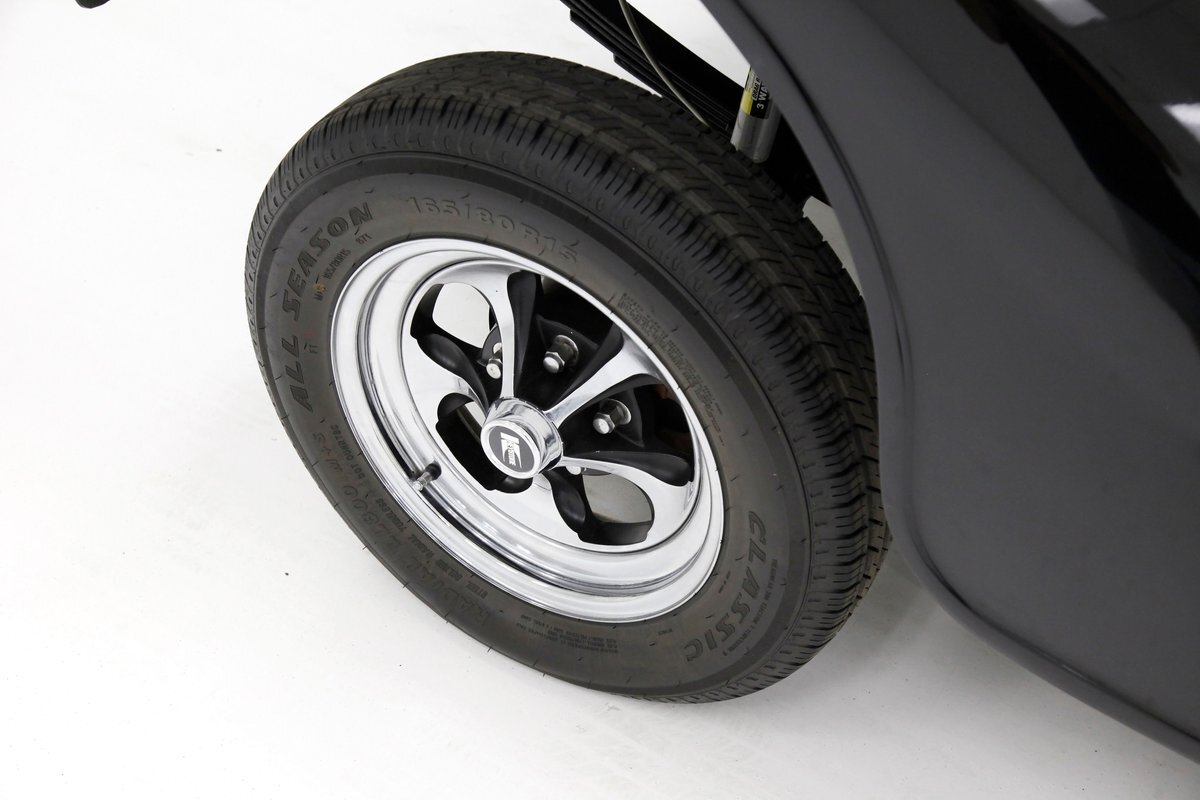 An all steel body that has been uncut and unmodified in any way. The original doors hang straight, the trunk lid opens and closes with all even gaps, and the hood side coverings have been removed. The paint is not fresh; however, it presents nicely, and was most likely sprayed with a 2-stage system. The brilliant black color shows small imperfections in the form of chips, scuffs and scratches when inspected closely, however there are absolutely no major dents or rust worth noting, as well as no areas of major body filler being used. Steel fenders and small running boards adorn each side. Chrome and brite work presents very nicely, with little to no flaws. Overall the exterior could be improved in minute ways, but there really is nothing worth noting. A matching set of big and little 15" Keystone Klassic wheels are attached.